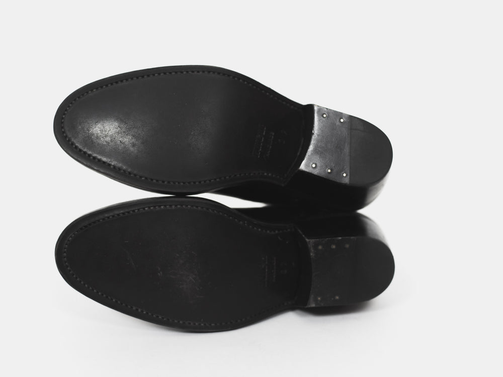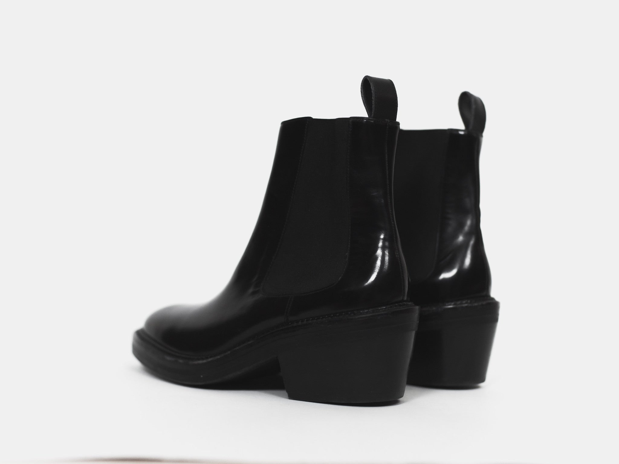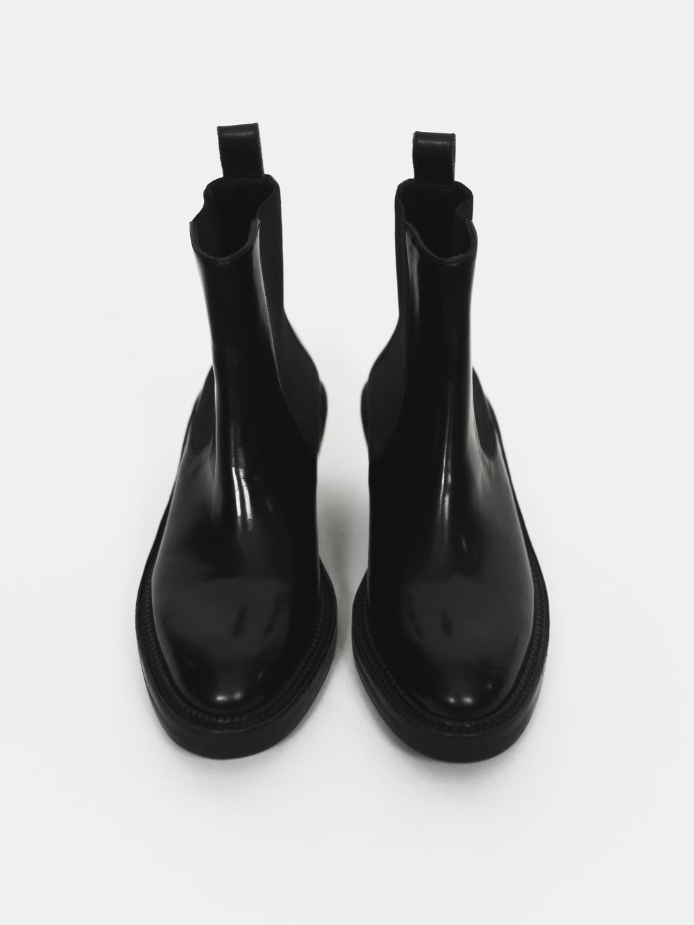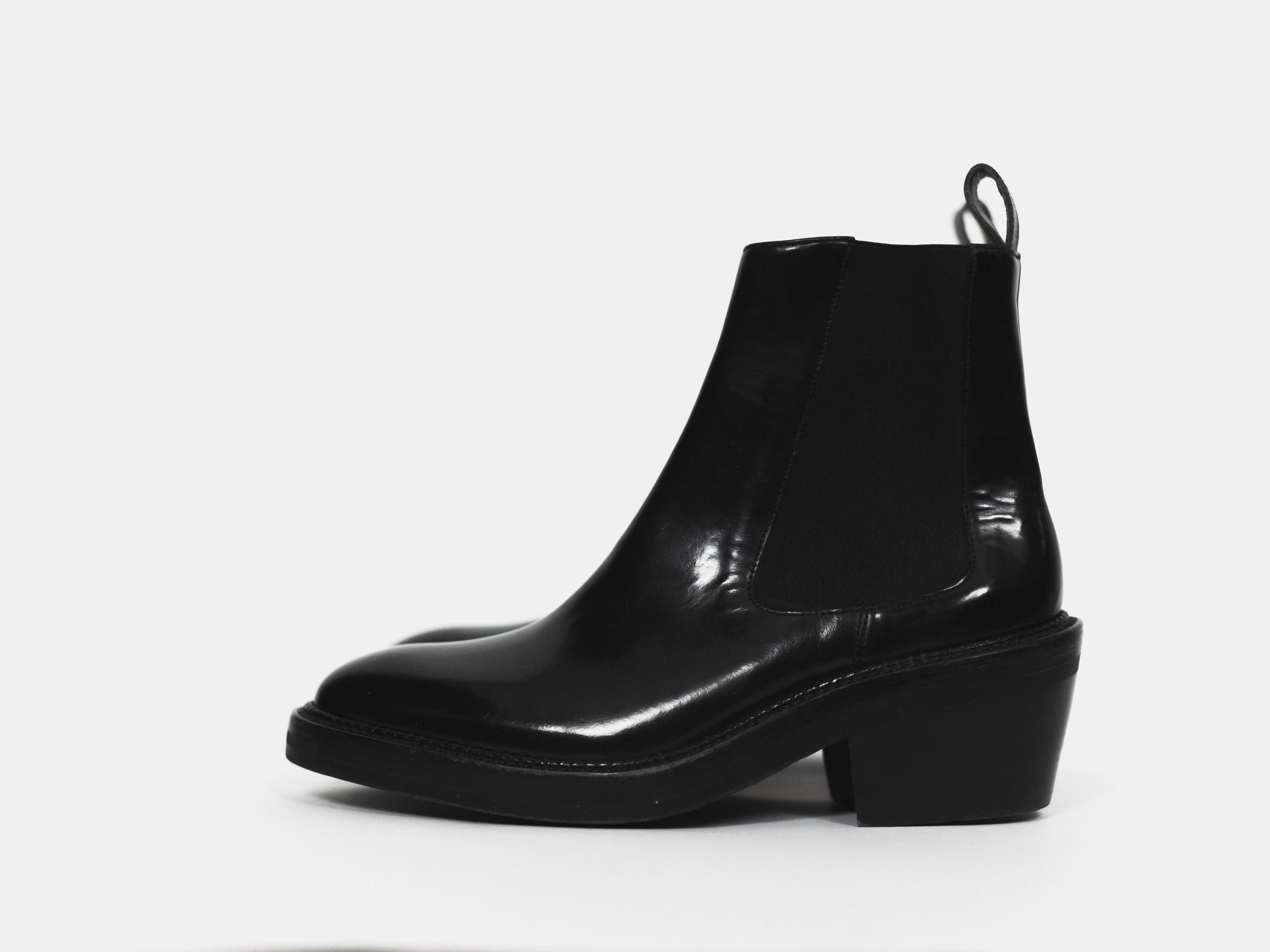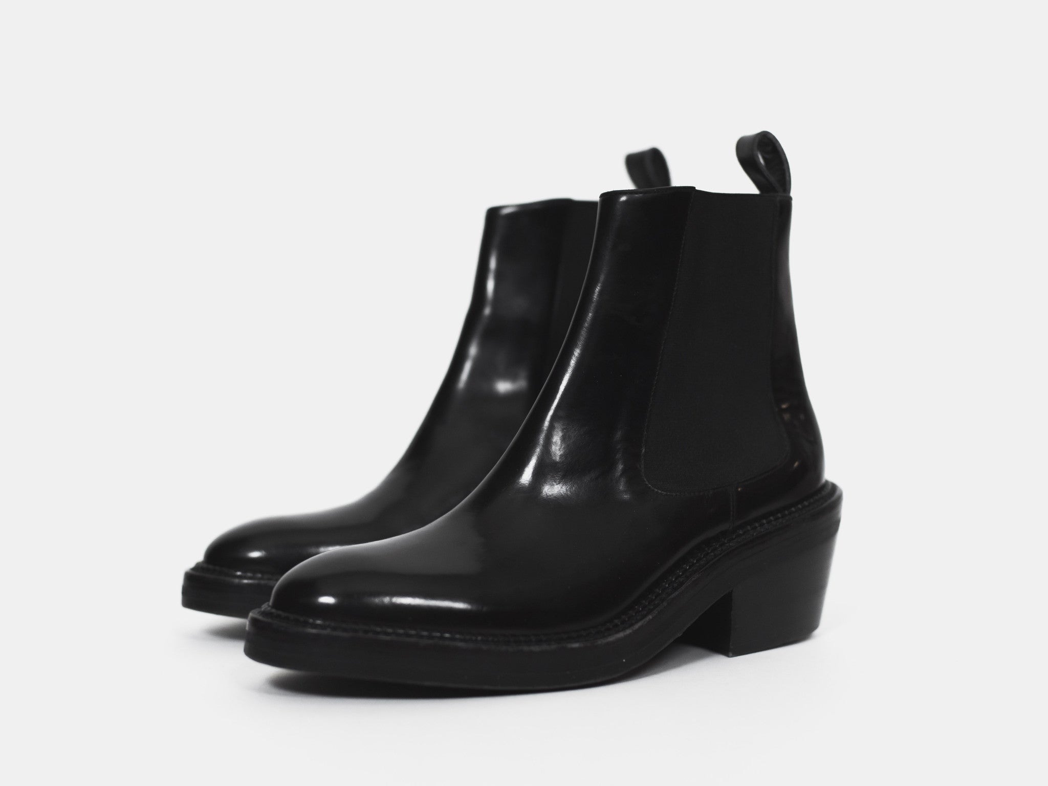 Beautiful pair of patent finish chelsea boots with a chunky last and leather soles.