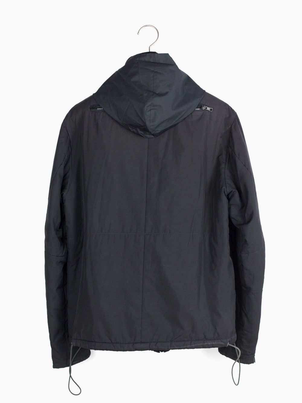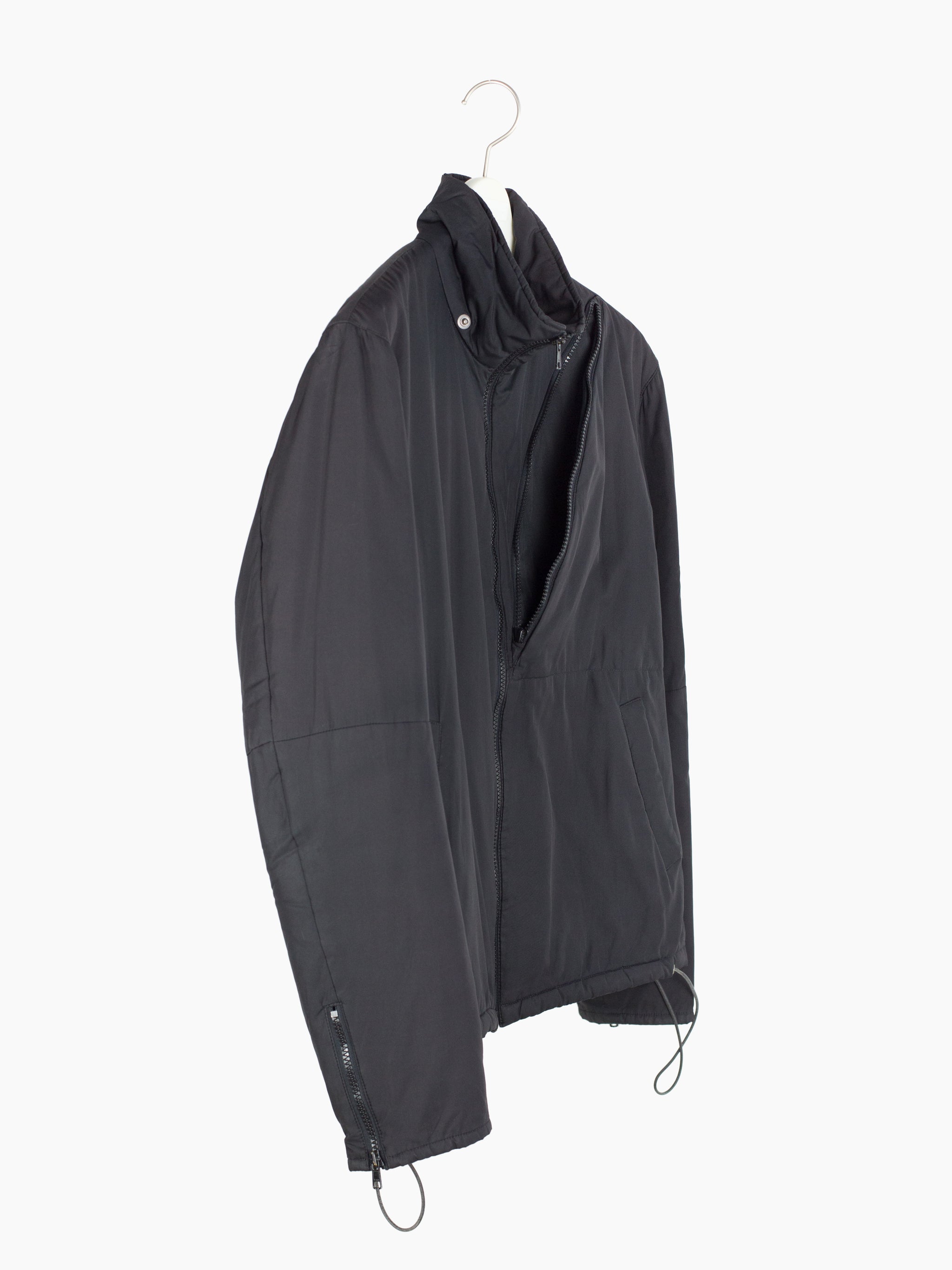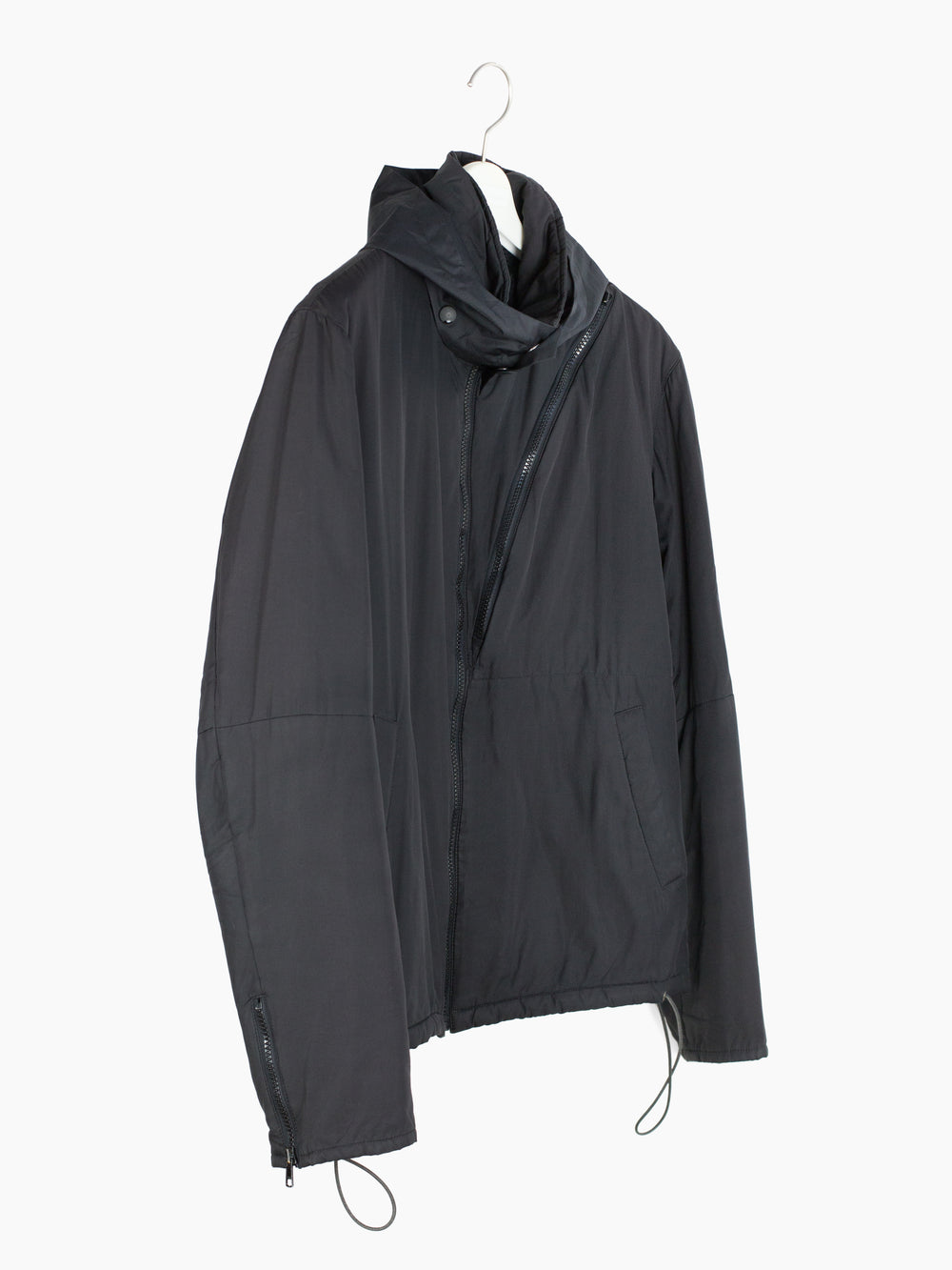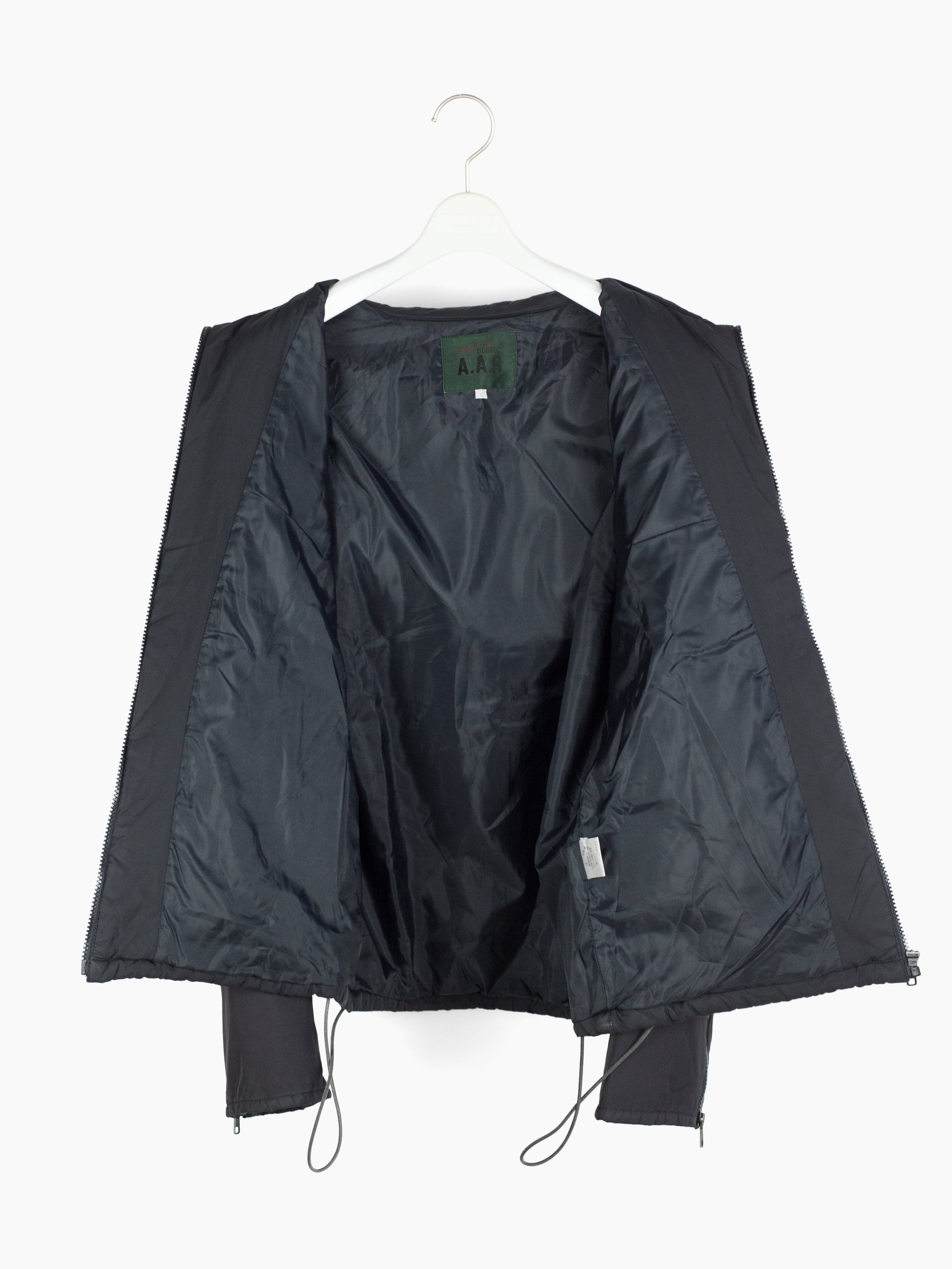Lightly insulated technical blouson from Yohji Yamamoto's functional youth-focused subline D'Urban A.A.R. This one features an angled statement chest zipper that opens to a cavernous pocket spanning the whole of the wearer's upper left chest. A horizontal zippered compartment at the upper back serves as additional storage and a place for a deployable hood that snaps into the collar. Sleeves are composed of multiple panels, segmented at the elbow and angled for a dynamic fit.