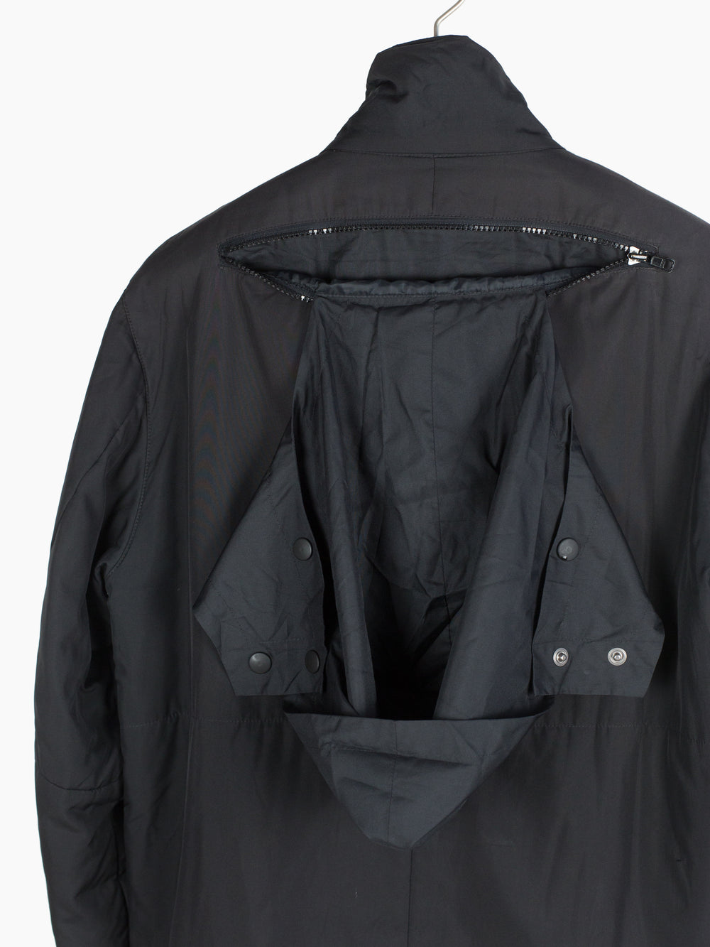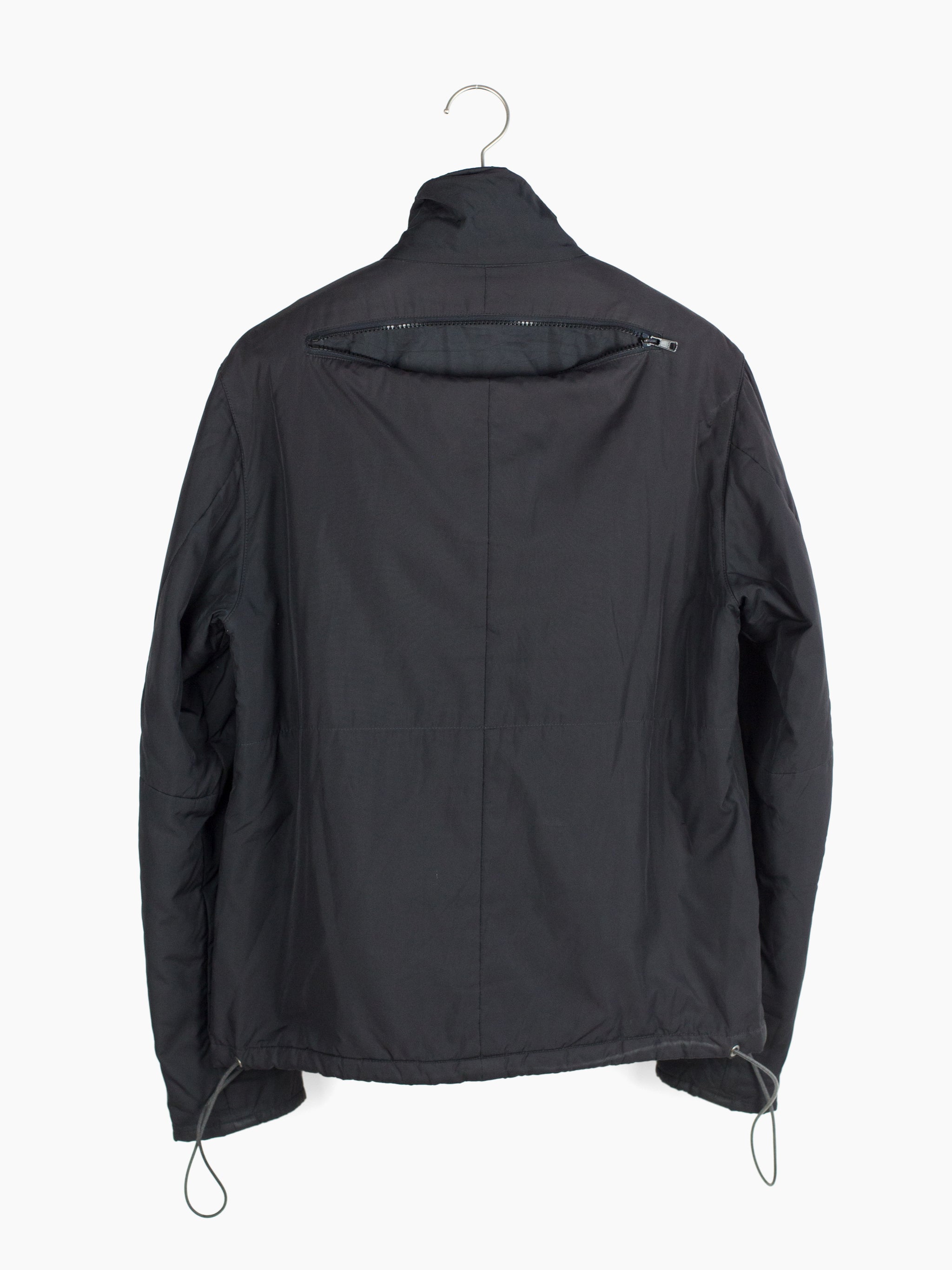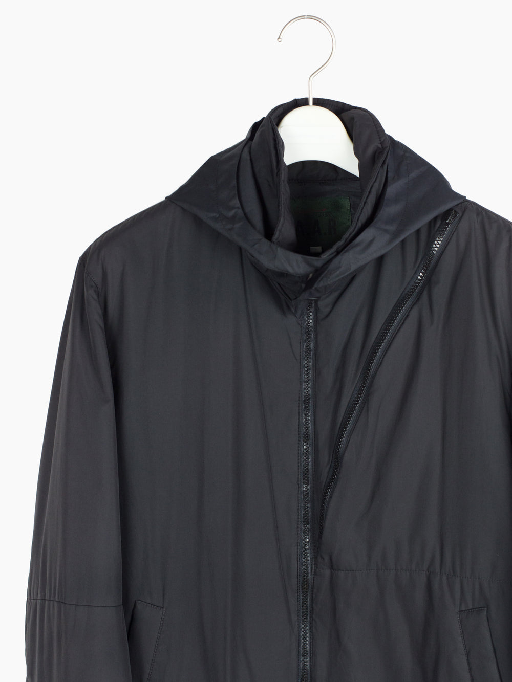 Lightly insulated technical blouson from Yohji Yamamoto's functional youth-focused subline D'Urban A.A.R. This one features an angled statement chest zipper that opens to a cavernous pocket spanning the whole of the wearer's upper left chest. A horizontal zippered compartment at the upper back serves as additional storage and a place for a deployable hood that snaps into the collar. Sleeves are composed of multiple panels, segmented at the elbow and angled for a dynamic fit.