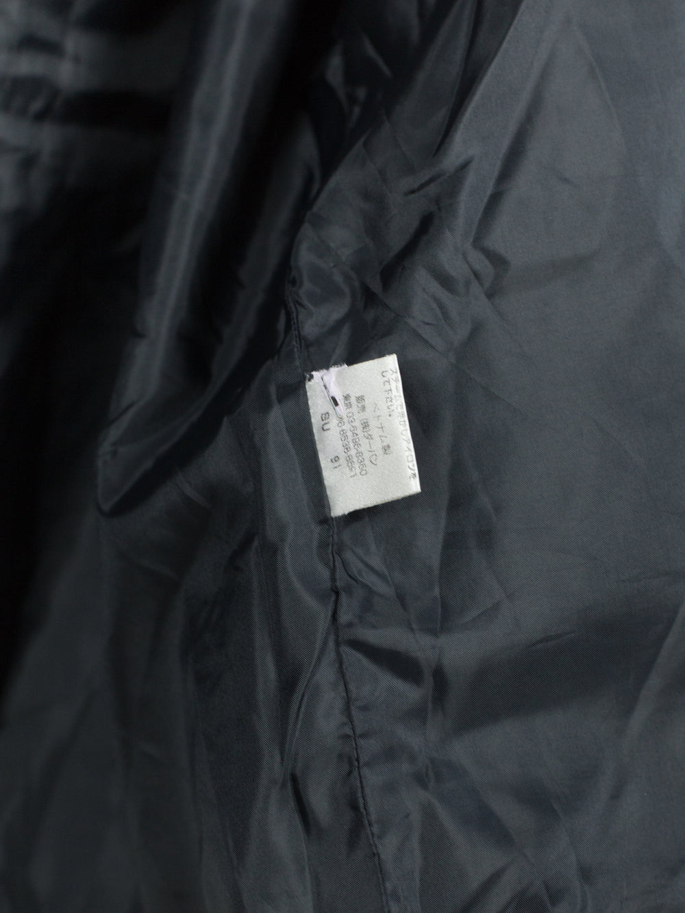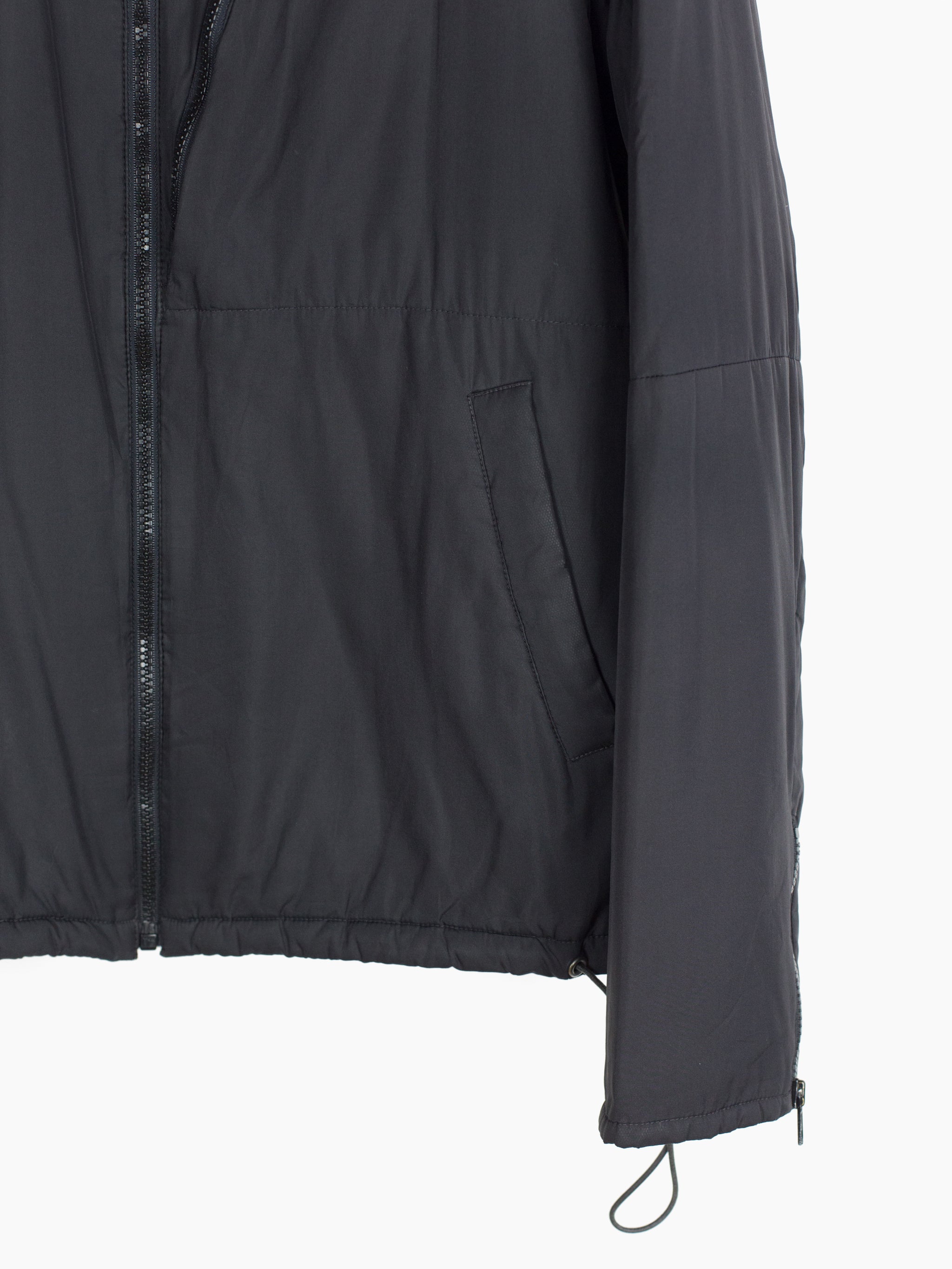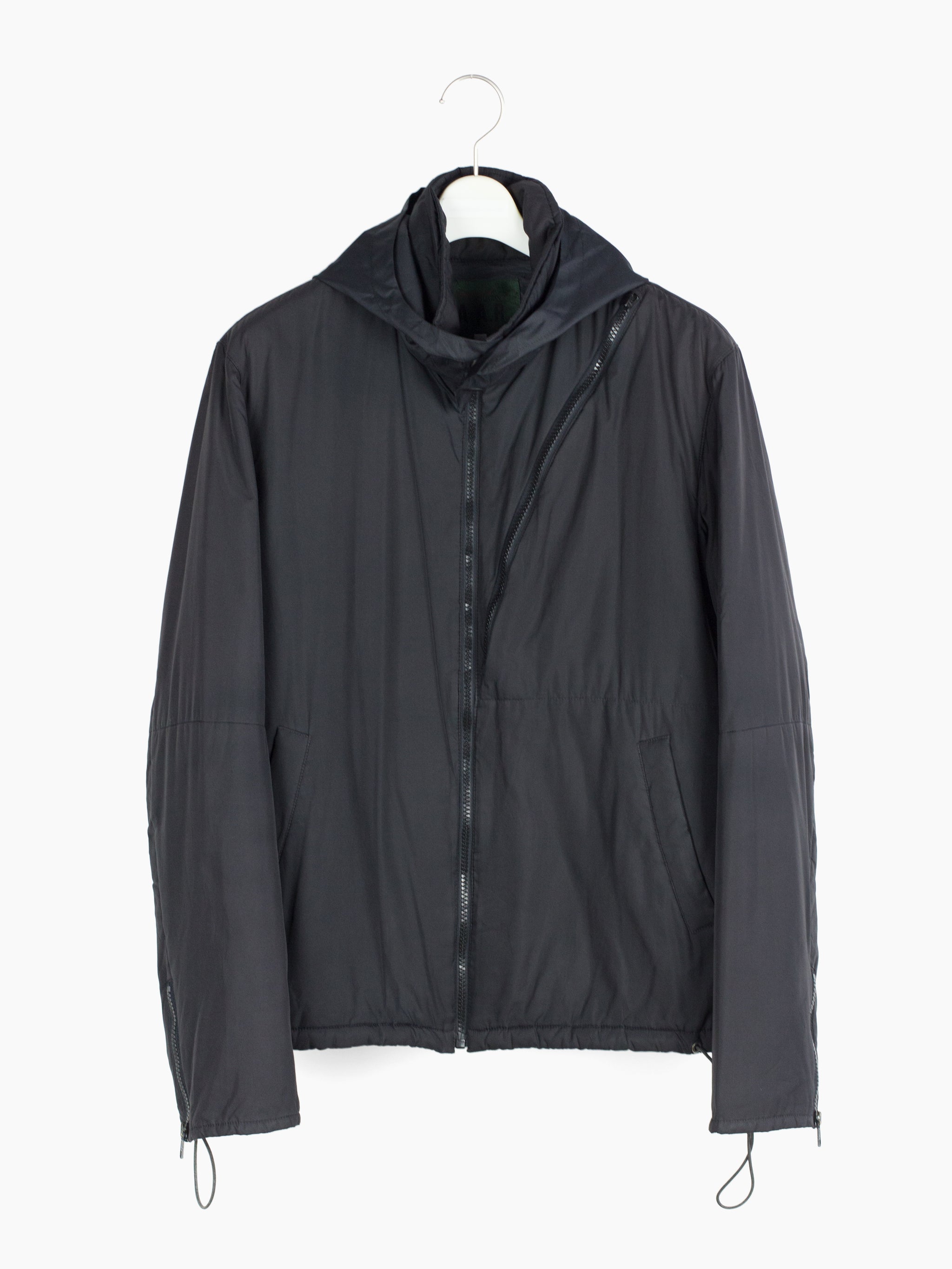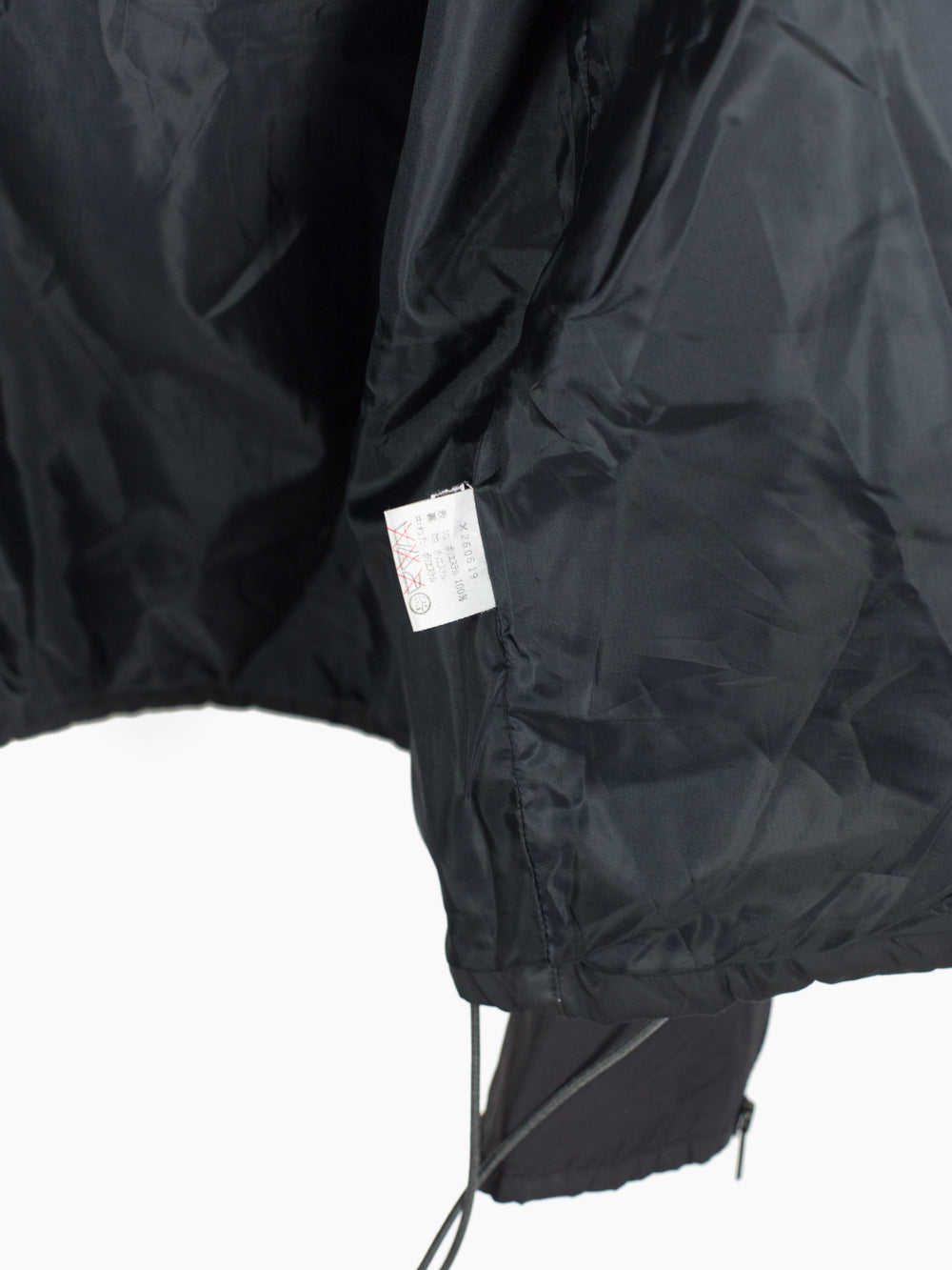 Lightly insulated technical blouson from Yohji Yamamoto's functional youth-focused subline D'Urban A.A.R. This one features an angled statement chest zipper that opens to a cavernous pocket spanning the whole of the wearer's upper left chest. A horizontal zippered compartment at the upper back serves as additional storage and a place for a deployable hood that snaps into the collar. Sleeves are composed of multiple panels, segmented at the elbow and angled for a dynamic fit.