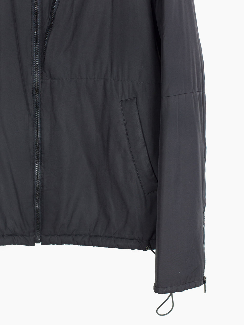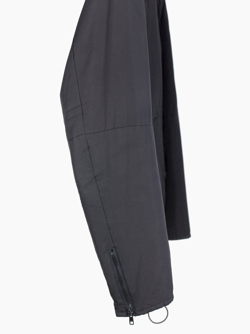 Finished with center front zip closure, two welt waist pockets, shockcord hem and zippered sleeve cuffs.