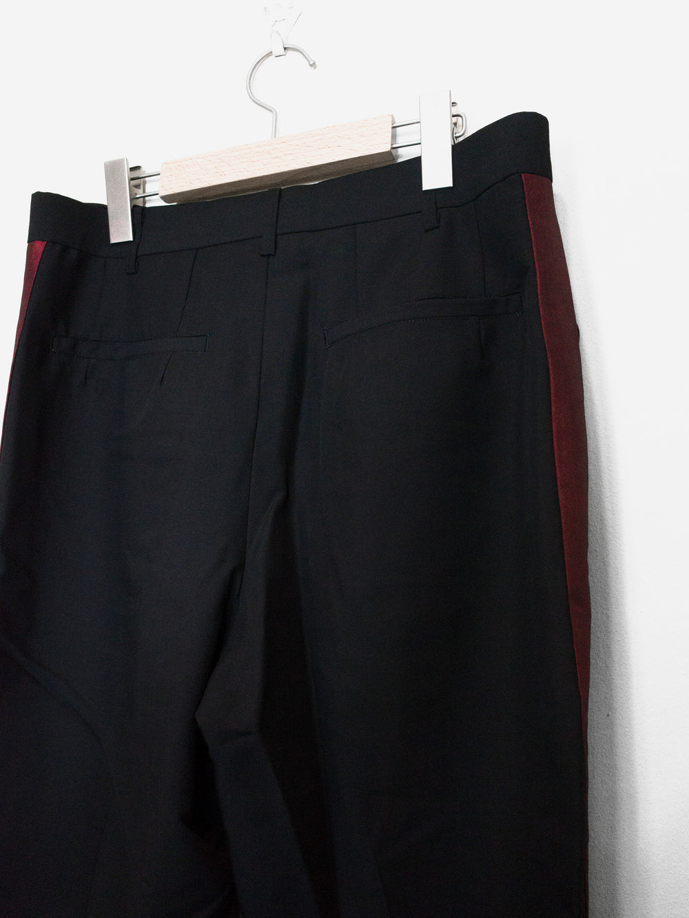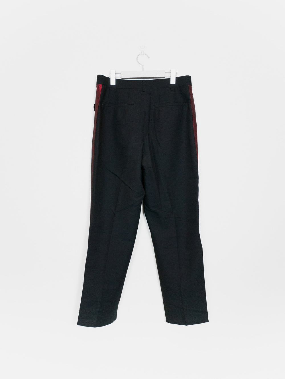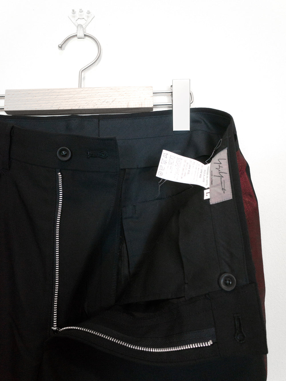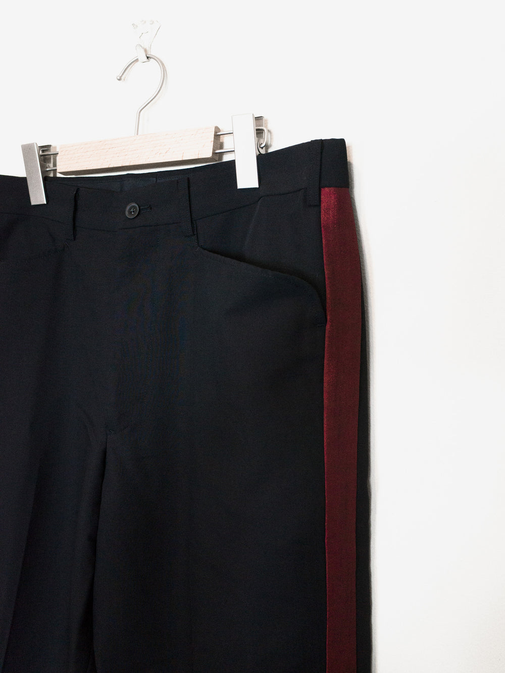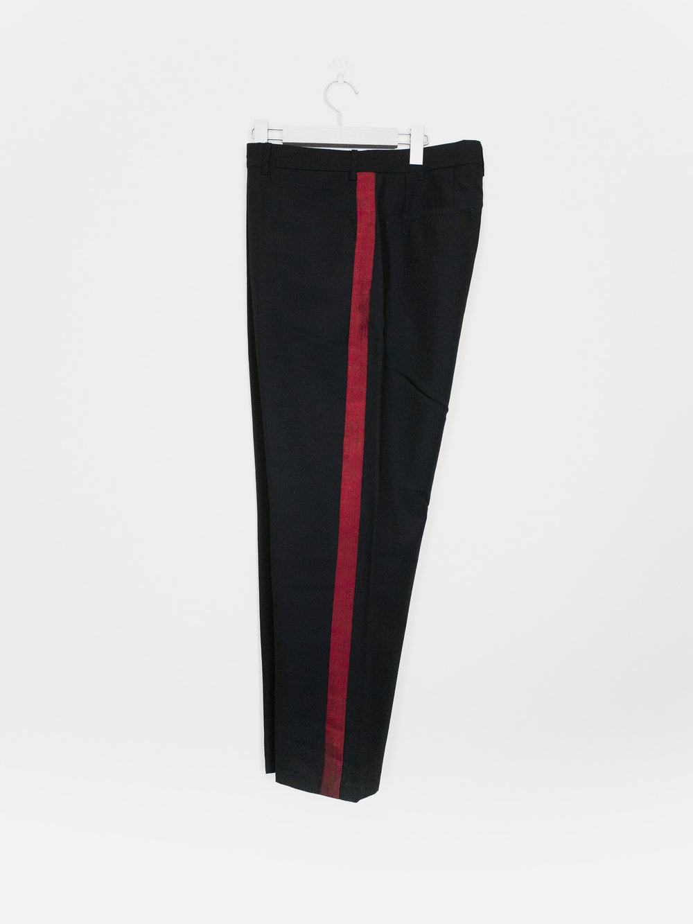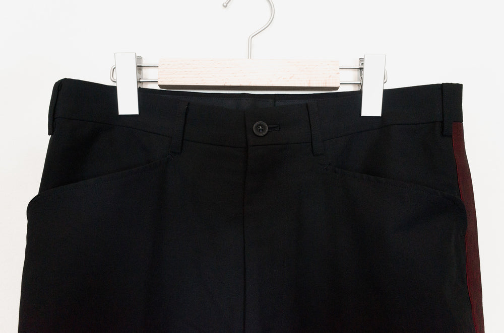 Classic black trousers from Yohji Yamamoto, cut sharp and straight legged in a technical wool/polyester blend face fabric that feels dry, textured, and hard wearing. It features a contrasting bold red stripe down the side of the legs that has an amazing darkening sheen as one moves around in them. This pair of pants illustrates Yohji's playfulness within the confines of menswear conventions, juxtaposing cavernous utilitarian J-pockets with a tuxedo stripe detail and placing the piece in an interestingly ambiguous space between the formal and the casual.