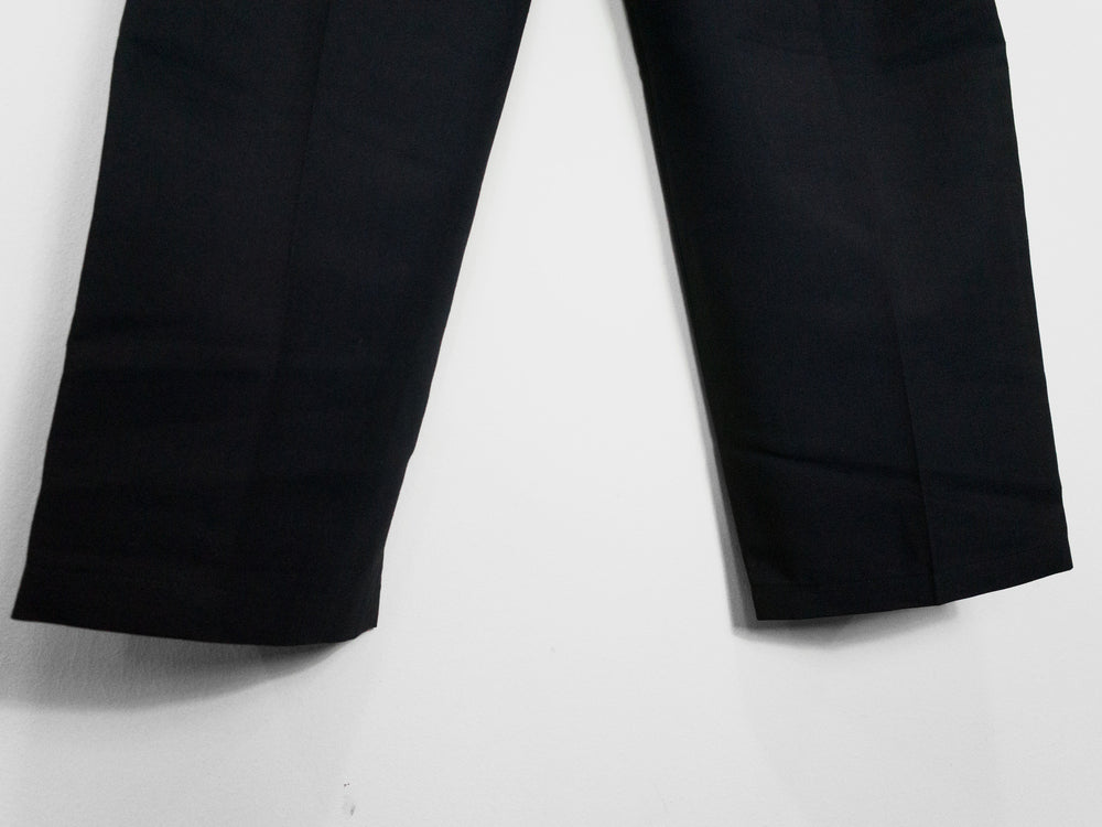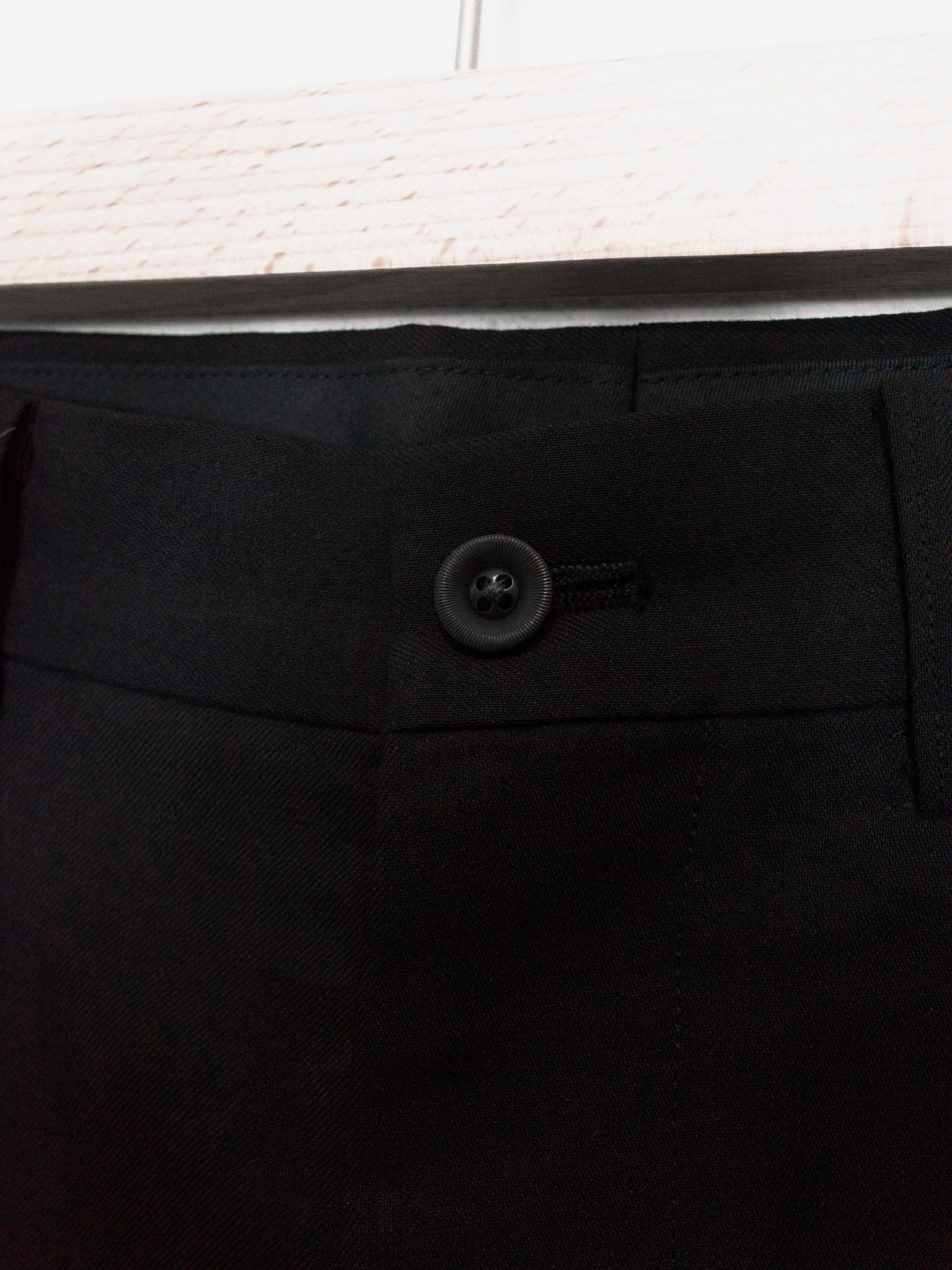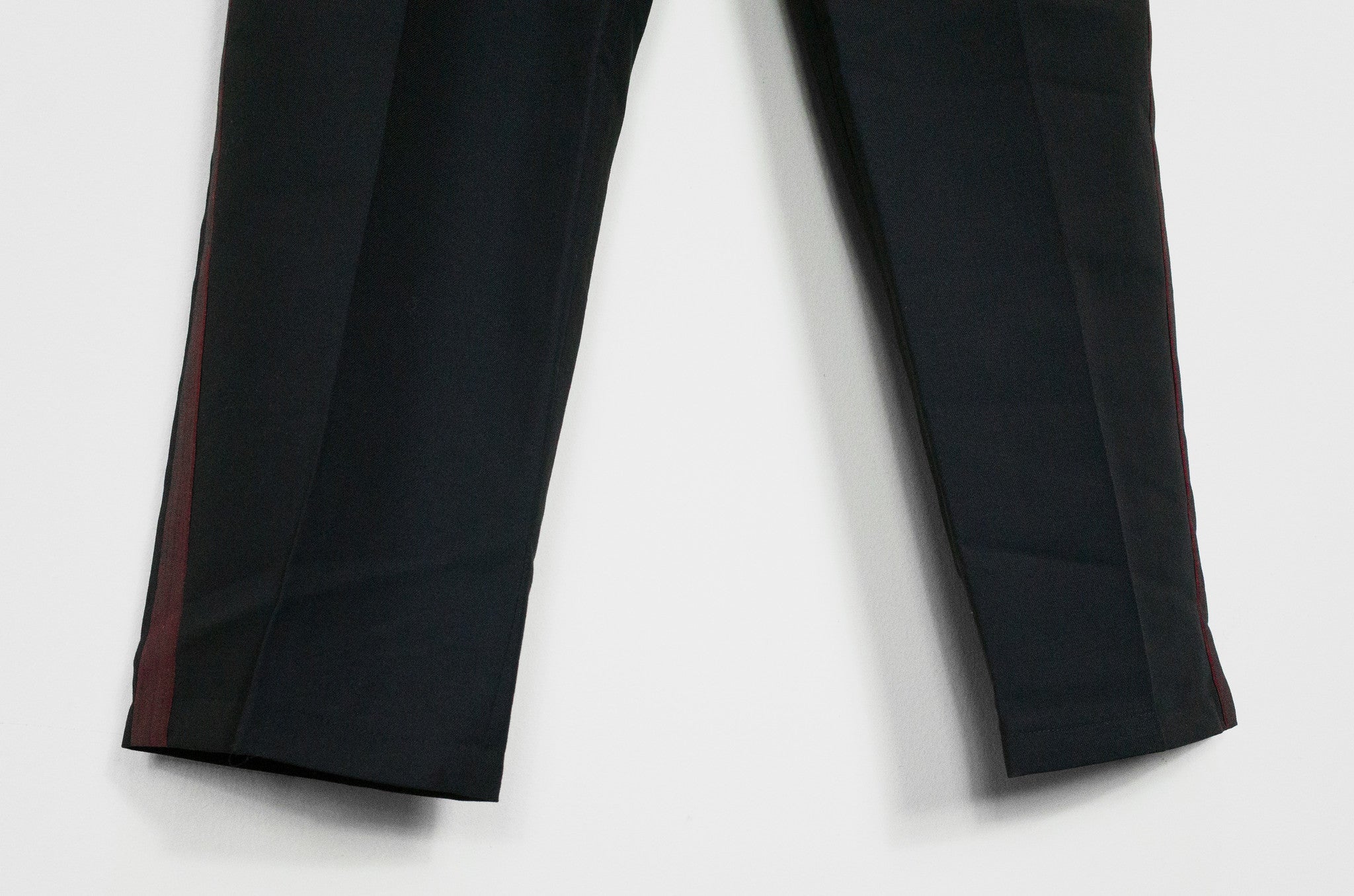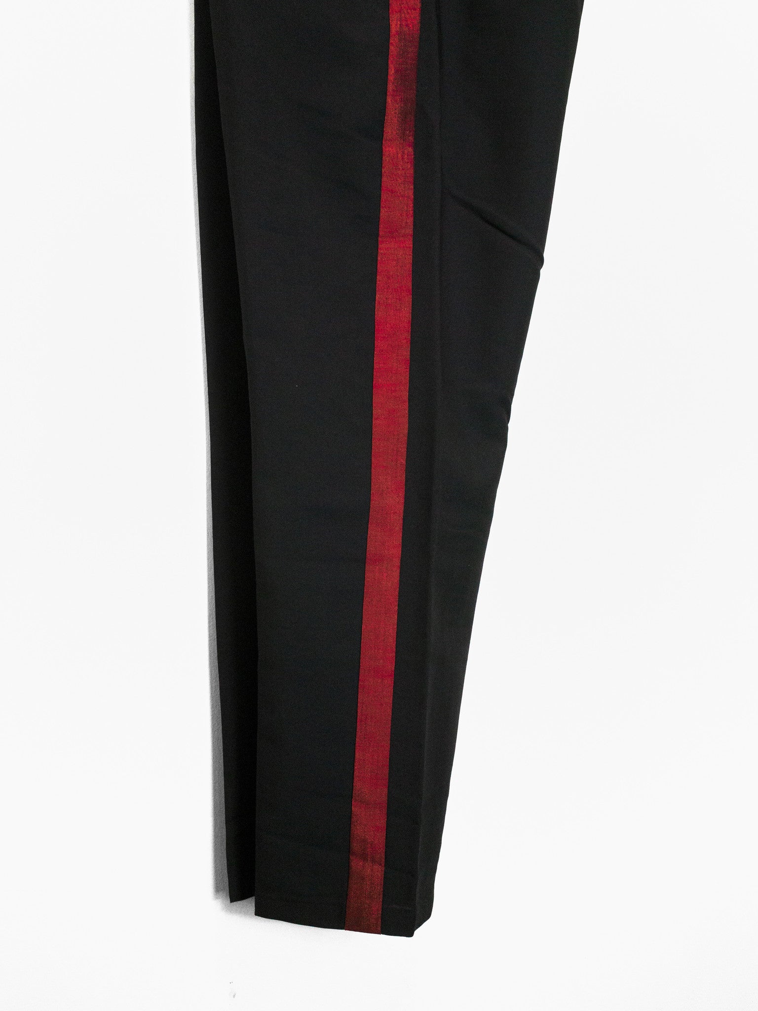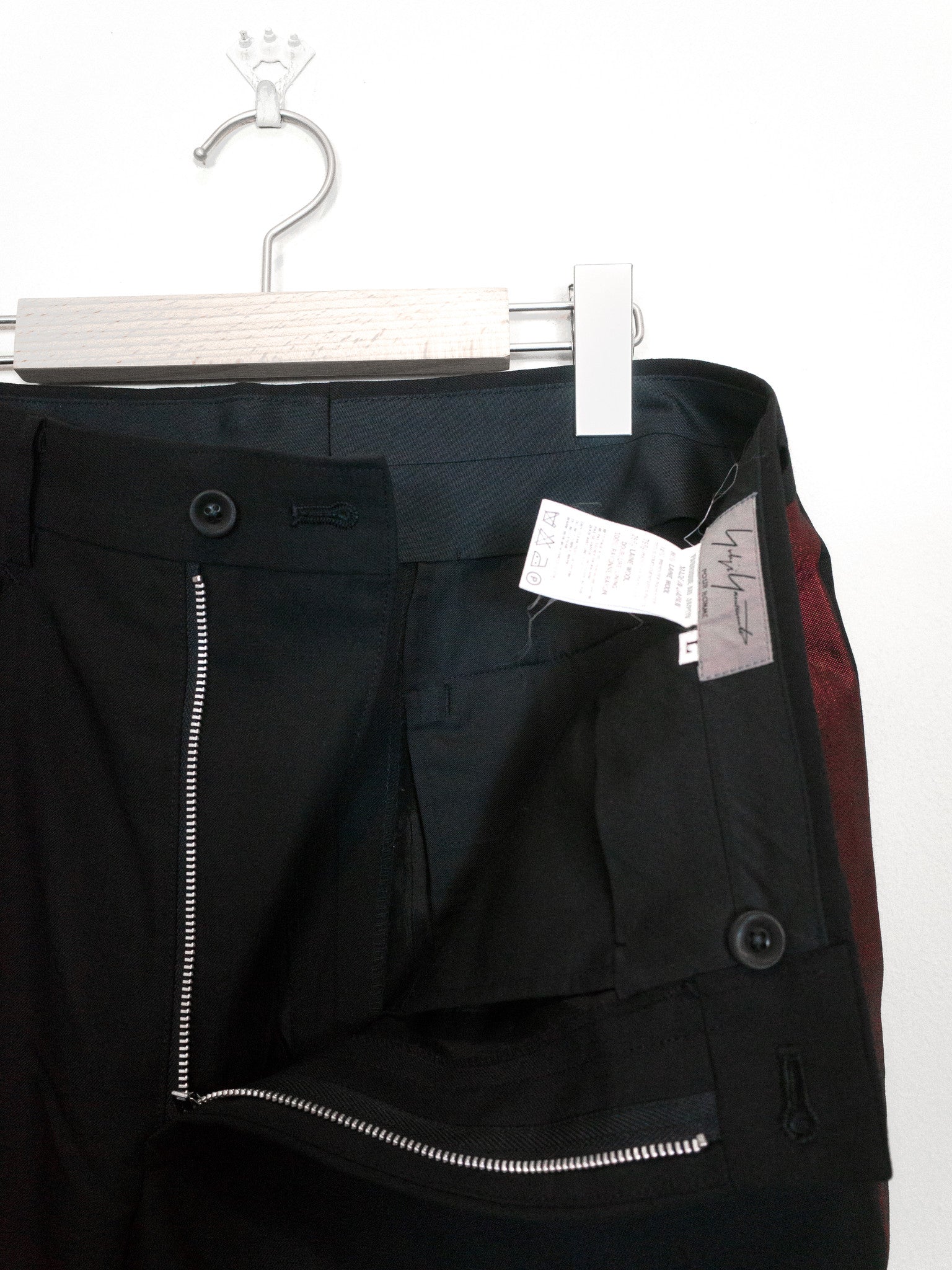 Classic black trousers from Yohji Yamamoto, cut sharp and straight legged in a technical wool/polyester blend face fabric that feels dry, textured, and hard wearing. It features a contrasting bold red stripe down the side of the legs that has an amazing darkening sheen as one moves around in them. This pair of pants illustrates Yohji's playfulness within the confines of menswear conventions, juxtaposing cavernous utilitarian J-pockets with a tuxedo stripe detail and placing the piece in an interestingly ambiguous space between the formal and the casual.