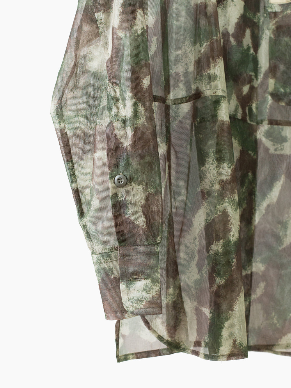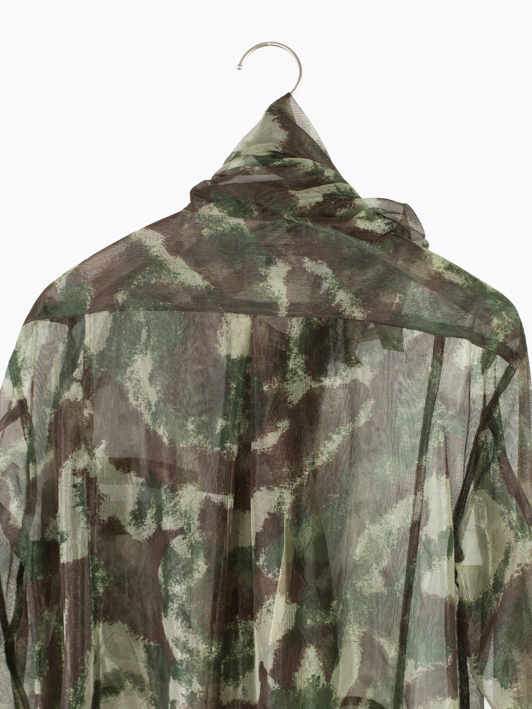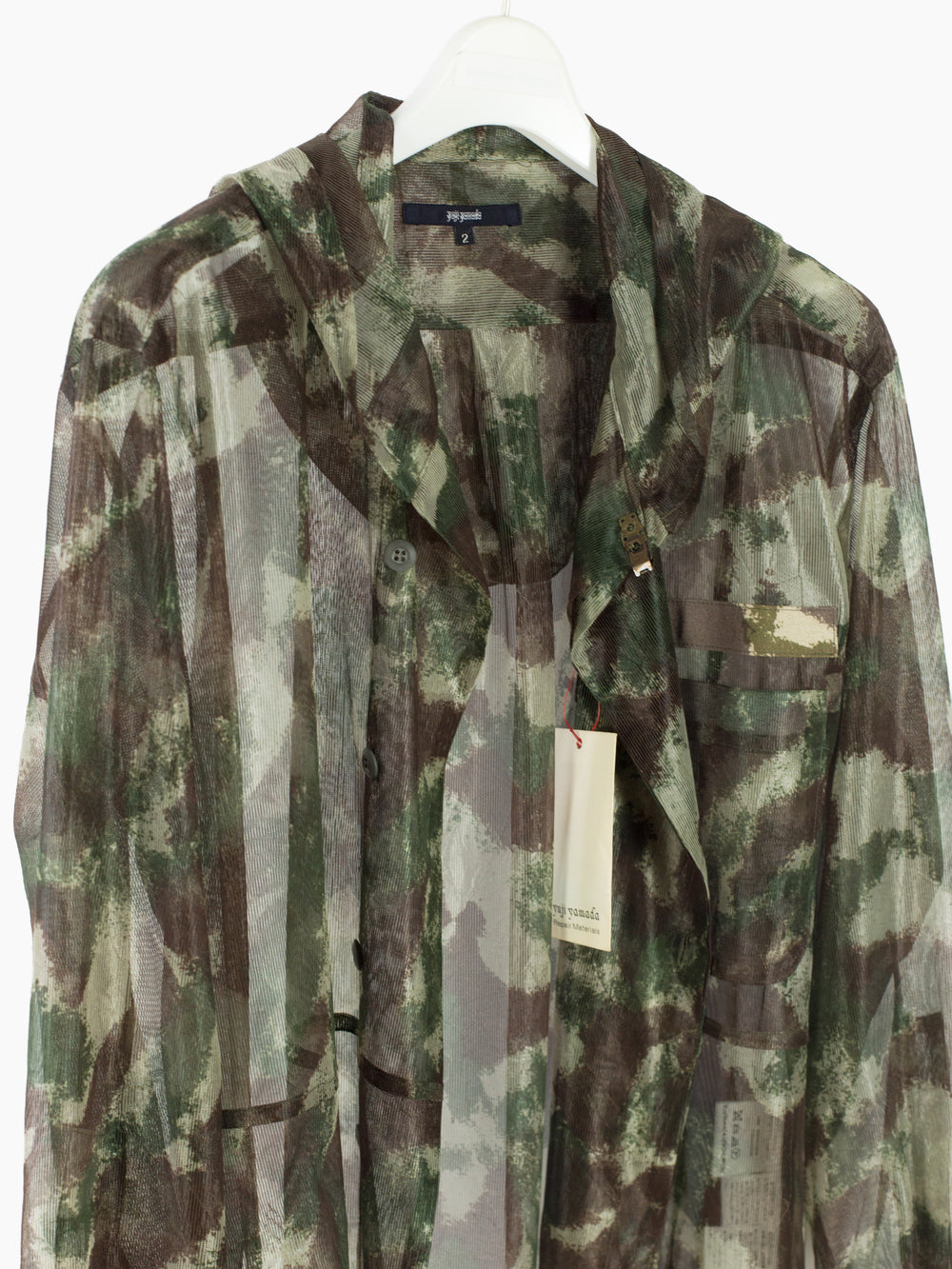 Camo mesh hooded shirt from 90s Japanese brand Yuji Yamada. Features metal clasp neck closure, oversized button off-center front closure that nods to chemical protective shirts with doubled plackets, and single chest pocket at wearer's left.