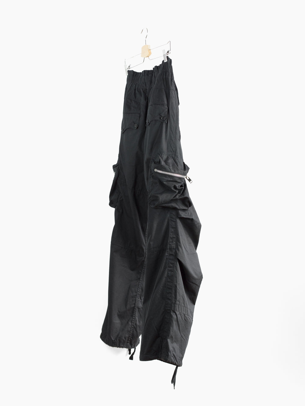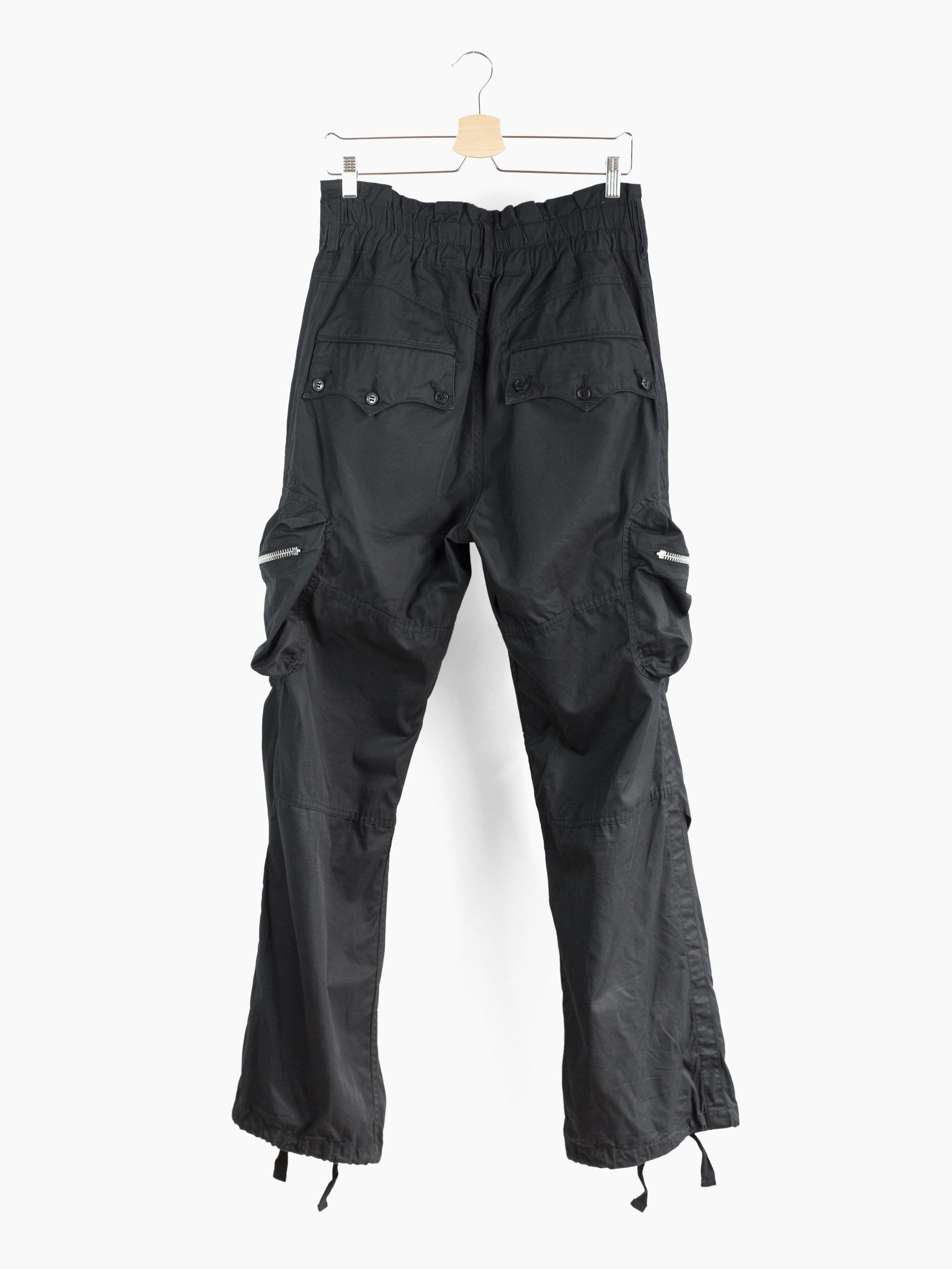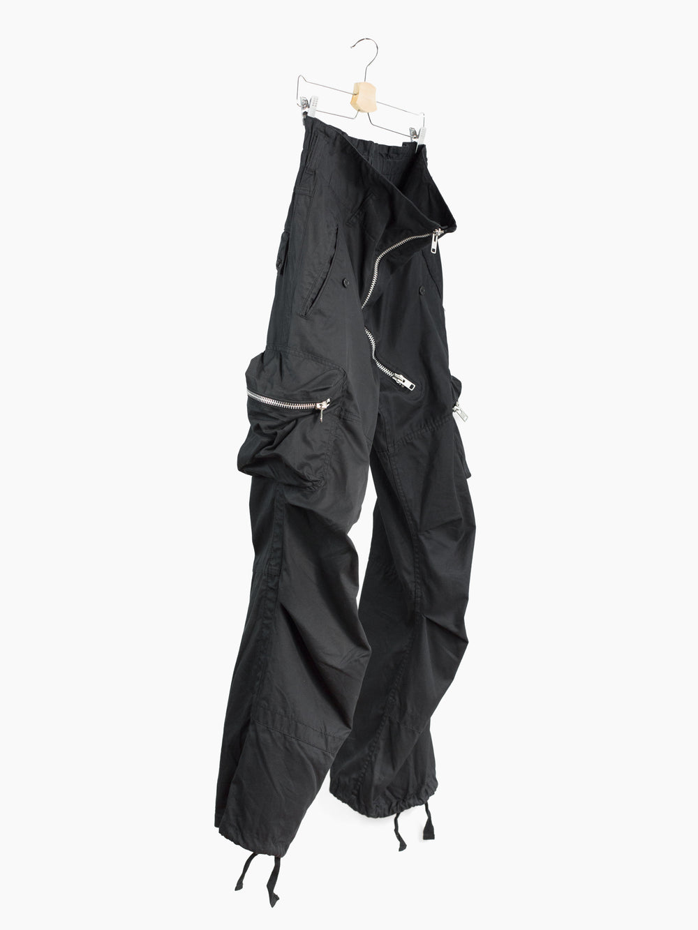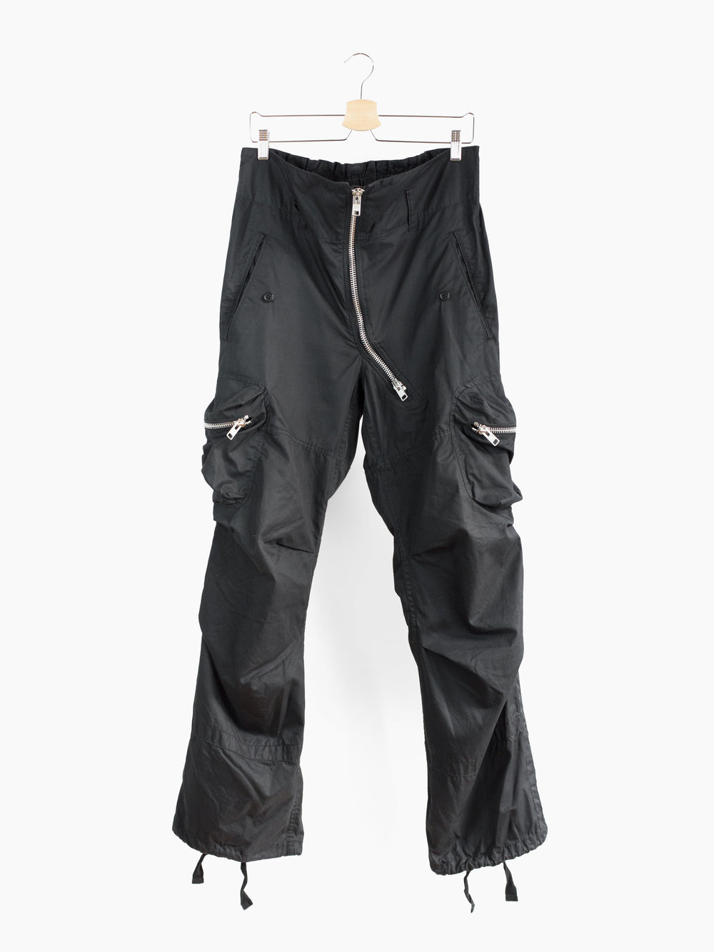 Cargo trousers from 90s-2000s Zucca. Features the brand's signature exposed curved fly, cut here in a chunky silver YKK double zipper. Extended high rise with dropped belt loops and elasticated back waist means the seat can accommodate a wide range of body types. The legs are shaped with dramatically oversized pleats that create volume at the knees and cant the lower legs backwards, creating the appearance of a slight flare. The combination of these constructed elements and the elegantly relaxed straight leg cut result in a silhouette that's both dynamic and flattering. Roomy zipper-closed pockets are placed at the thighs, and feature curved edges and darts, giving them 3 dimensional shape and structure. A close counterpart to Rick Owens’ iconic Pannier cargo pant. Available here cut in a lightweight black cotton gabardine with a soft, slightly structured hand. It’s weight makes it a perfect three season pant with a no-nonsense sleekness