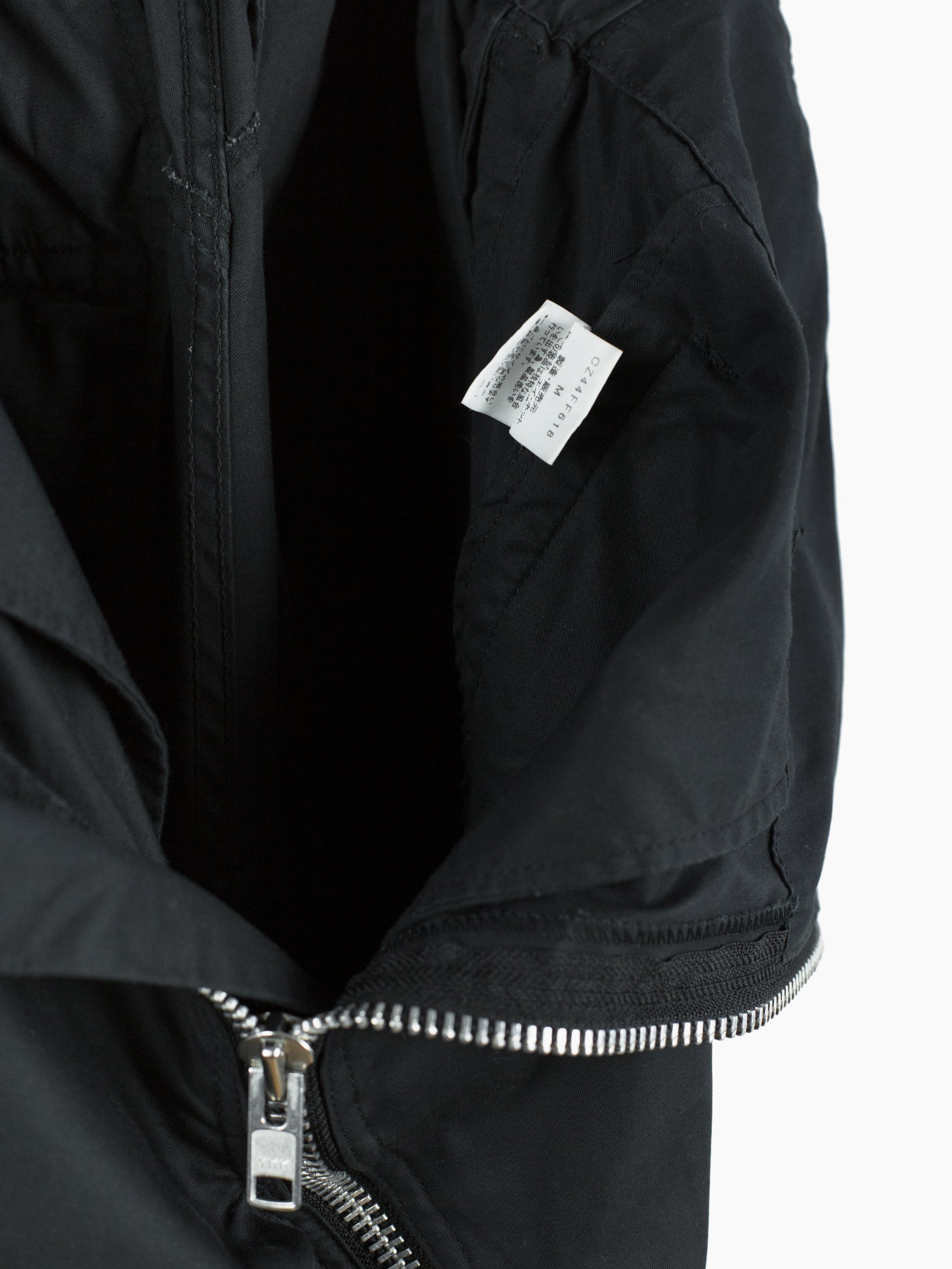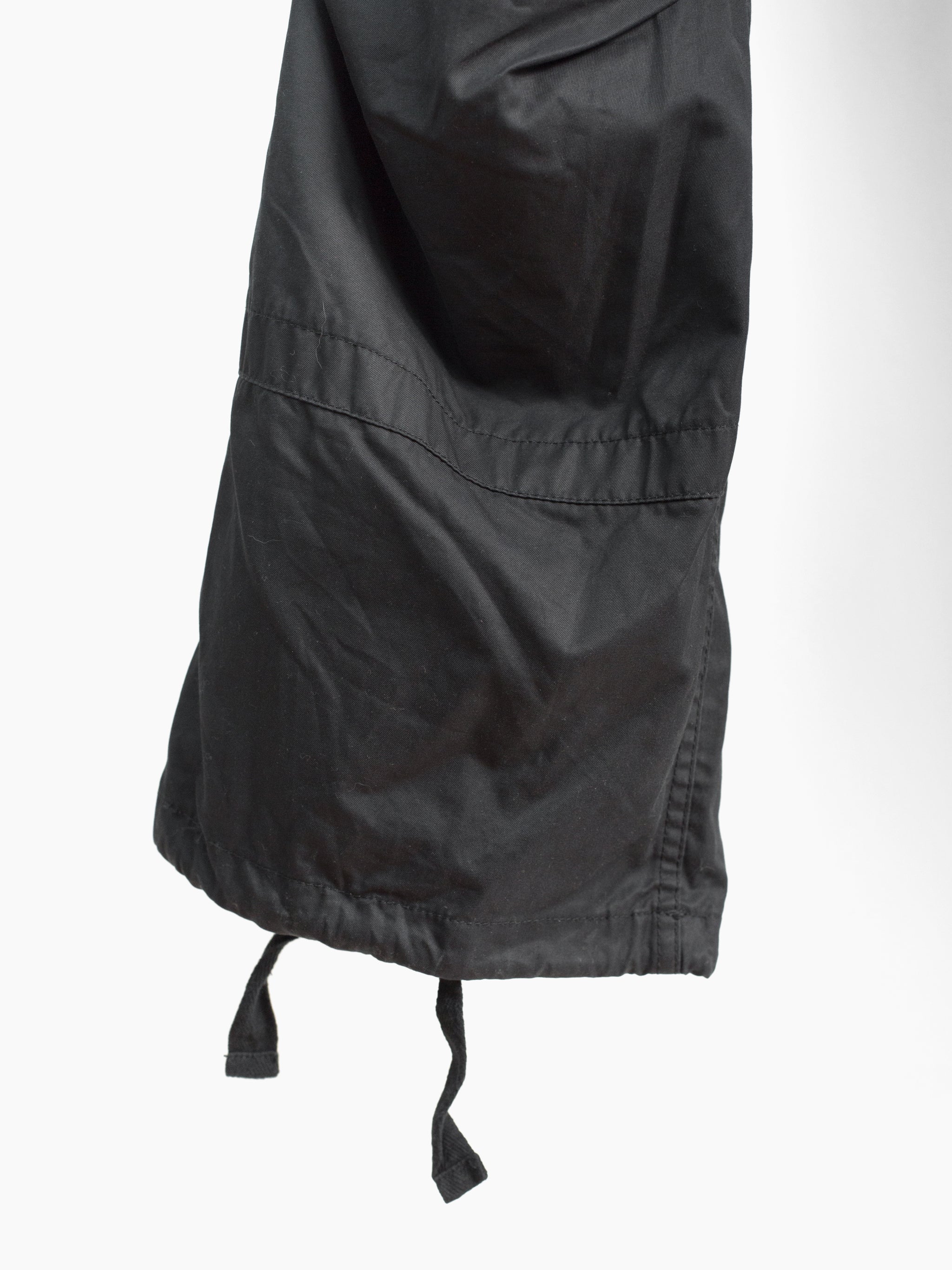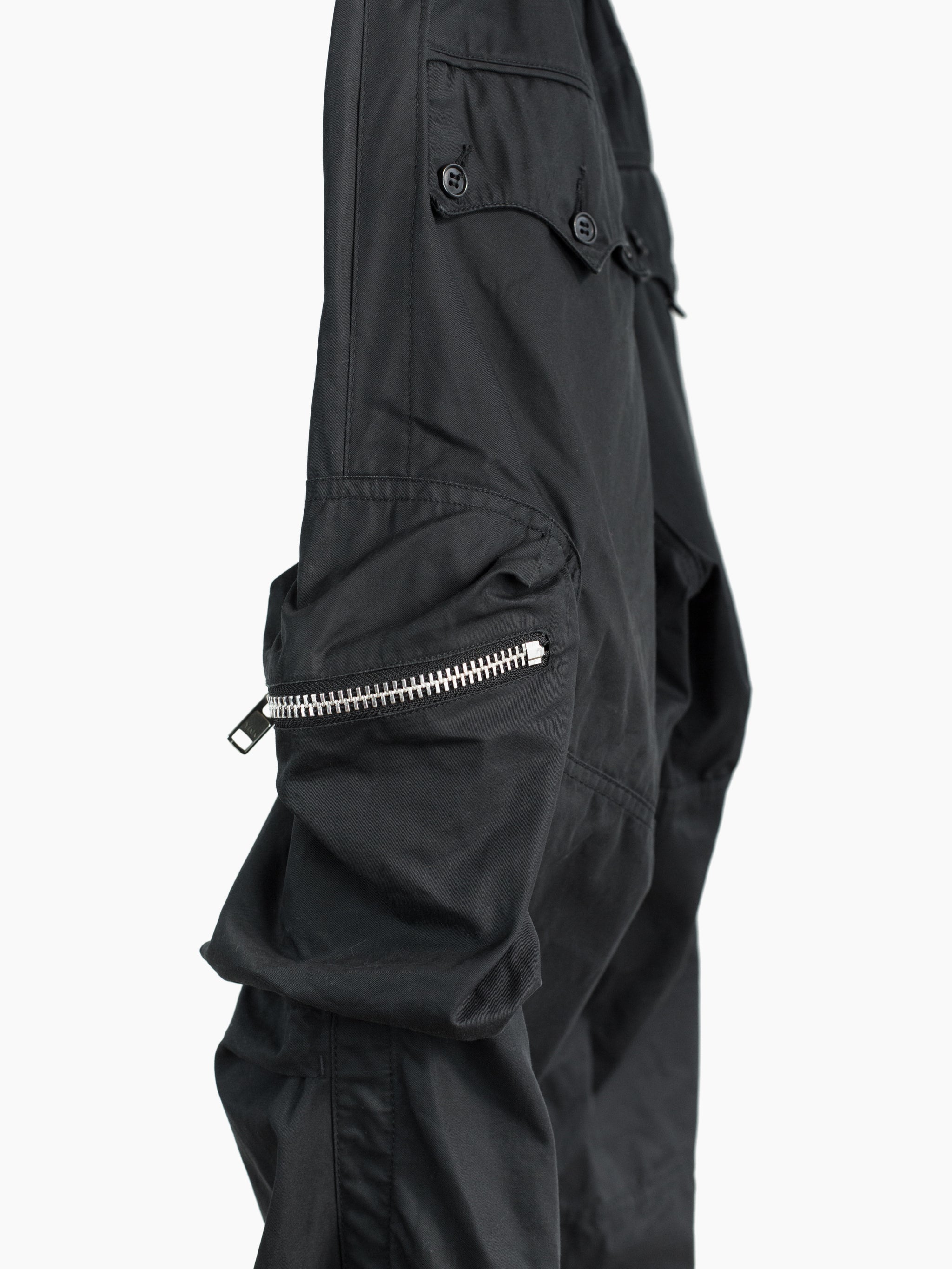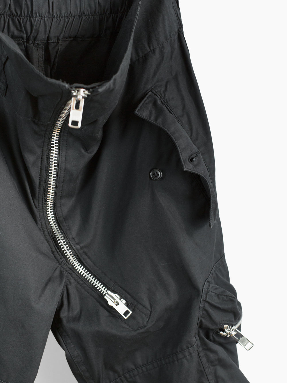 Cargo trousers from 90s-2000s Zucca. Features the brand's signature exposed curved fly, cut here in a chunky silver YKK double zipper. Extended high rise with dropped belt loops and elasticated back waist means the seat can accommodate a wide range of body types. The legs are shaped with dramatically oversized pleats that create volume at the knees and cant the lower legs backwards, creating the appearance of a slight flare. The combination of these constructed elements and the elegantly relaxed straight leg cut result in a silhouette that's both dynamic and flattering. Roomy zipper-closed pockets are placed at the thighs, and feature curved edges and darts, giving them 3 dimensional shape and structure. A close counterpart to Rick Owens’ iconic Pannier cargo pant. Available here cut in a lightweight black cotton gabardine with a soft, slightly structured hand. It’s weight makes it a perfect three season pant with a no-nonsense sleekness