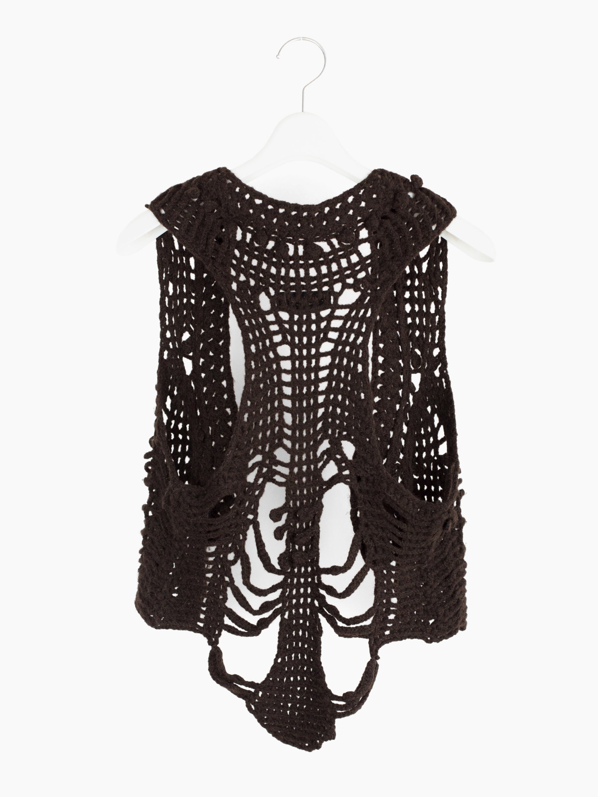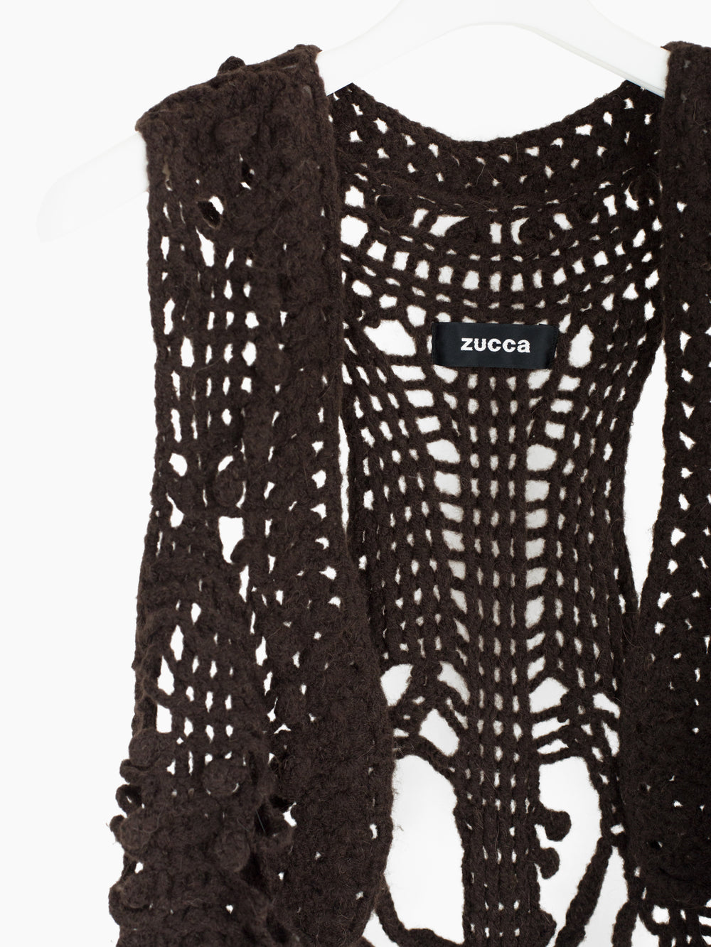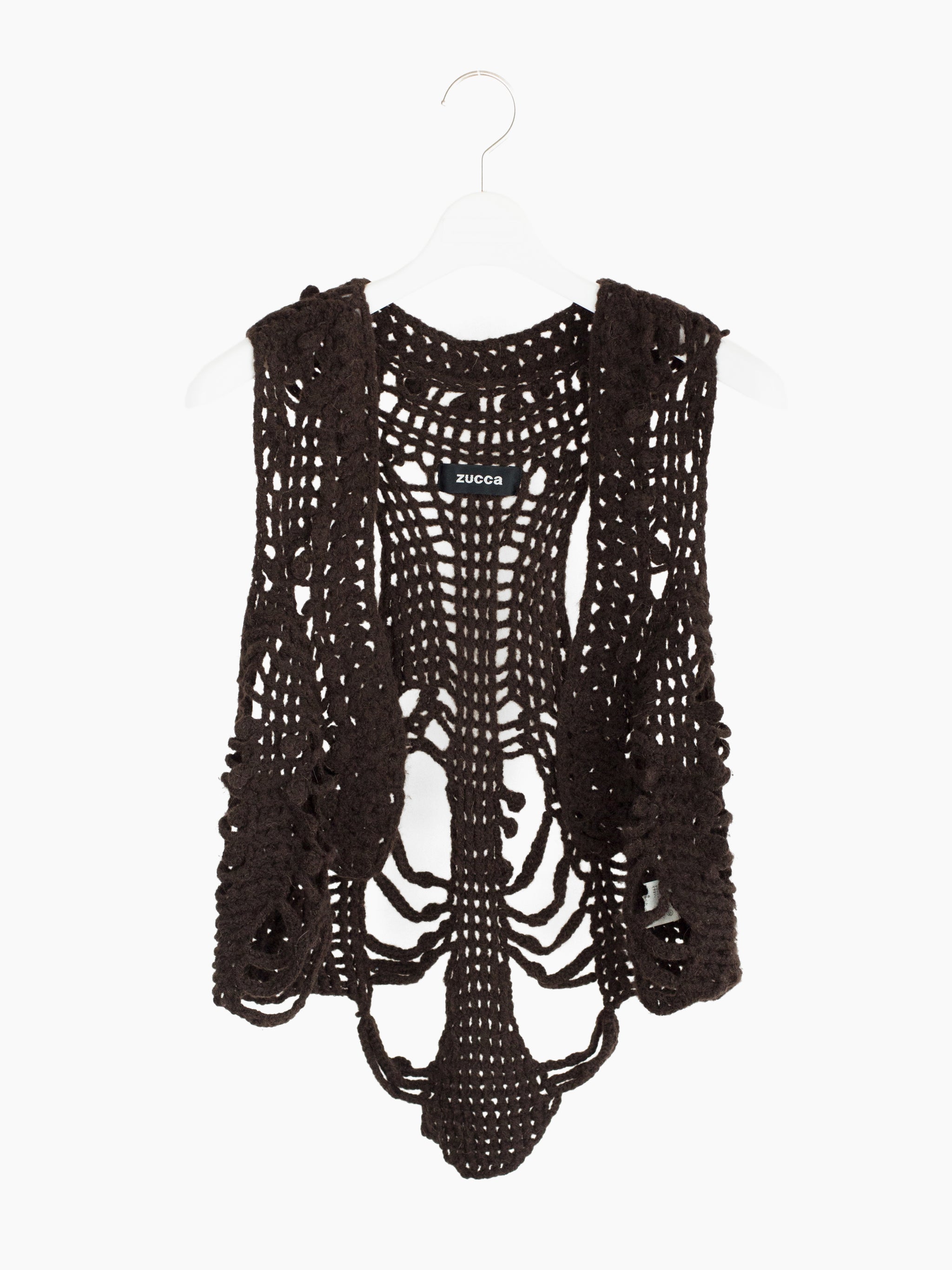 Deconstructed and shredded in its appearance but fully finished and fashioned in its construction, this Zucca holster vest draws on varying gauges to create a spaced, spiderweb effect. It's the perfect midlayer garment to add texture to an outfit.