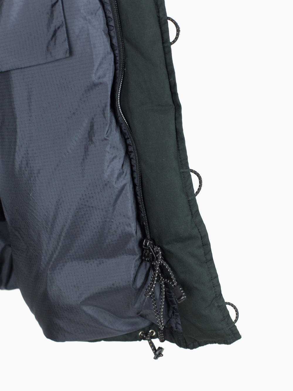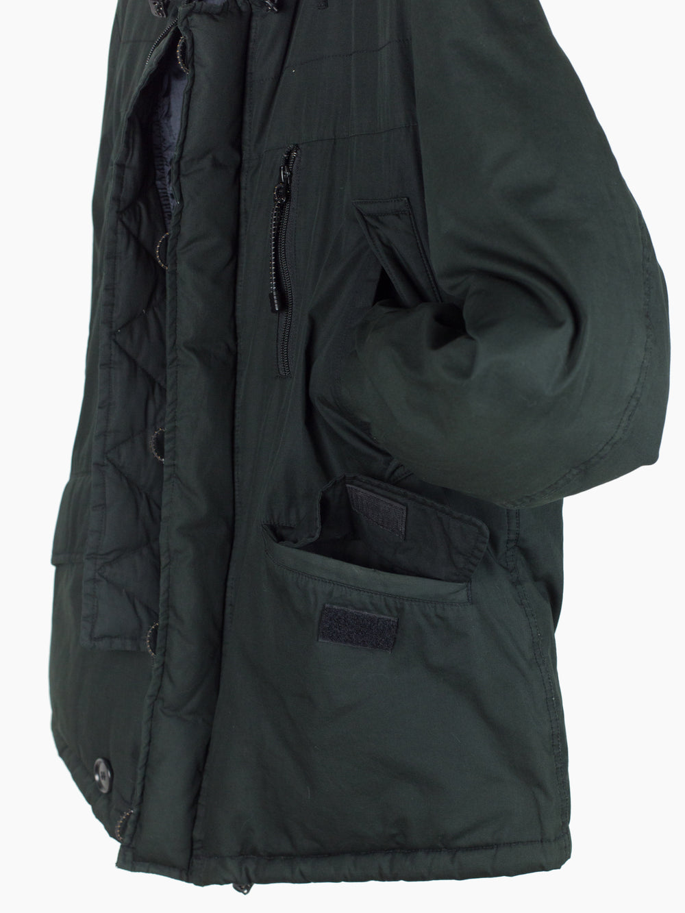 Down Parka from the military-inspired AW03, featuring the season's signature netted collar that conceals a stowable hood outfitted with 3M drawcords. The coat draws inspiration from N3-B parkas with a front zipper closure that's covered with a button wind placket and front high chest pocket + waist level flap-closed drop pocket configuration. A fine, high density cotton face fabric and near-tonal details bring a sense of reserved refinement and everyday wearability.