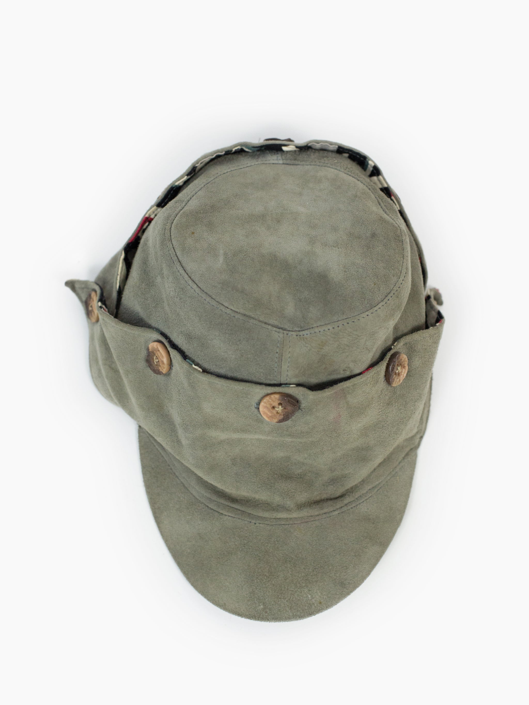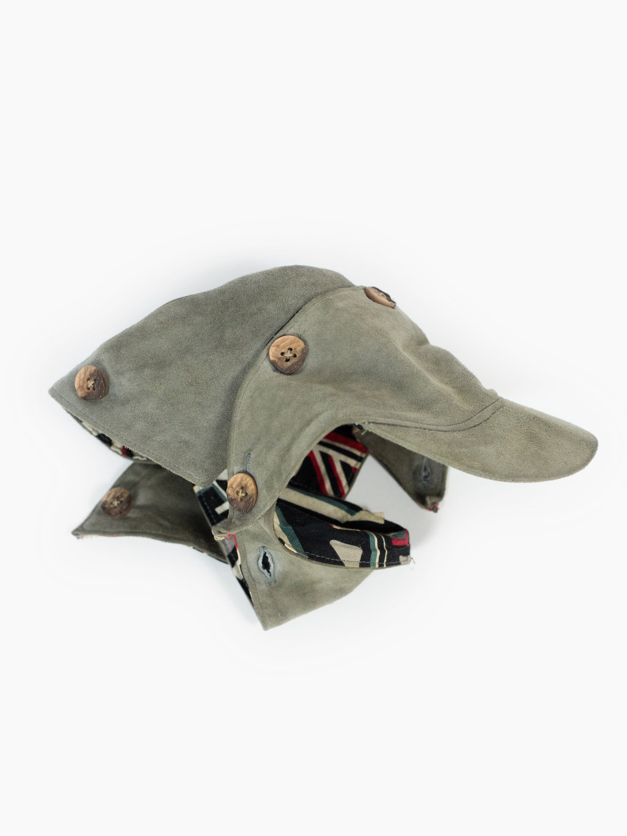 Pigskin suede brimmed cap with three separating parts that fasten via carved buttons.