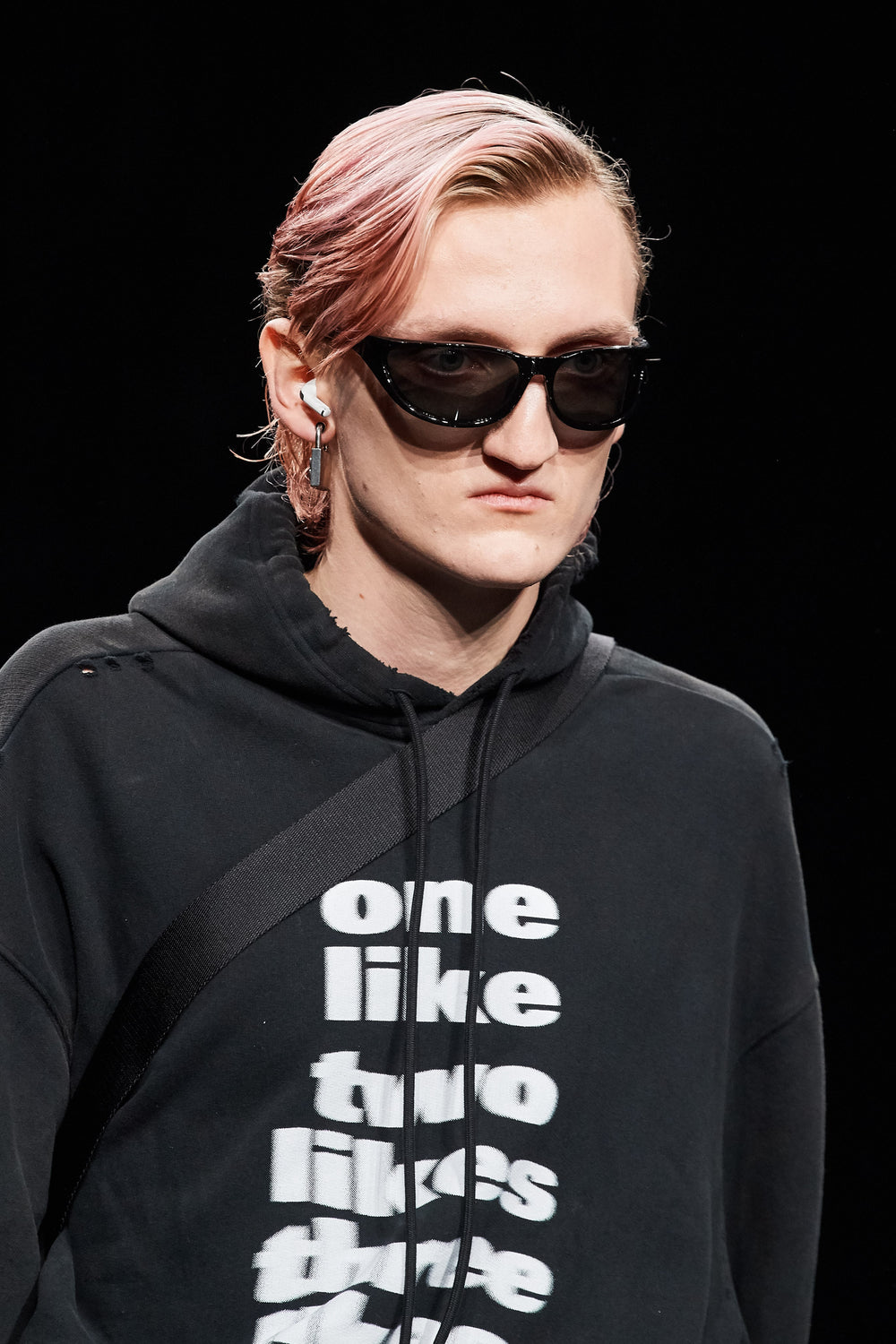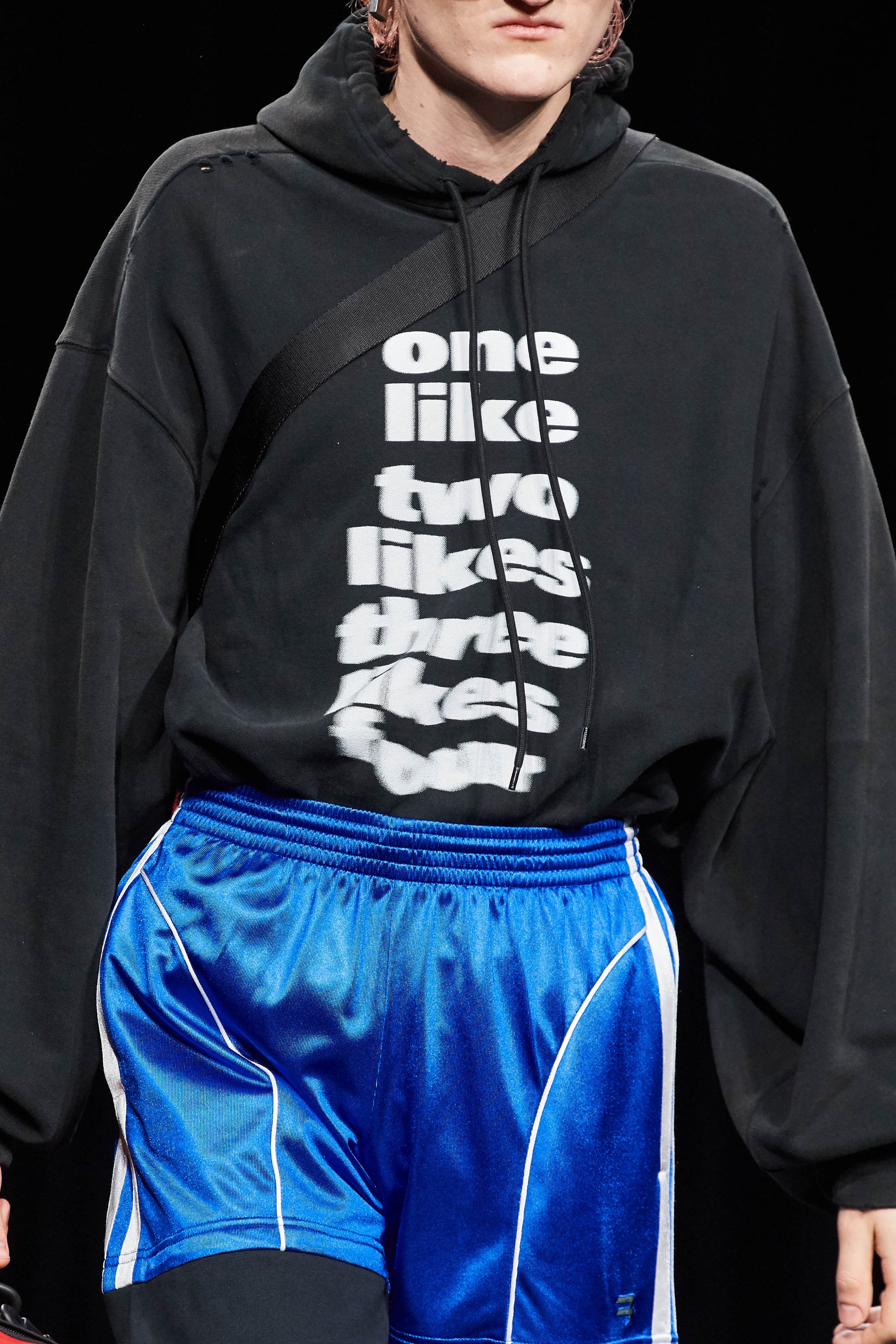 Black 'Bomber' hoodie from runway AW20, featuring an extremely generous low-cut armhole and semi-cropped bloused body to create that 'bomber' style silhouette. Almost batwing-like in construction given the sizeable sleeves. Features signature 'likes' print, done with a trompe l'oeil blurred effect as one reads further down the graphic. Beautiful sun-faded wash brings tones of brown and grey and orange, with hand distressing throughout.