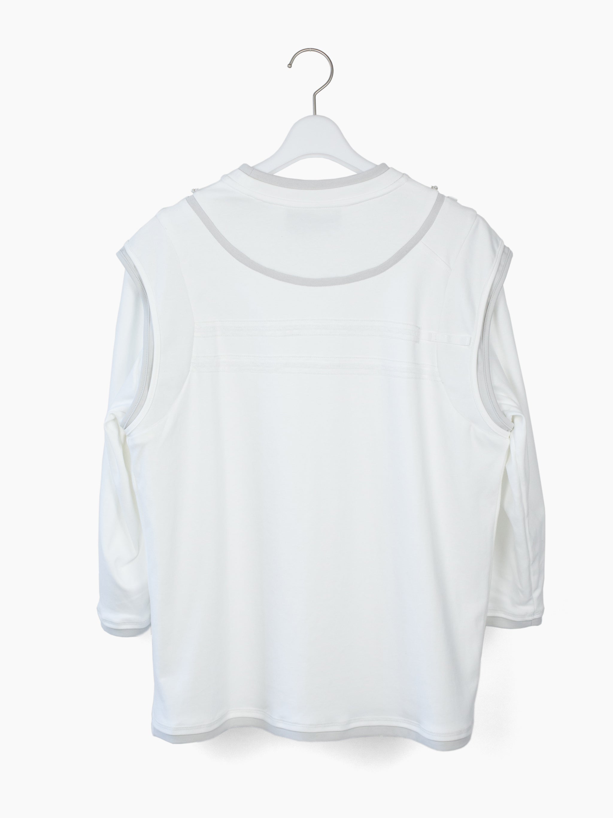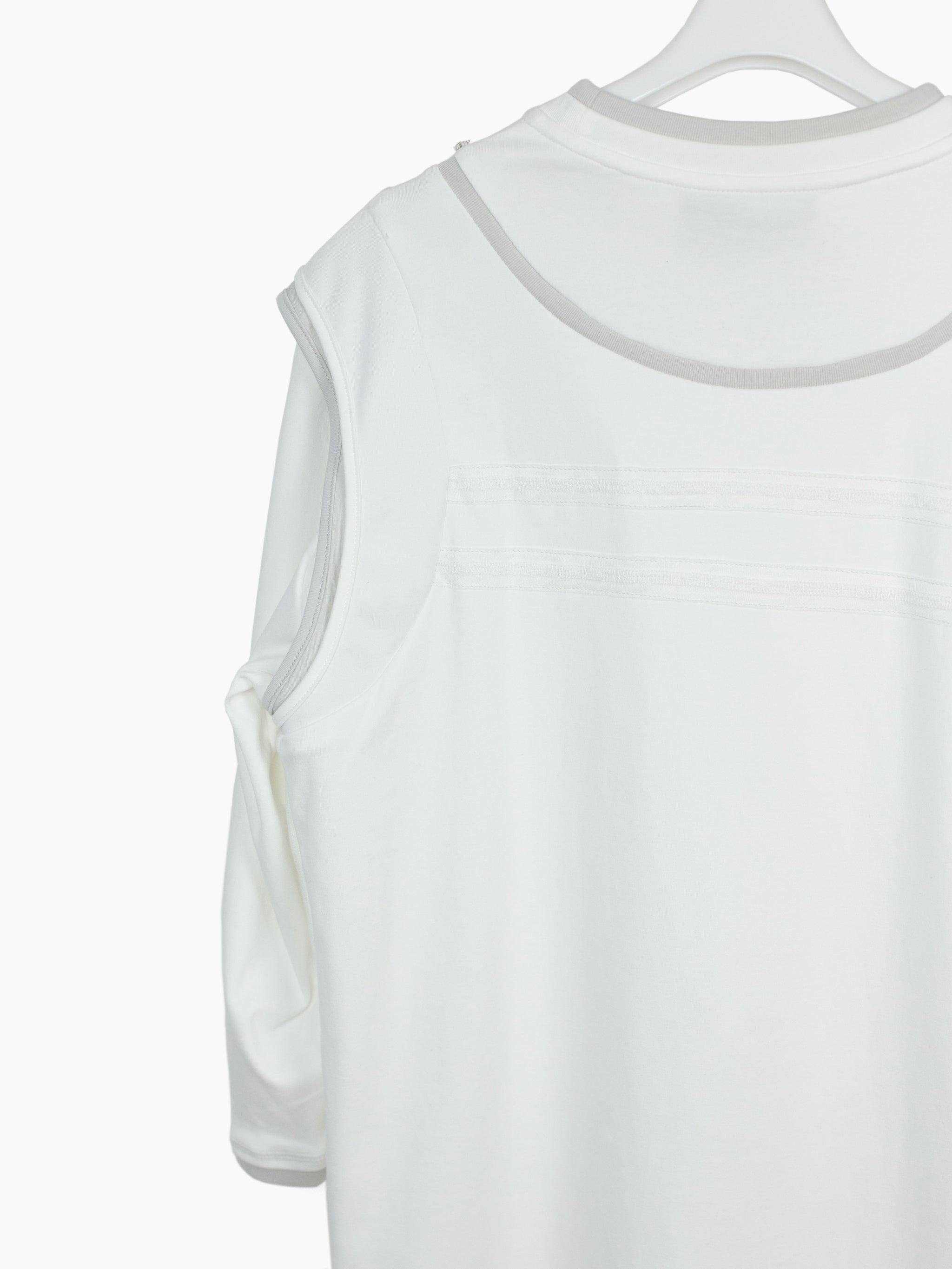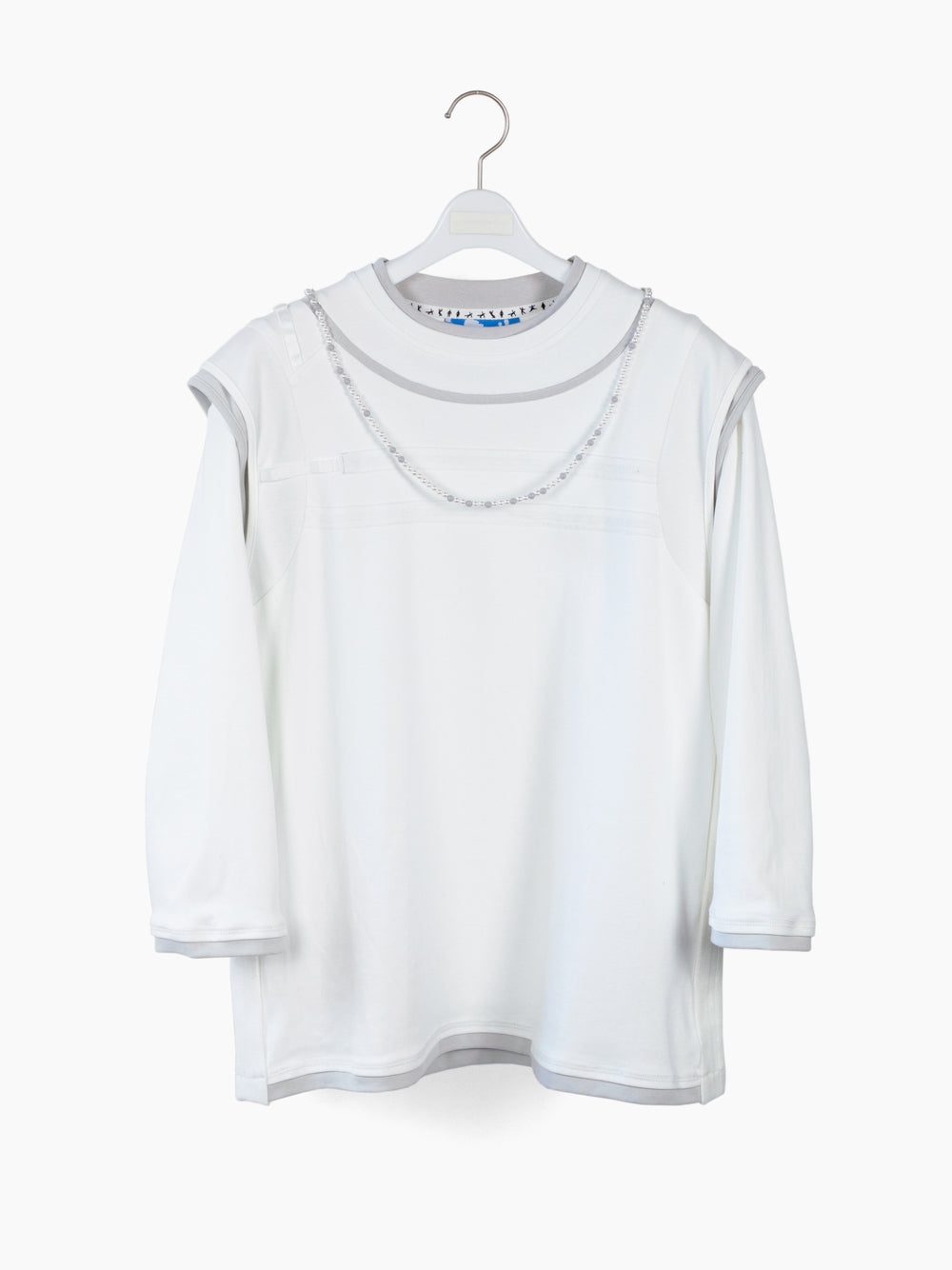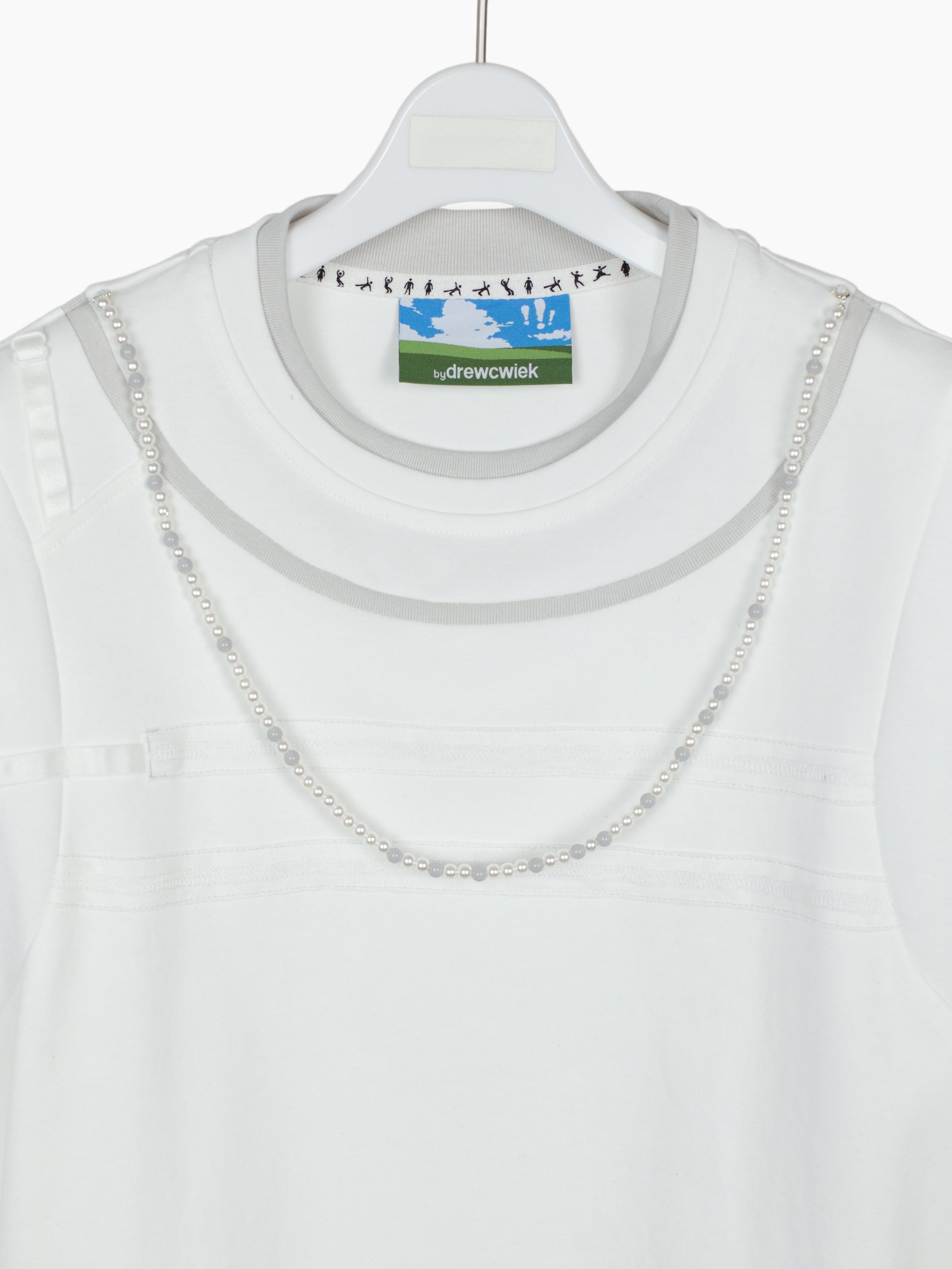 Faux-layered shirt with multiple neck and shoulder lines spanning the full gamut from cutoff-muscle to tank top to spaghetti strap. Removable/interchangable beaded necklace