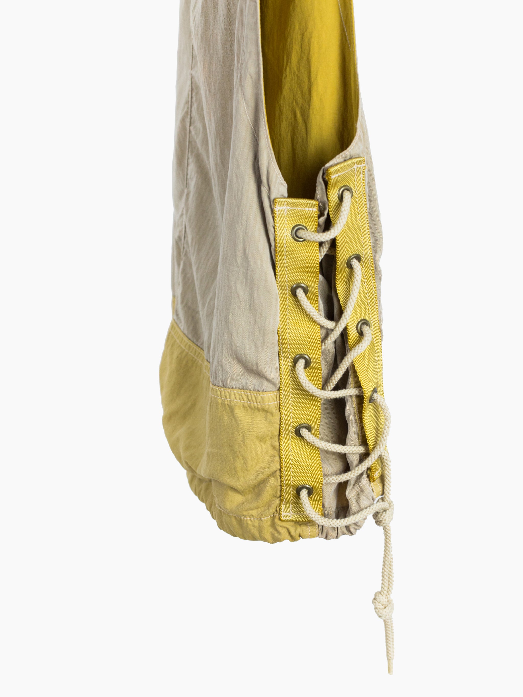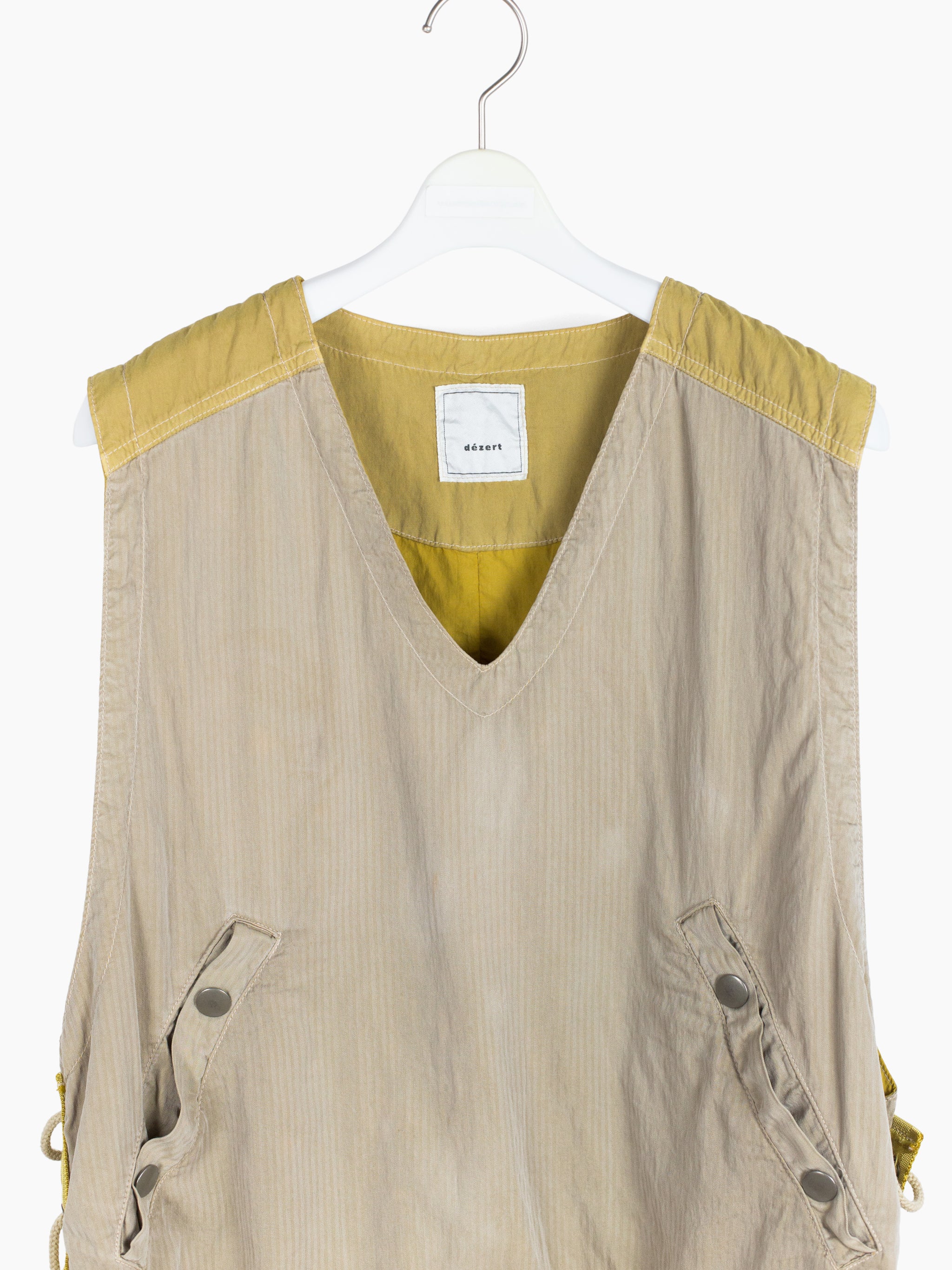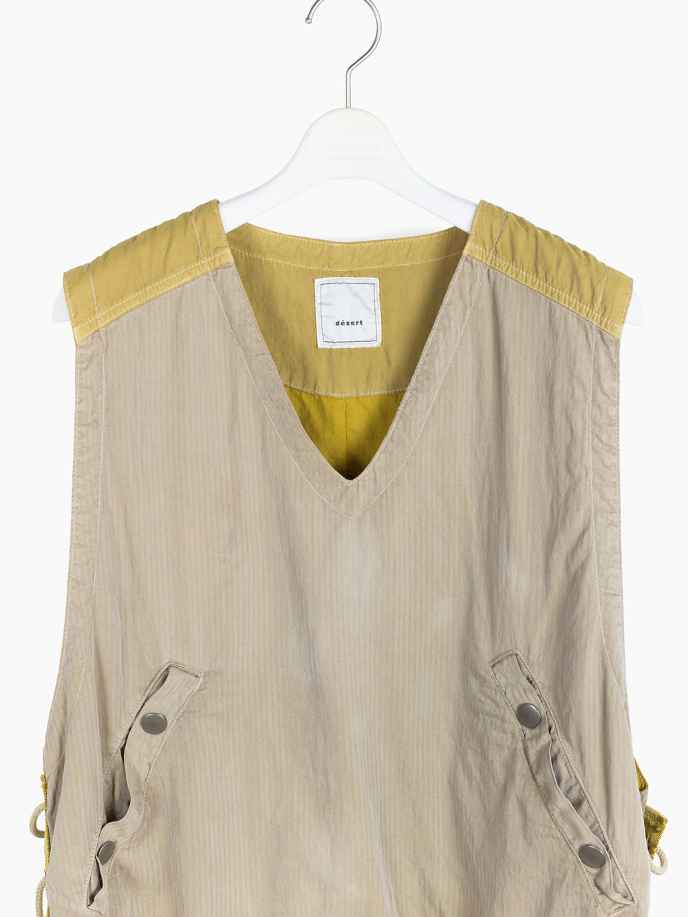 Pullover vest from Dezert featuring two-tone colorblocking, two front snap-closed hand pockets, and webbing-trimmed lace sides. Incredibly comfortable with a lightweight Rayon/nylon blend face fabric accompanied by soft yellow nylon panels. It is wearable as a midlayer or over other outerwear thanks to the expandable sides and low armholes.