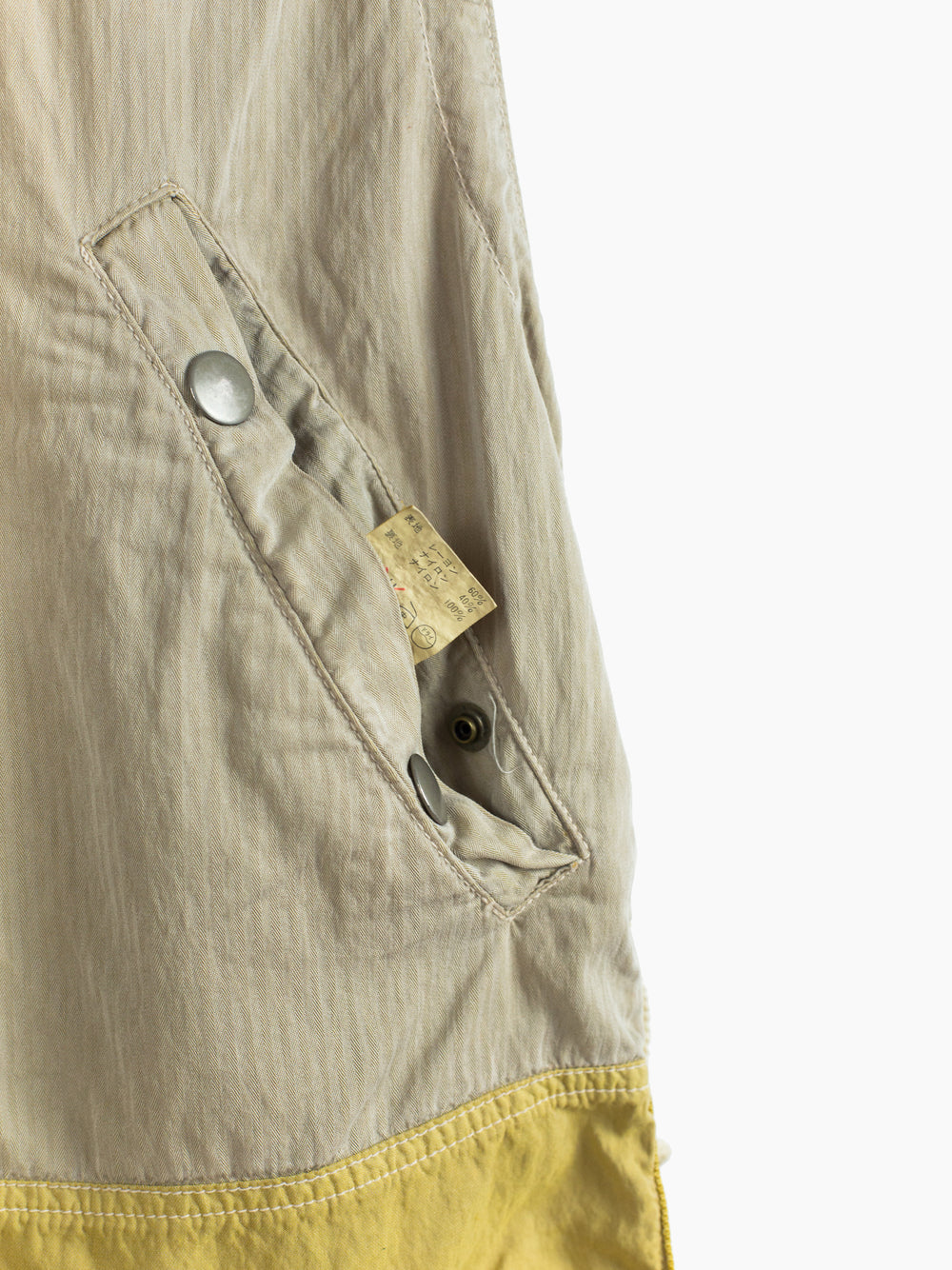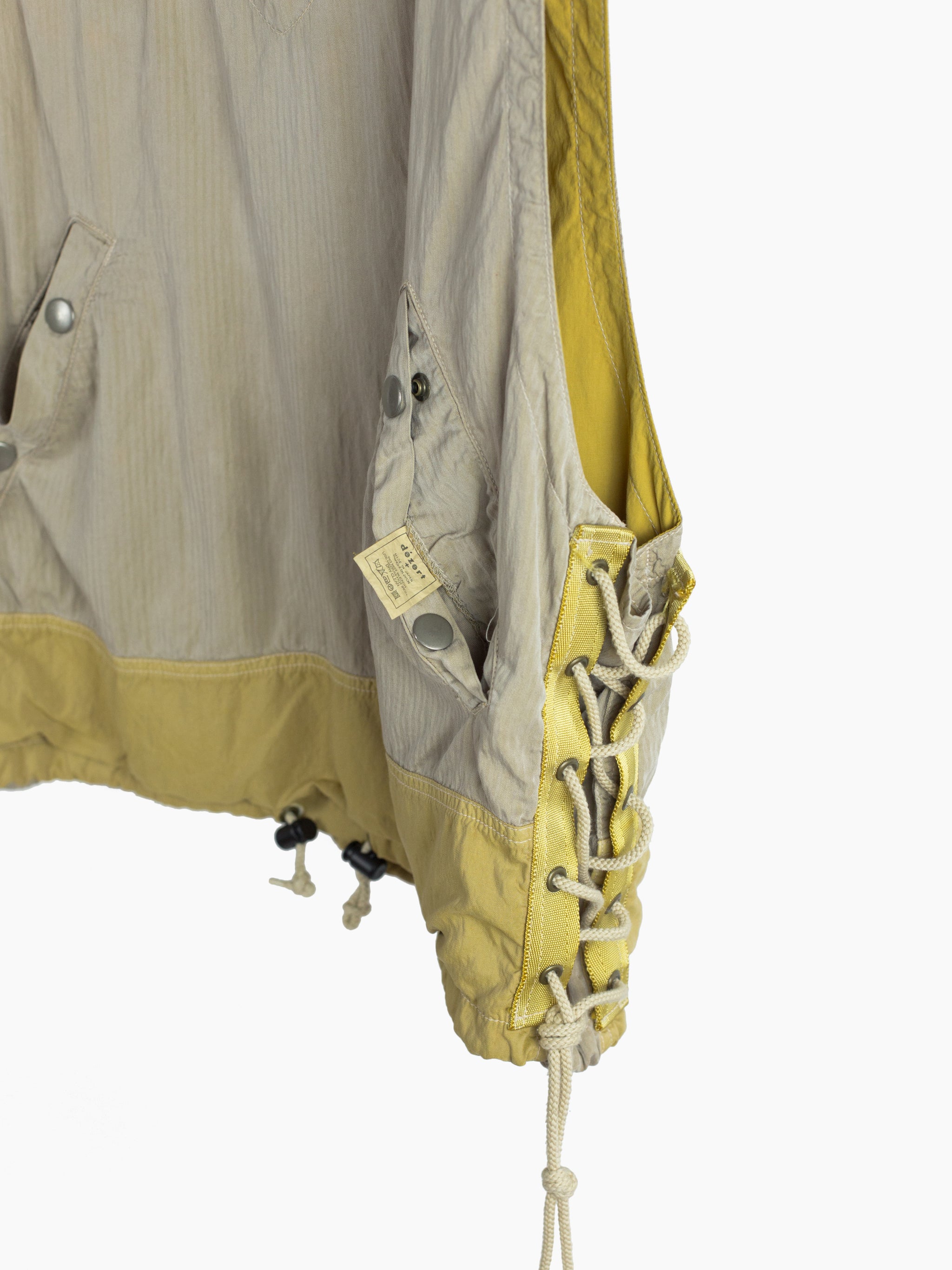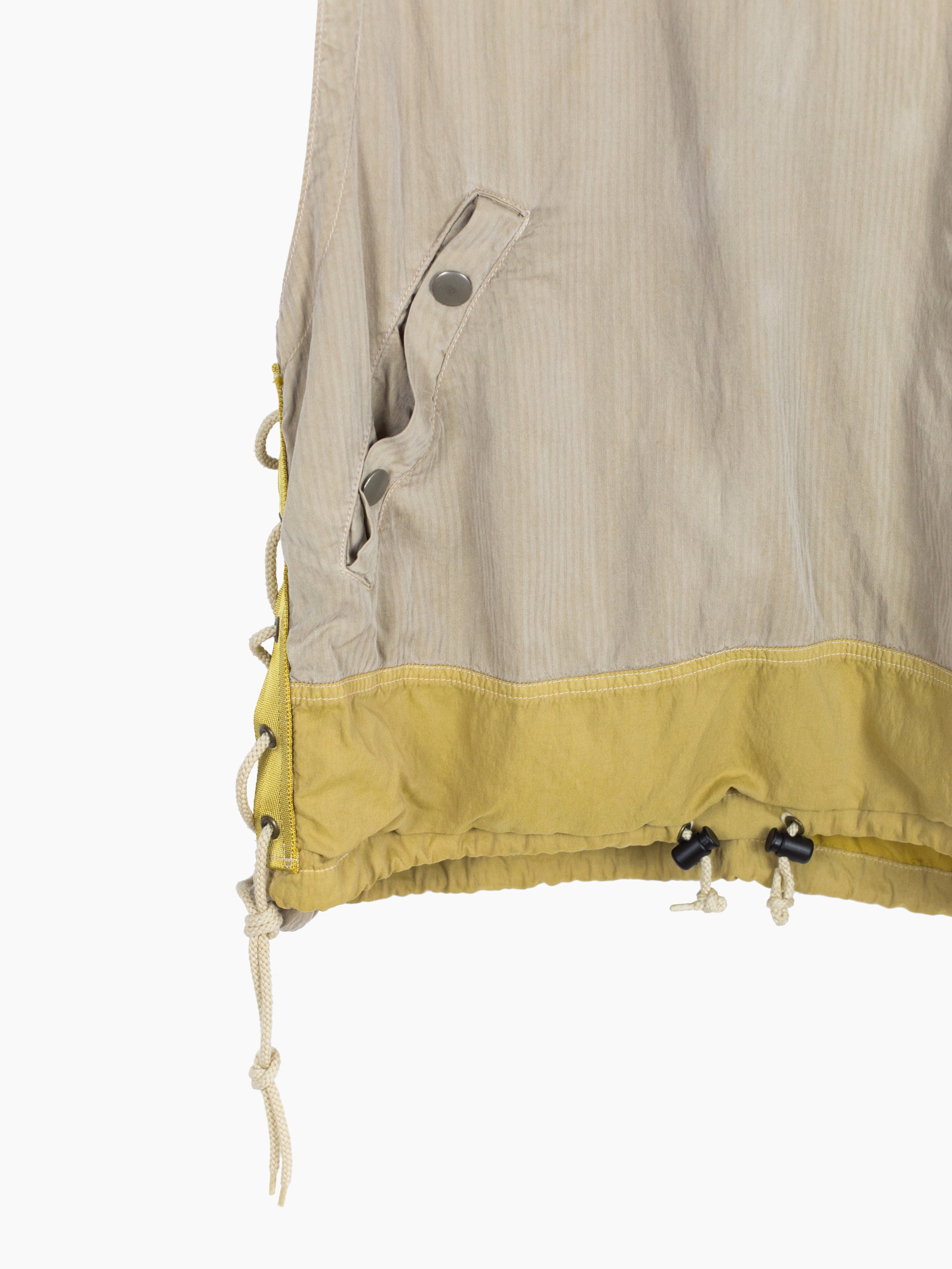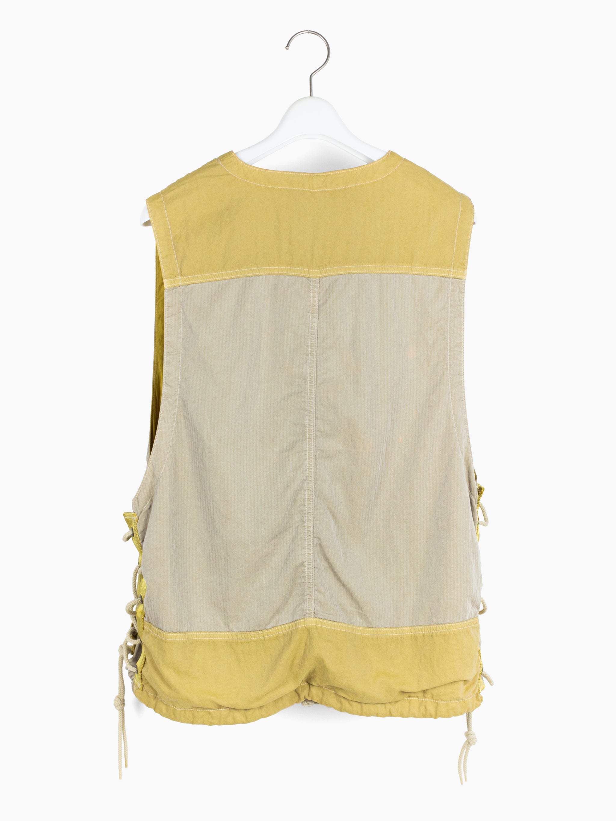 Pullover vest from Dezert featuring two-tone colorblocking, two front snap-closed hand pockets, and webbing-trimmed lace sides. Incredibly comfortable with a lightweight Rayon/nylon blend face fabric accompanied by soft yellow nylon panels. It is wearable as a midlayer or over other outerwear thanks to the expandable sides and low armholes.
