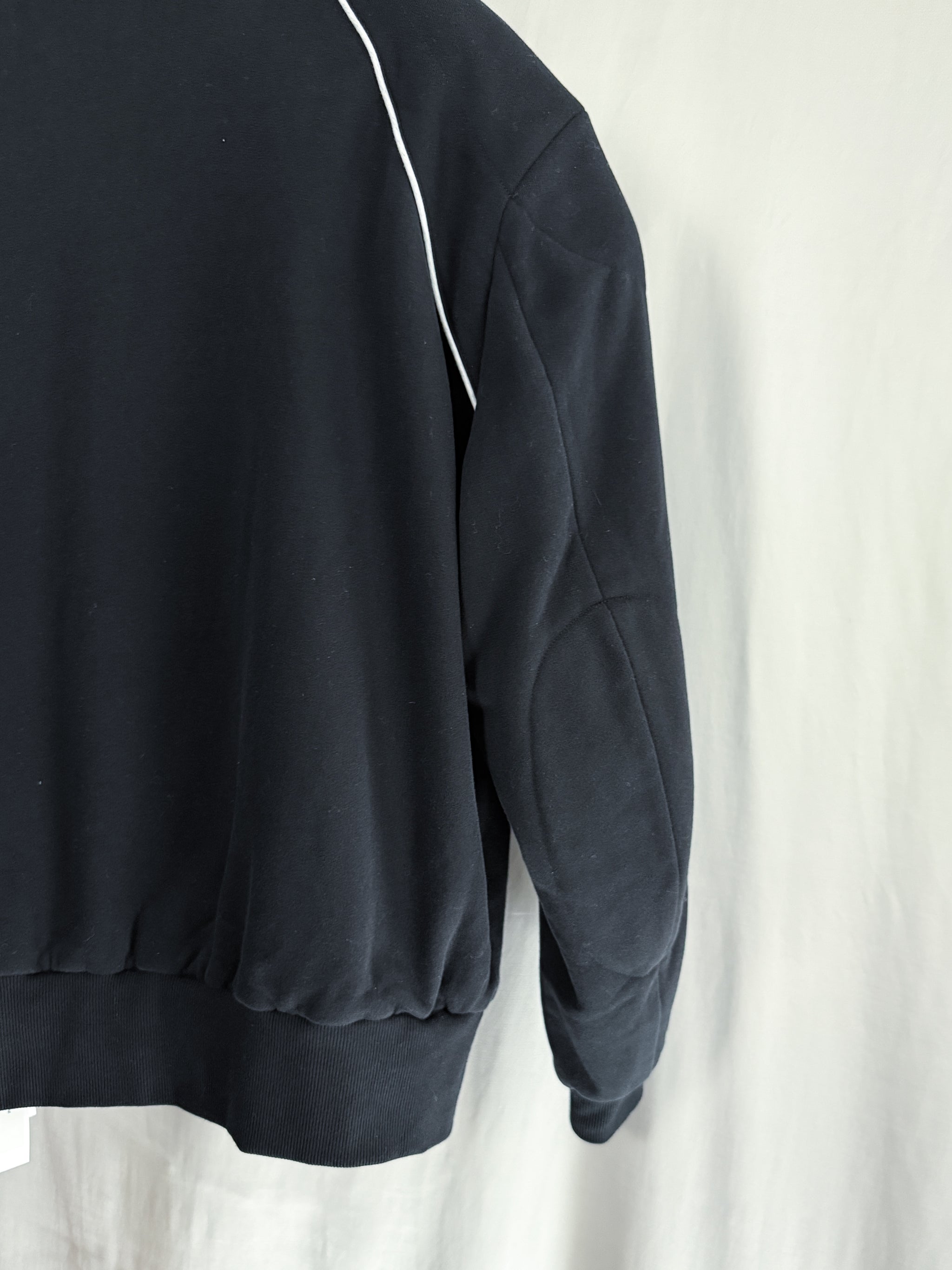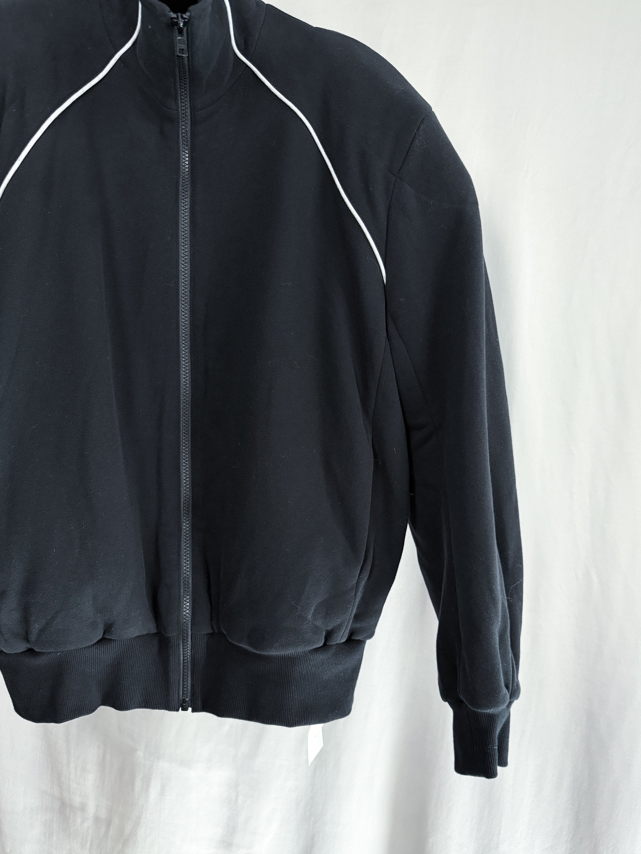 Moto track jacket with structured, padded shoulders and elbows. Cut in a mid-heavyweight sweat jersey and fully lined in t-shirt weight jersey for a supremely comfortable next-to-skin feel. Zippered handwarmer pockets. Two internal chest-height pockets