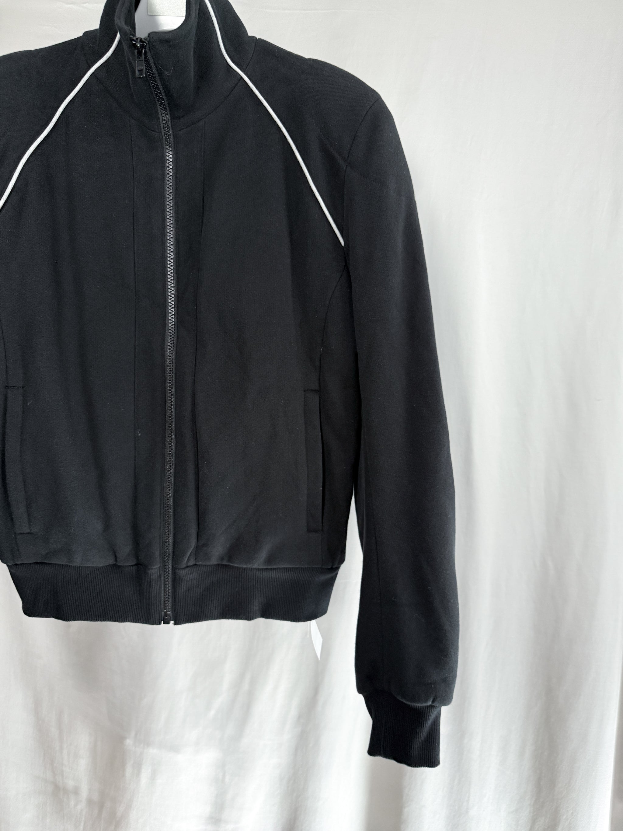 Moto track jacket with structured, padded shoulders and elbows. Cut in a mid-heavyweight sweat jersey and fully lined in t-shirt weight jersey for a supremely comfortable next-to-skin feel. Zippered handwarmer pockets.
