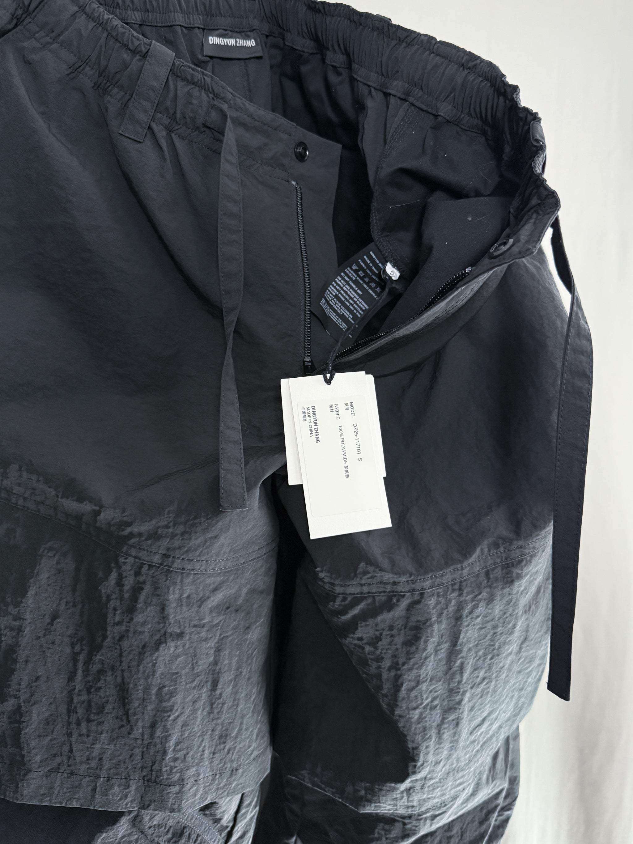 Convertible cargo short-pant hyrid with layered look. Structured crinkle nylon sits off-body. Ovular knee panel creates 3D articulated shape. Snap waistband with zipper fly. Elasticated + drawstring waistband.
