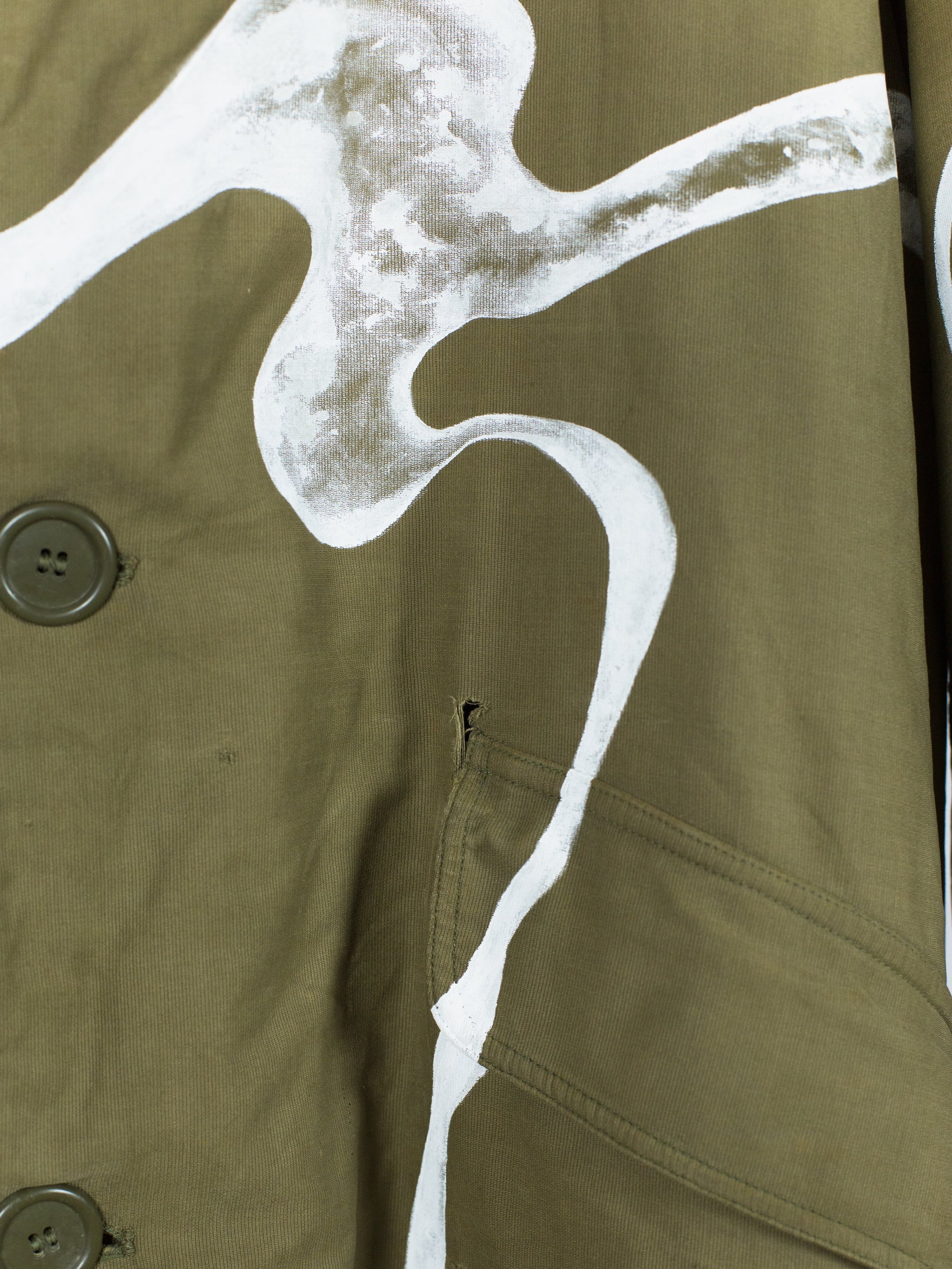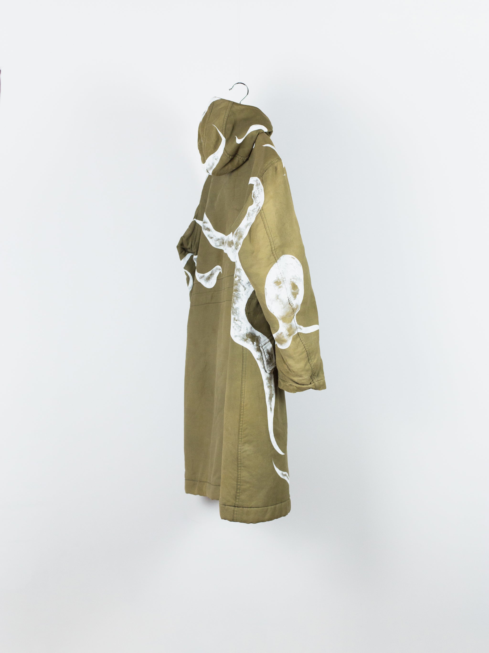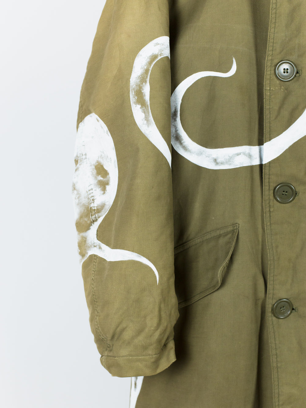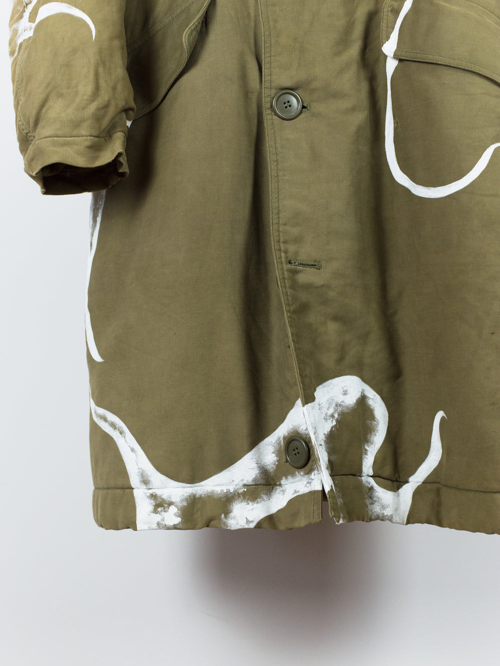 40s USN Deck Parka. Fully bore-lined with shaped hood and ribbed inner cuffs. Talon zipper at center front. Hand painted with abstract graphic that wraps 360 degrees around the entirety of the piece.