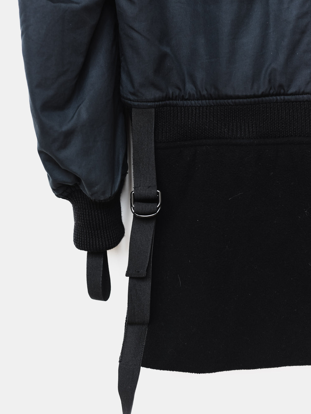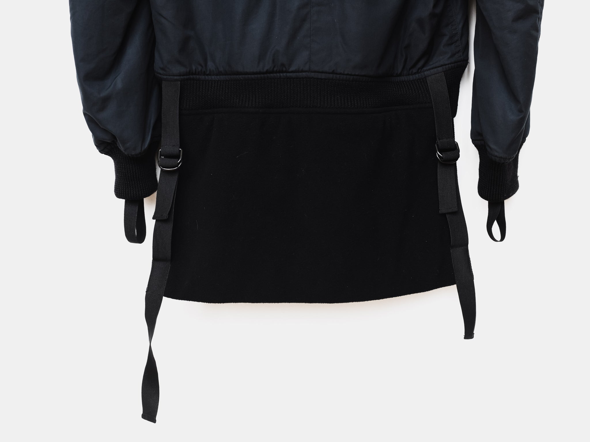 This iteration is a beautiful midnight colorway. The luxurious cotton bomber is lightly padded and lined with a plush cotton fleece, finished with cupro sleeves and a beautiful elastic cuff adorned with removable bondage hand straps. This version with the back details is one of the rarest and in our opinion, best bomber jackets.