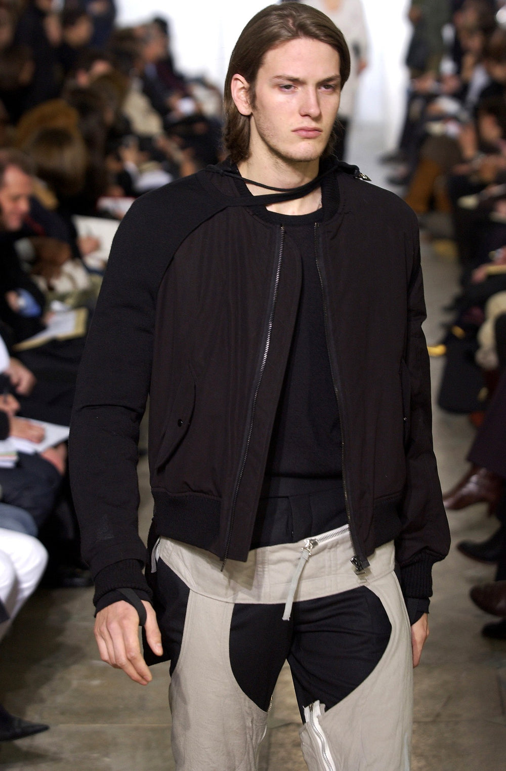 AW03 was a masterpiece in showcasing a visually charged rendition of a variety of influences with the unifying tailoring and craftsmanship associated with the designs. This season evolved his pioneering military inspirations into overt homages to items like aviator pressure suits complete with corset-lacing and safety belt style harnesses reframed as bondage in his avant-garde world of razor-sharp tailoring and sexually charged refinement.
