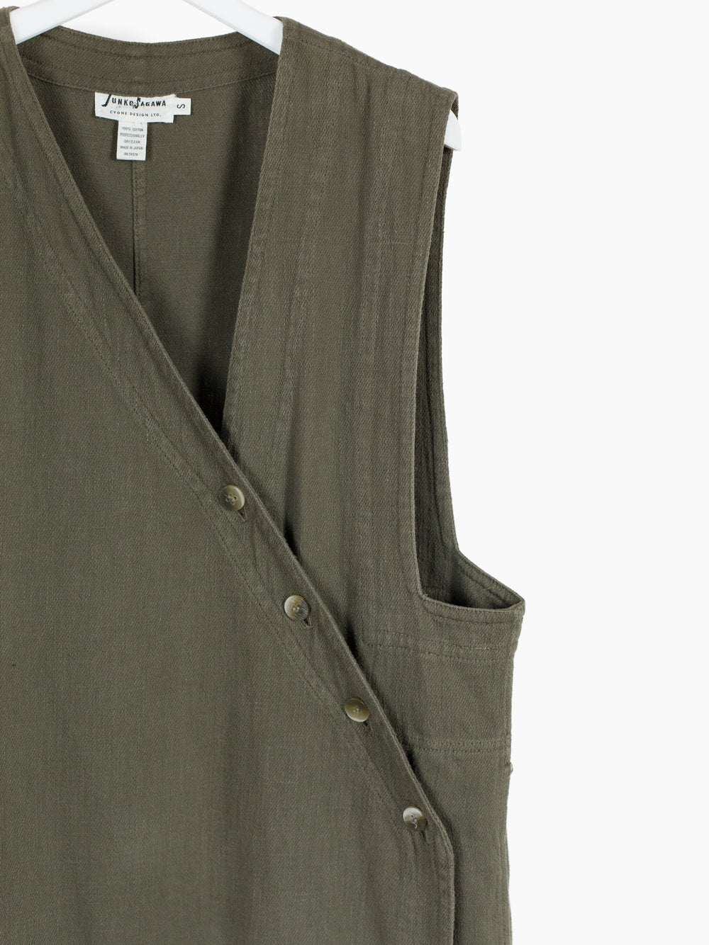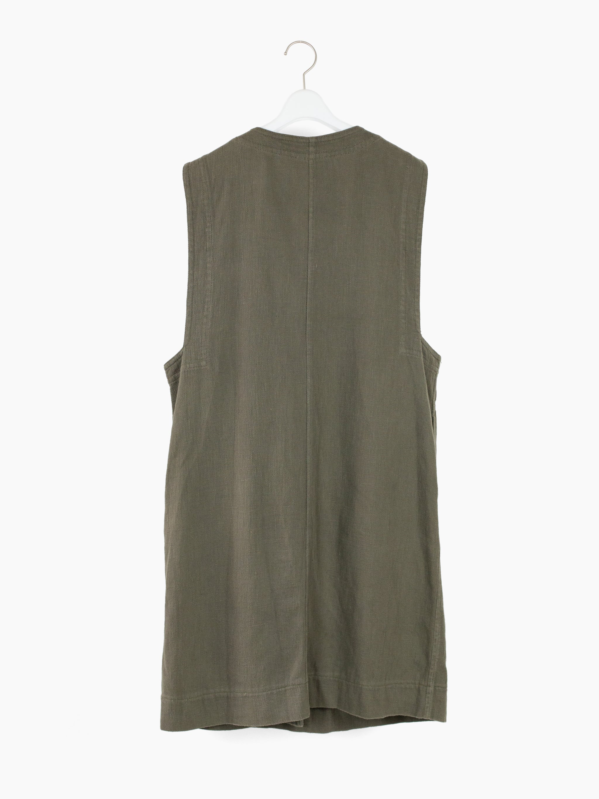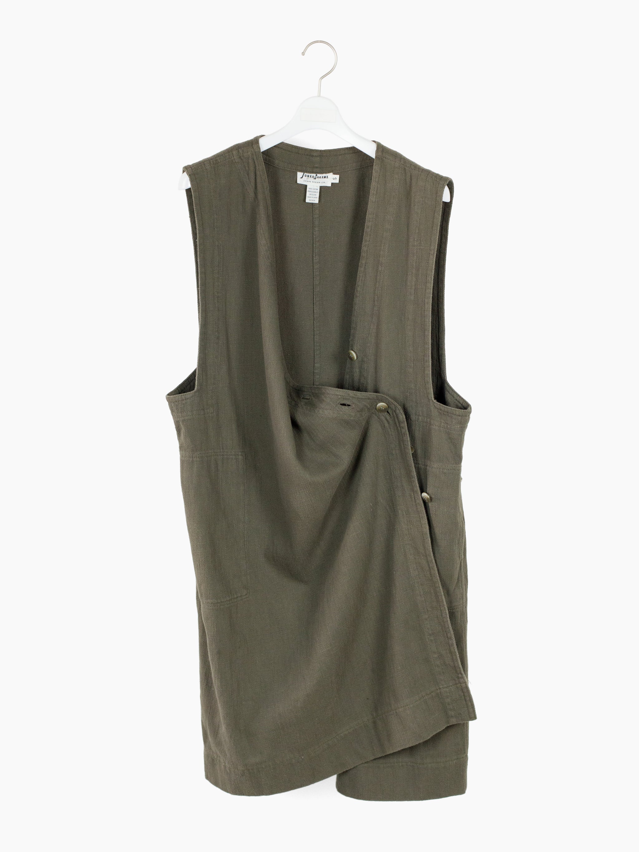 Soft cotton long vest with hand carved horn button diagonal closure. Two on-seam side pockets.