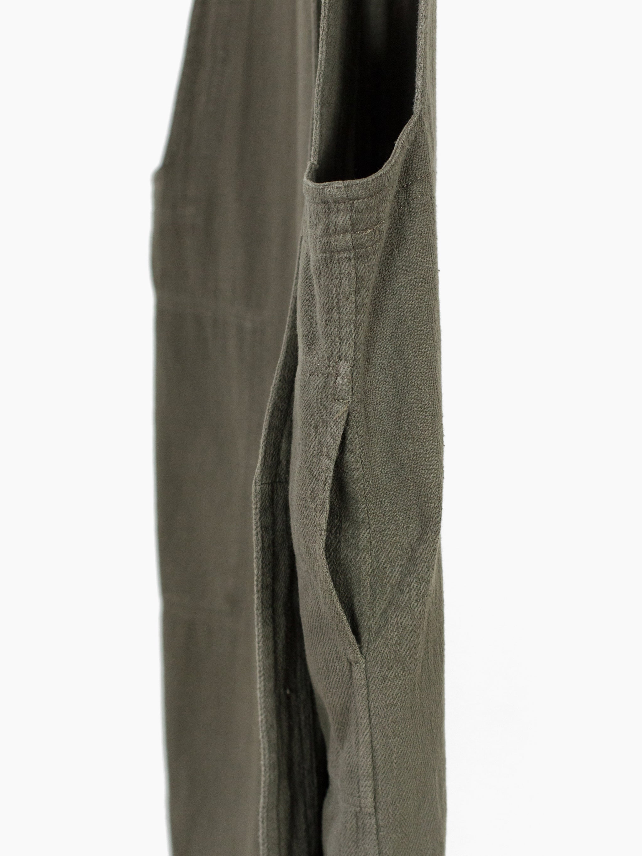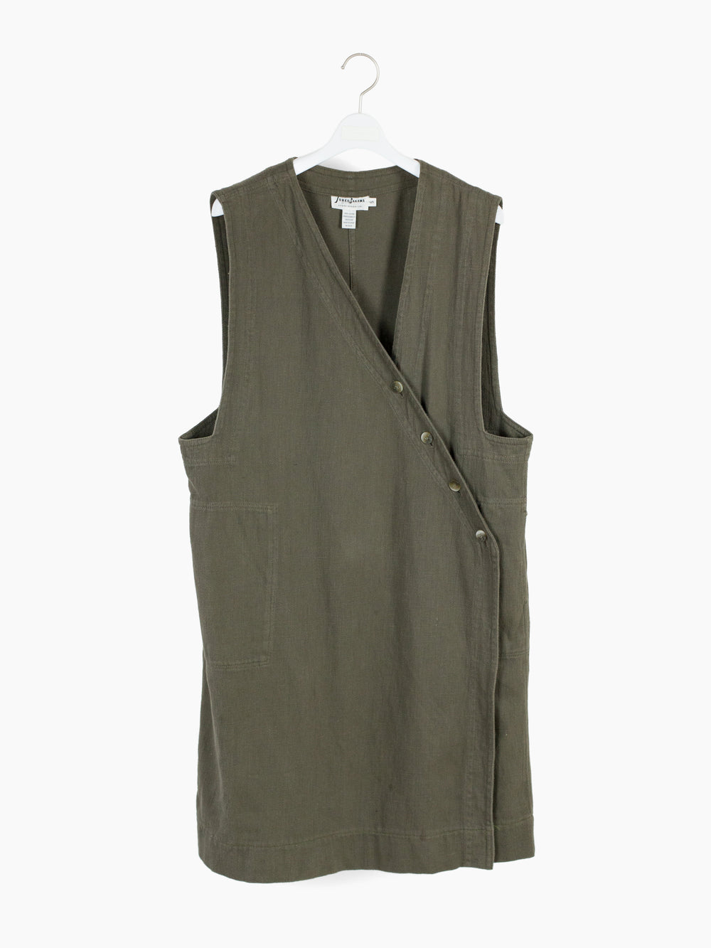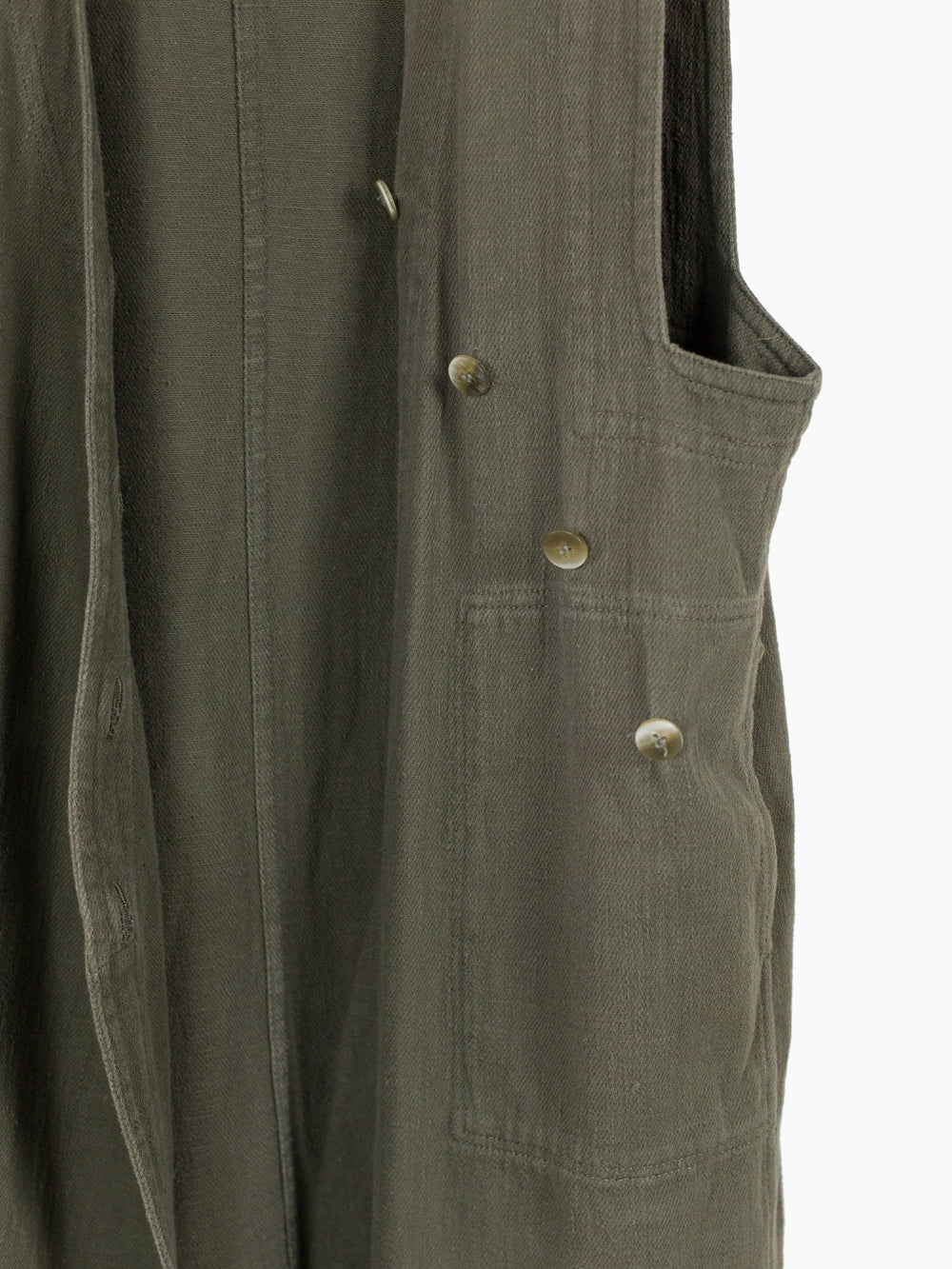 Soft cotton long vest with hand carved horn button diagonal closure. Two on-seam side pockets.