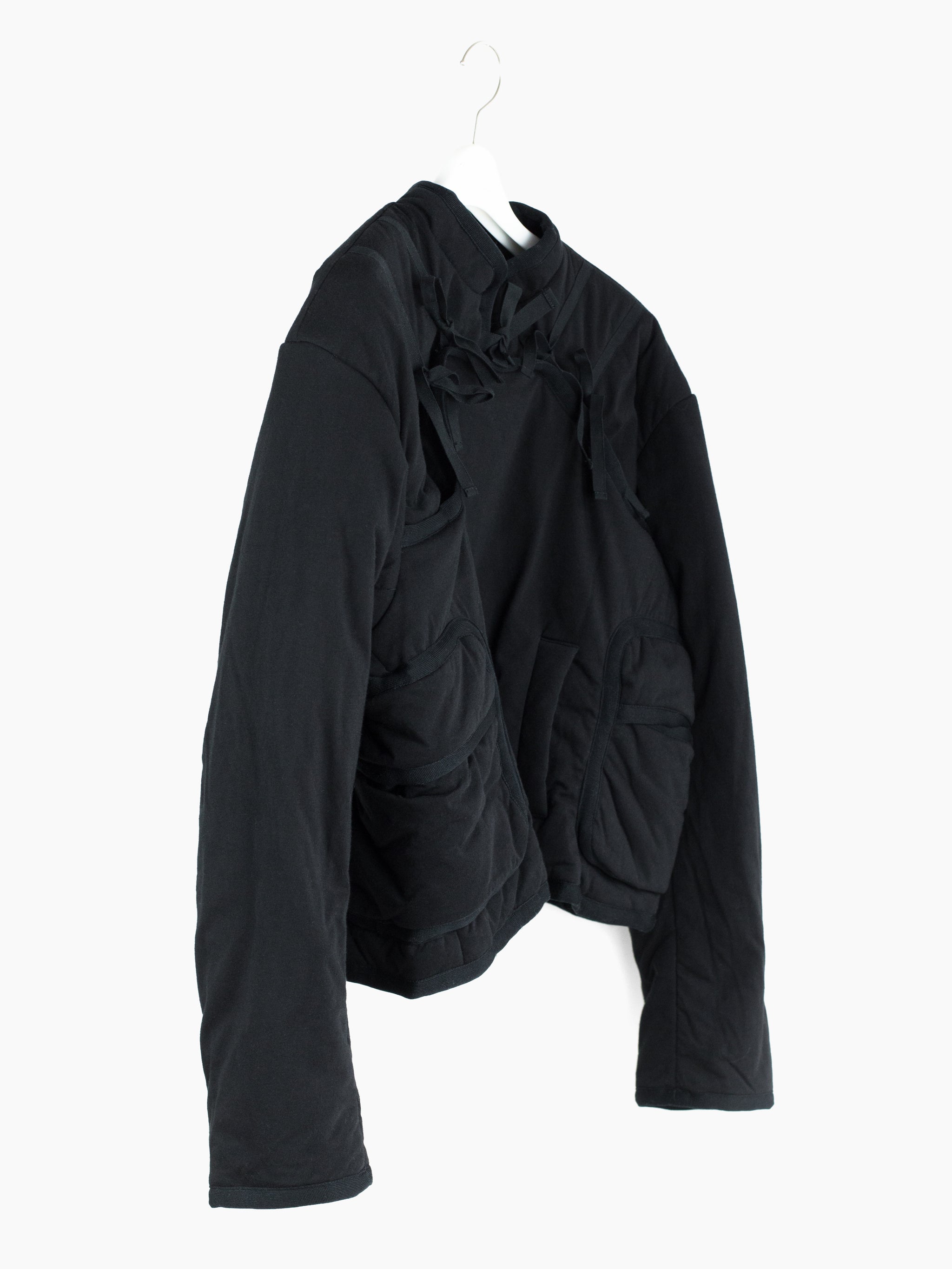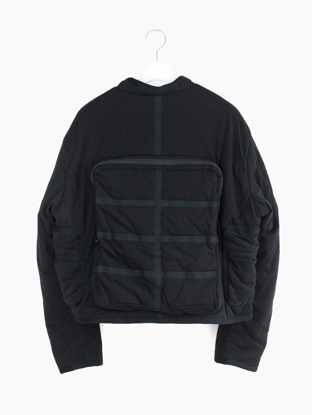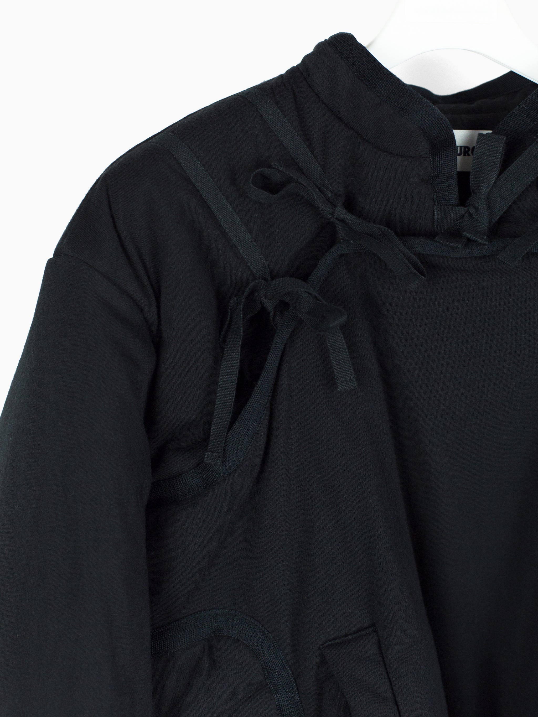 Pullover-style Qipao jacket with horizontal chest tie closure and stand collar. This piece features tons of storage options, from a front kangaroo-style pass through pocket, two side patch pockets, and a huge zippered 3D back pocket, a compartment Kozaburo imagined could hold the scrolls and texts of a traveling monk. Webbing trim along the back forms the character 丰, meaning bounty and riches.