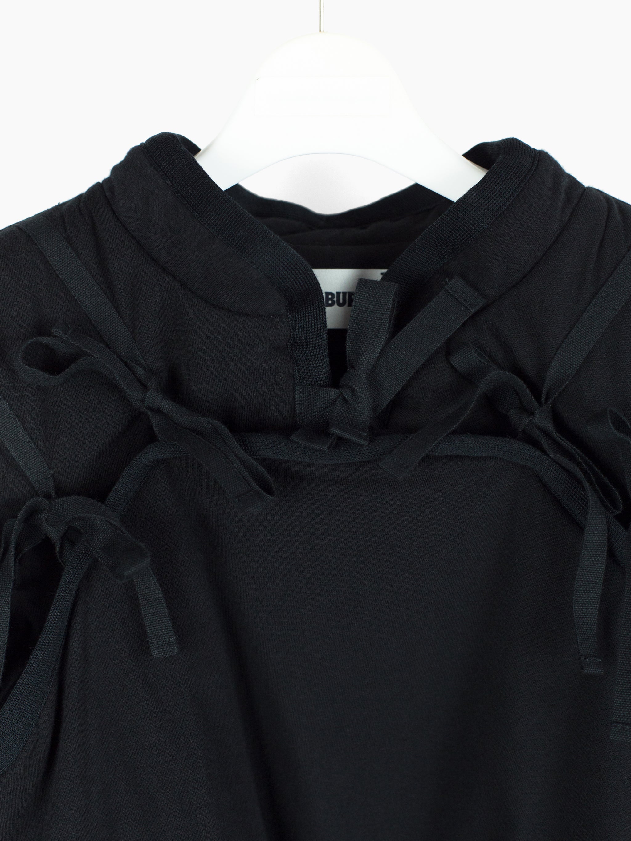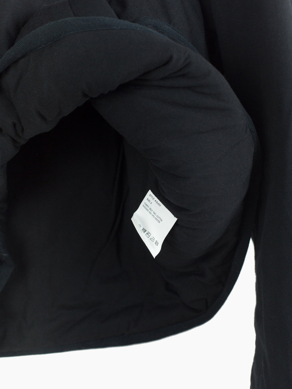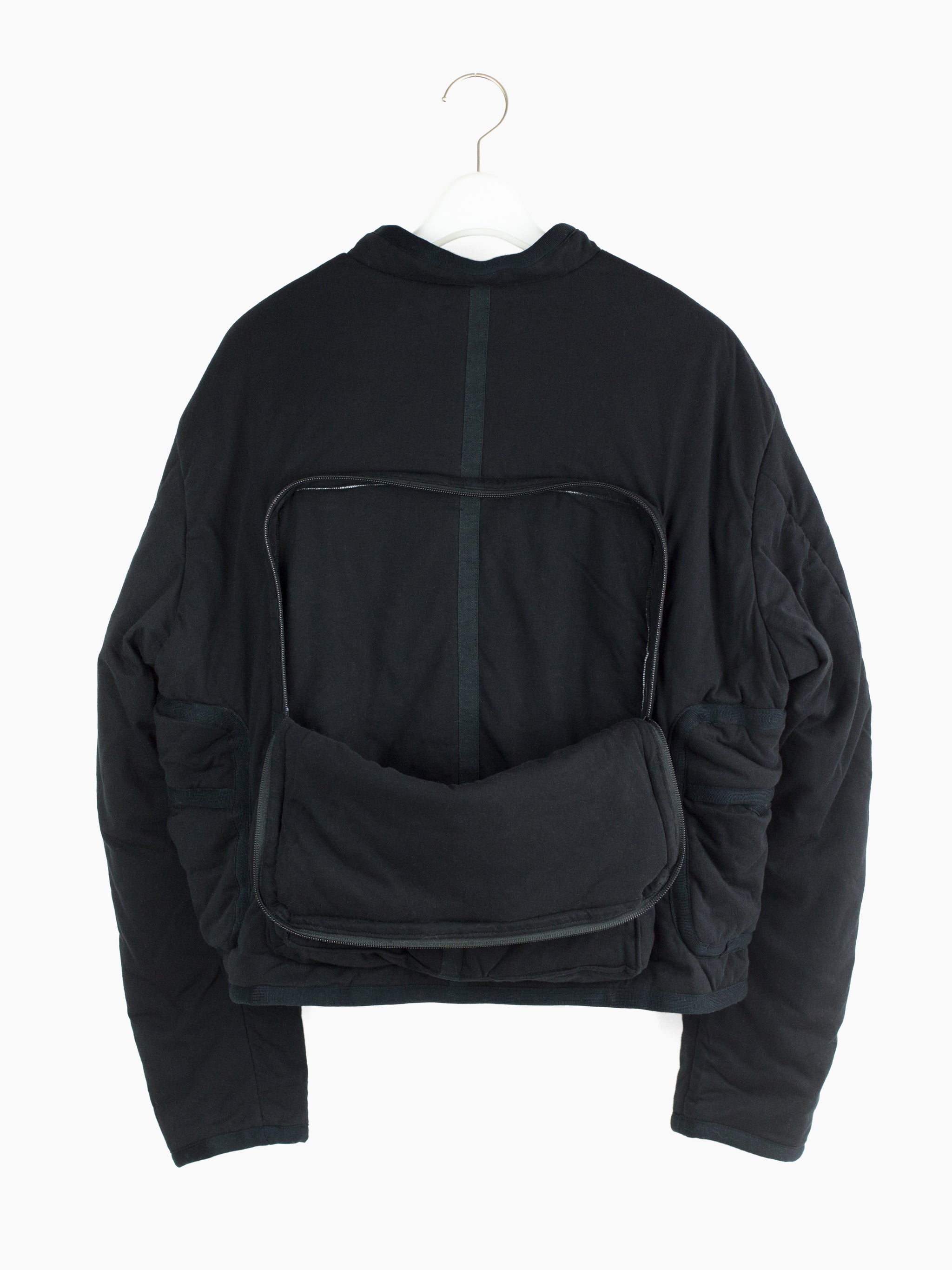 Pullover-style Qipao jacket with horizontal chest tie closure and stand collar. This piece features tons of storage options, from a front kangaroo-style pass through pocket, two side patch pockets, and a huge zippered 3D back pocket, a compartment Kozaburo imagined could hold the scrolls and texts of a traveling monk. Webbing trim along the back forms the character 丰, meaning bounty and riches.