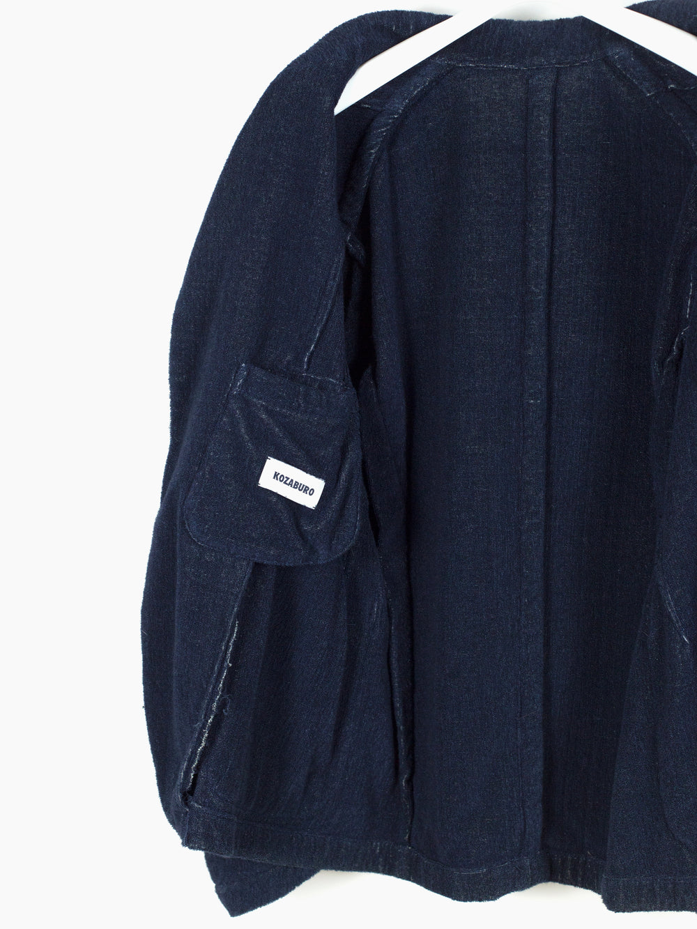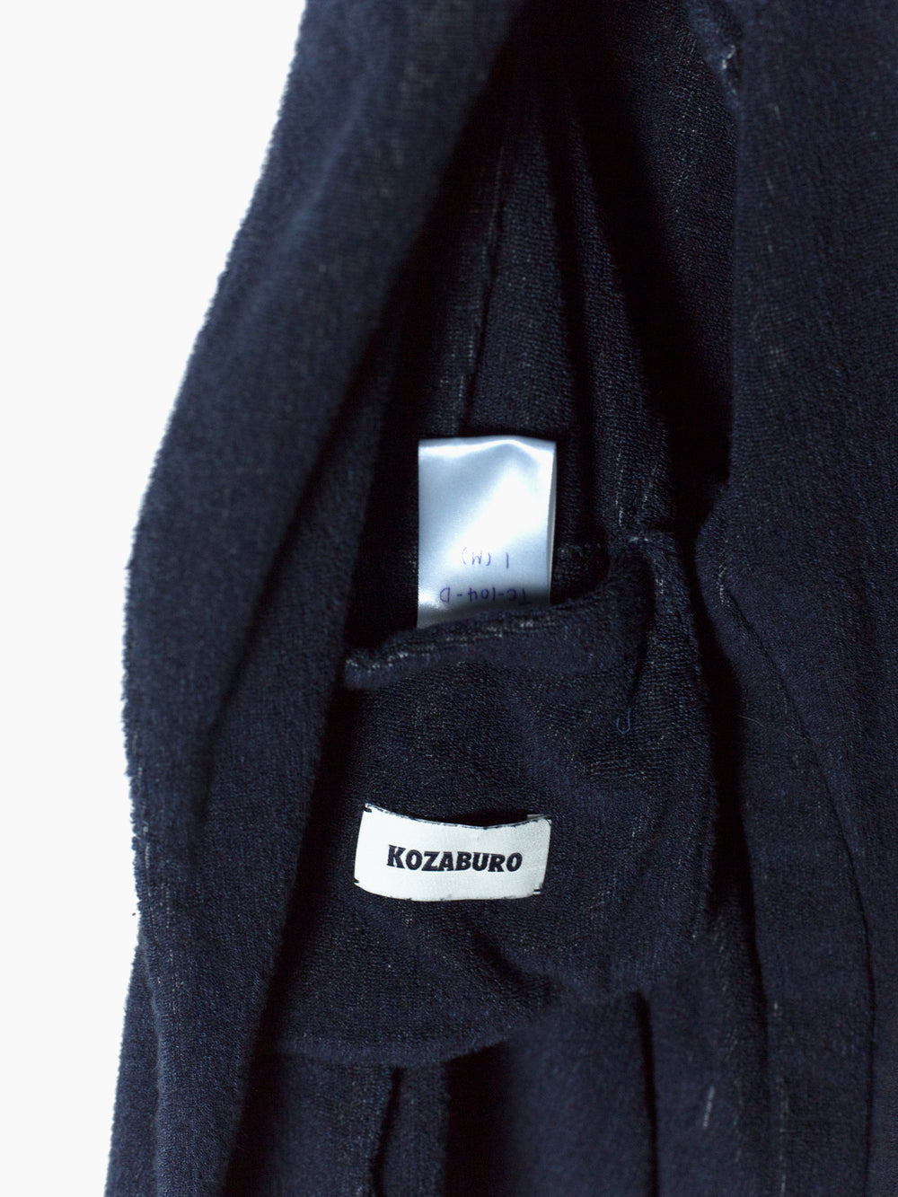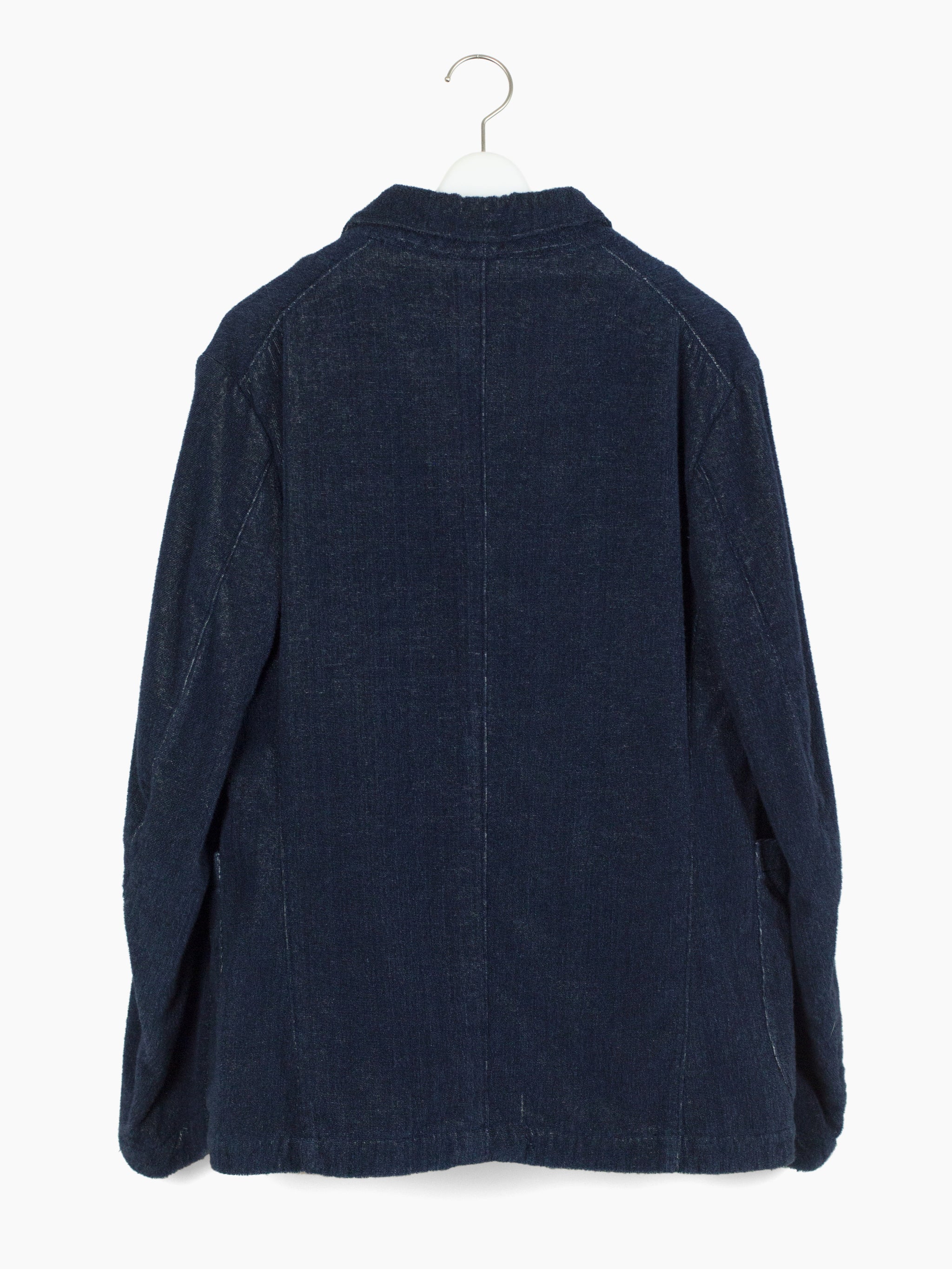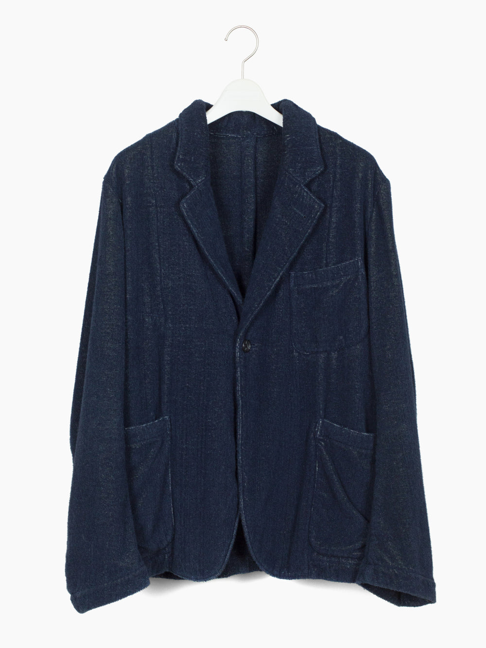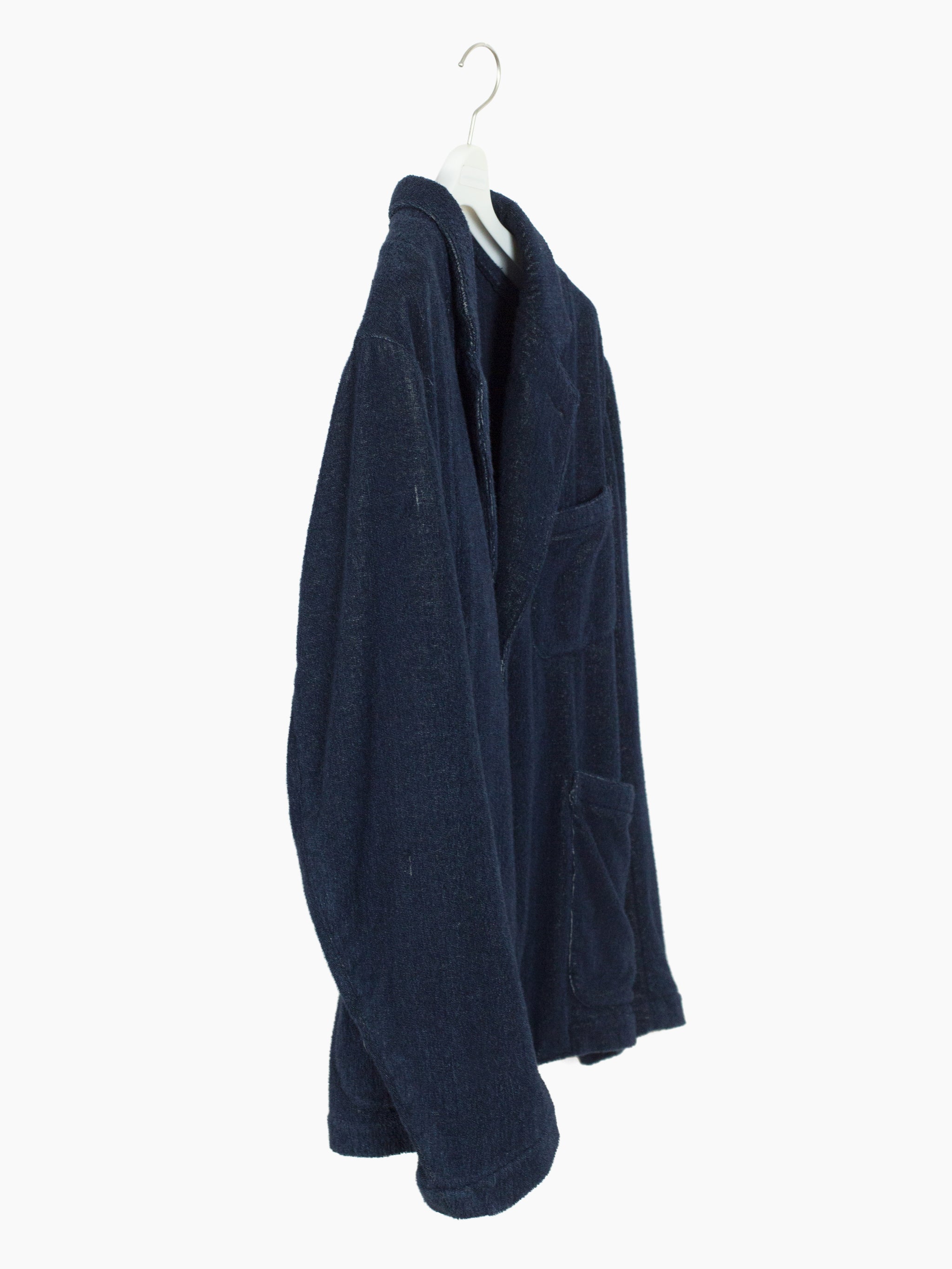 Doubleface Indigo-dyed pile creates a cozy towel-like texture on this single breasted suit jacket from SS20. This piece is a 1 of 1 sample as the garment was never produced for retailers given the cost and complexity of the fabrication. Beautiful slim/shrunken suit jacket shape with pared back single high button stance closure, medium-sized notch lapels and subtlely curved sleeves. Sack fit construction means body is shaped through untrimmeddarts rather than seams, allowing the wearer to adjust (let out, take in) using the darts without making any permanent irreversible changes.