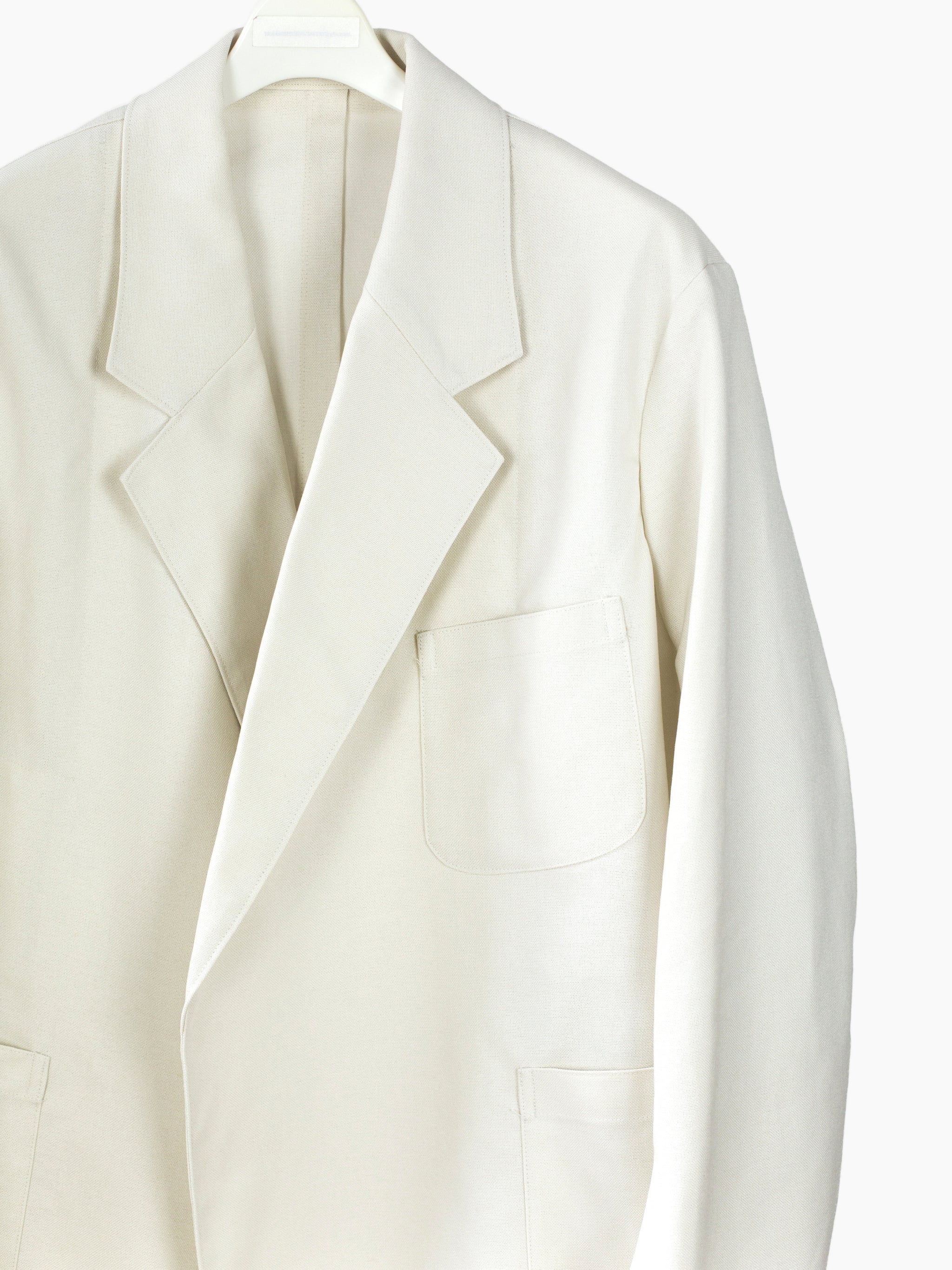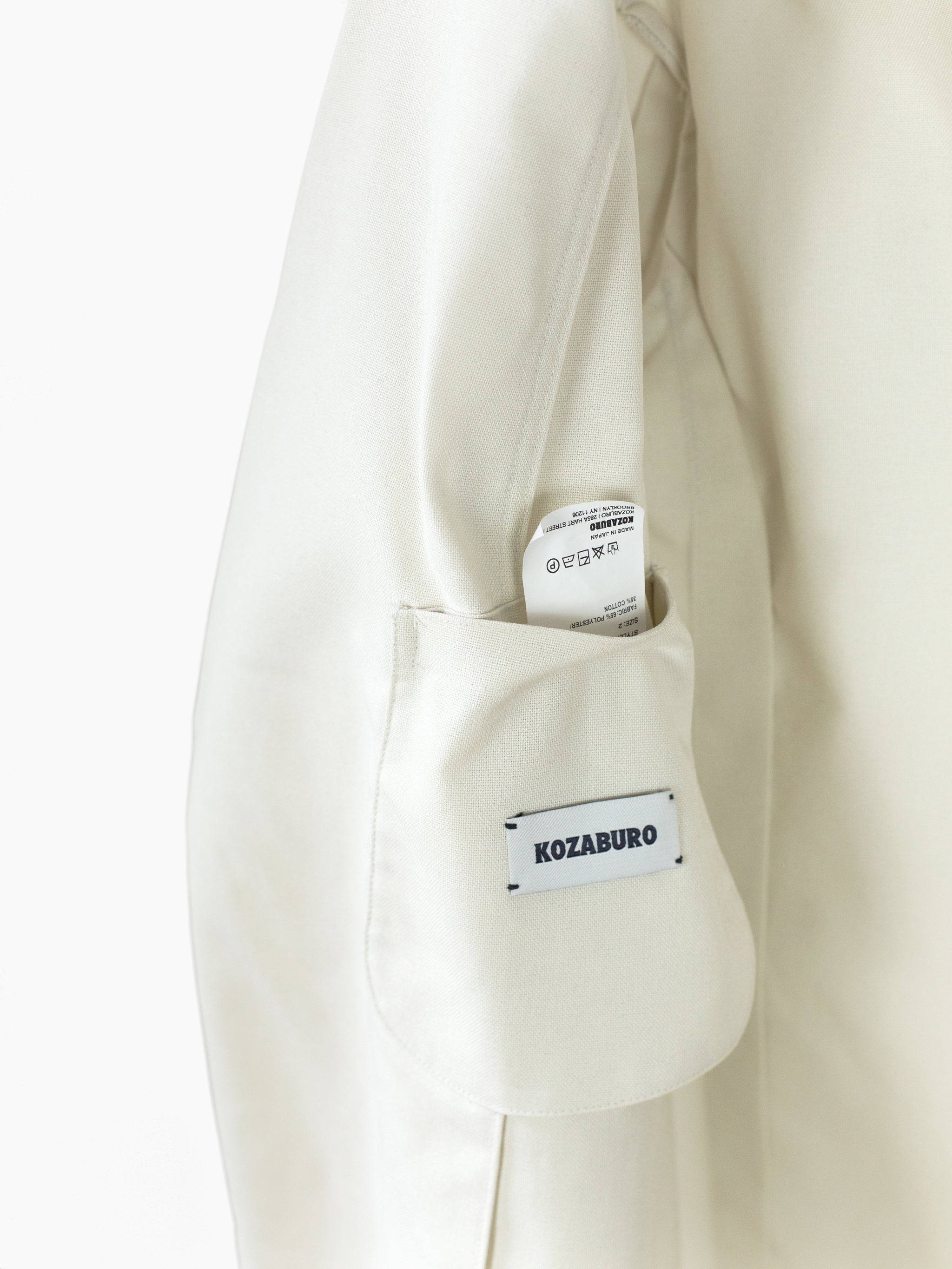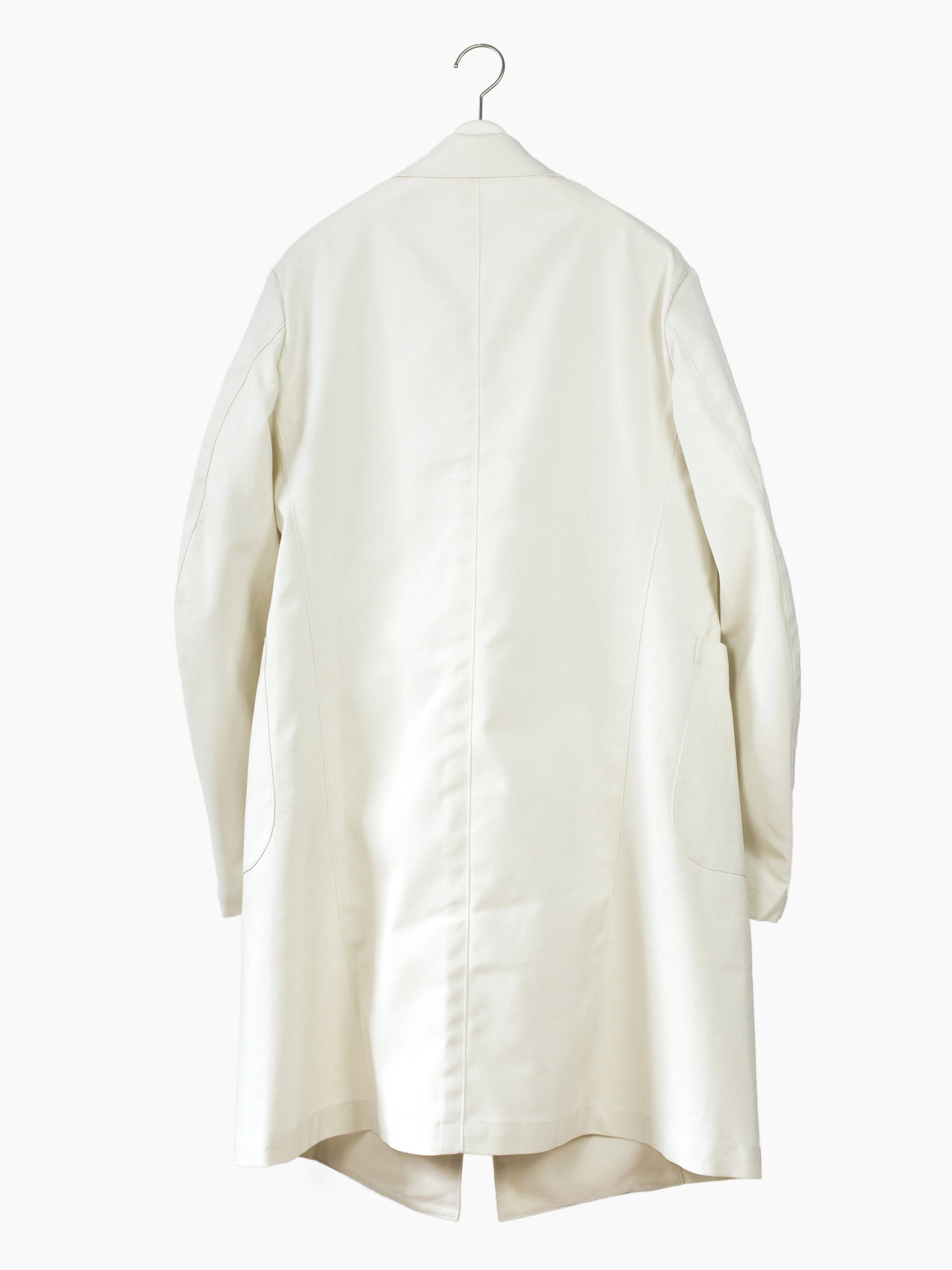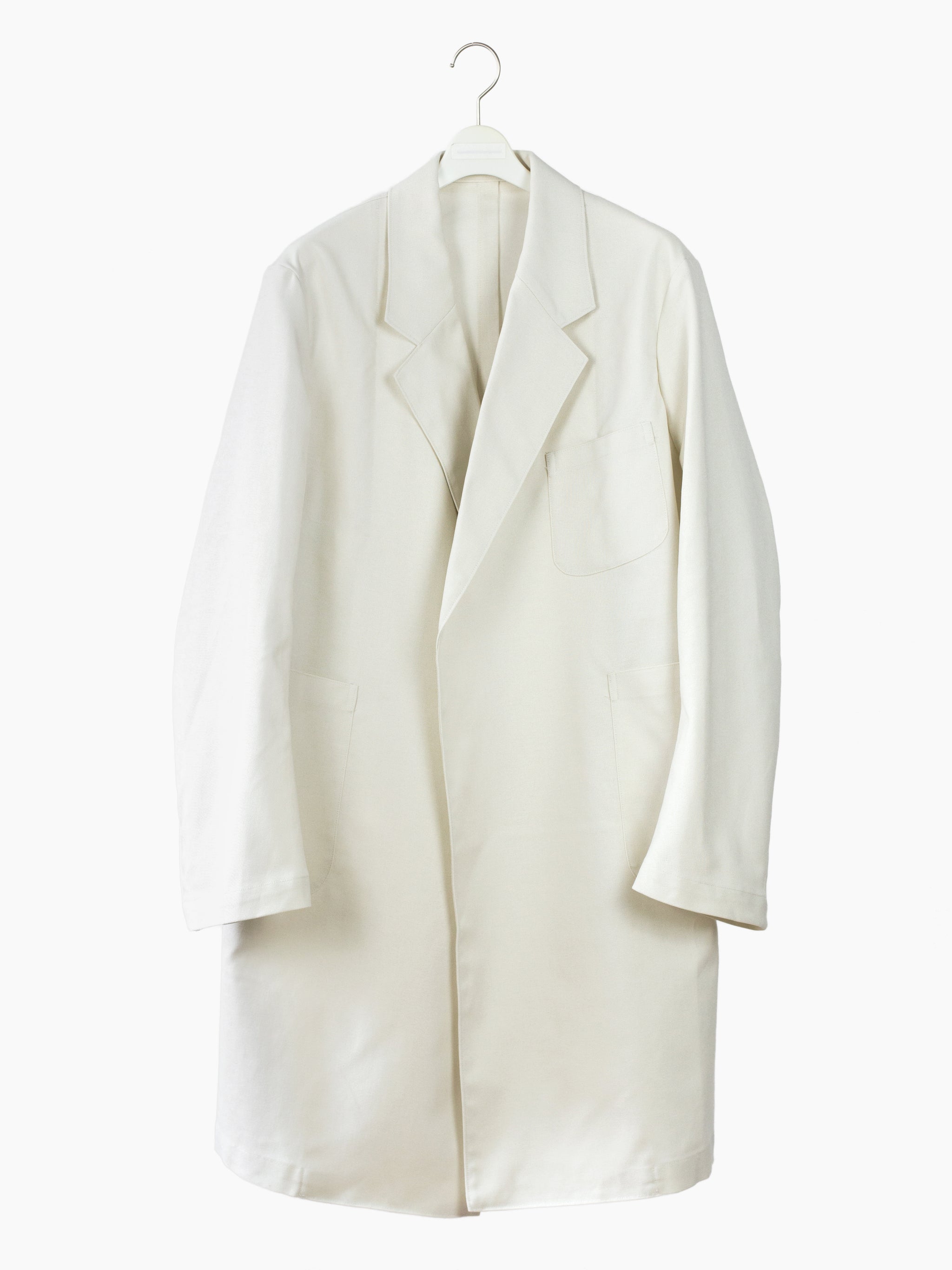 A stripped down, long coat iteration of the Kozaburo staple 'Sack Fit' jacket, which features 1-piece body construction where all shaping is done through folded and stitched darts that are uncut, allowing for the wearer to let out and take in the garment as they see fit. This season, the form returns in a knee-length 1.5-breasted coat form with no front closure. In white hopsack, the coat reads vaguely hospital, vaguely laboratory, but with a sharp tailored edge and warm eggshell tone that separates it just enough.