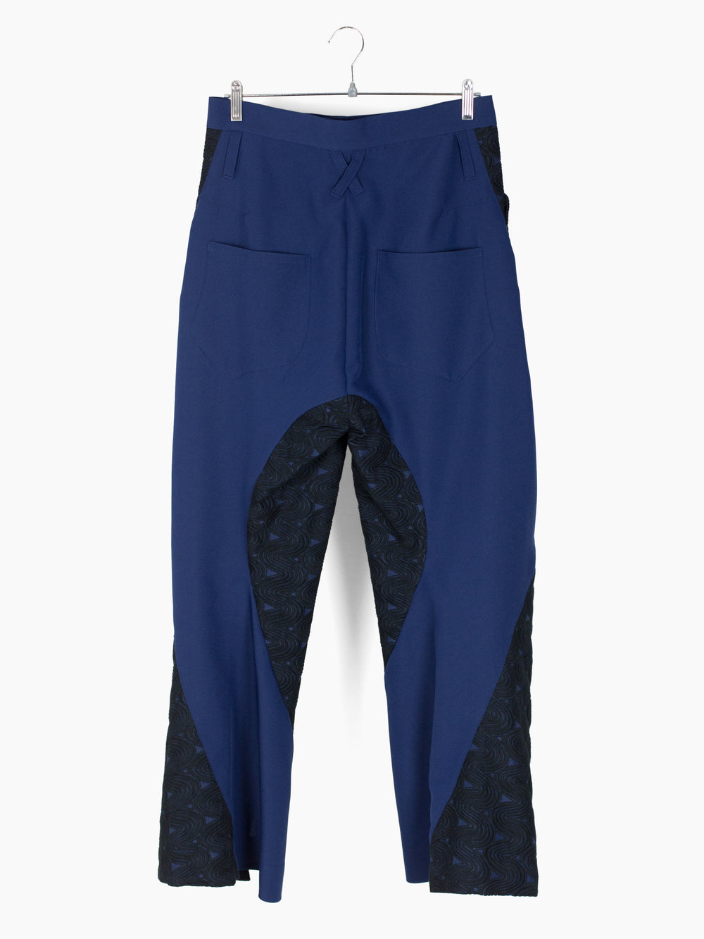 Returning in light, airy polyester twill with statement 'wave' pattern embroidery, the Dexter pant features spiral leg construction that twists around the leg, dialing up the dynamic, movemented look that's foundational to the Kozaburo universe. The curved construction is abstract yet imbues the pants with a zen quality, equal parts directional and meandering, using soft sweeping curves to create an aggressive and graphic visual. Demonstrative of the Kozaburo expertise in blending the poetic, contemplative, and hard-edged.