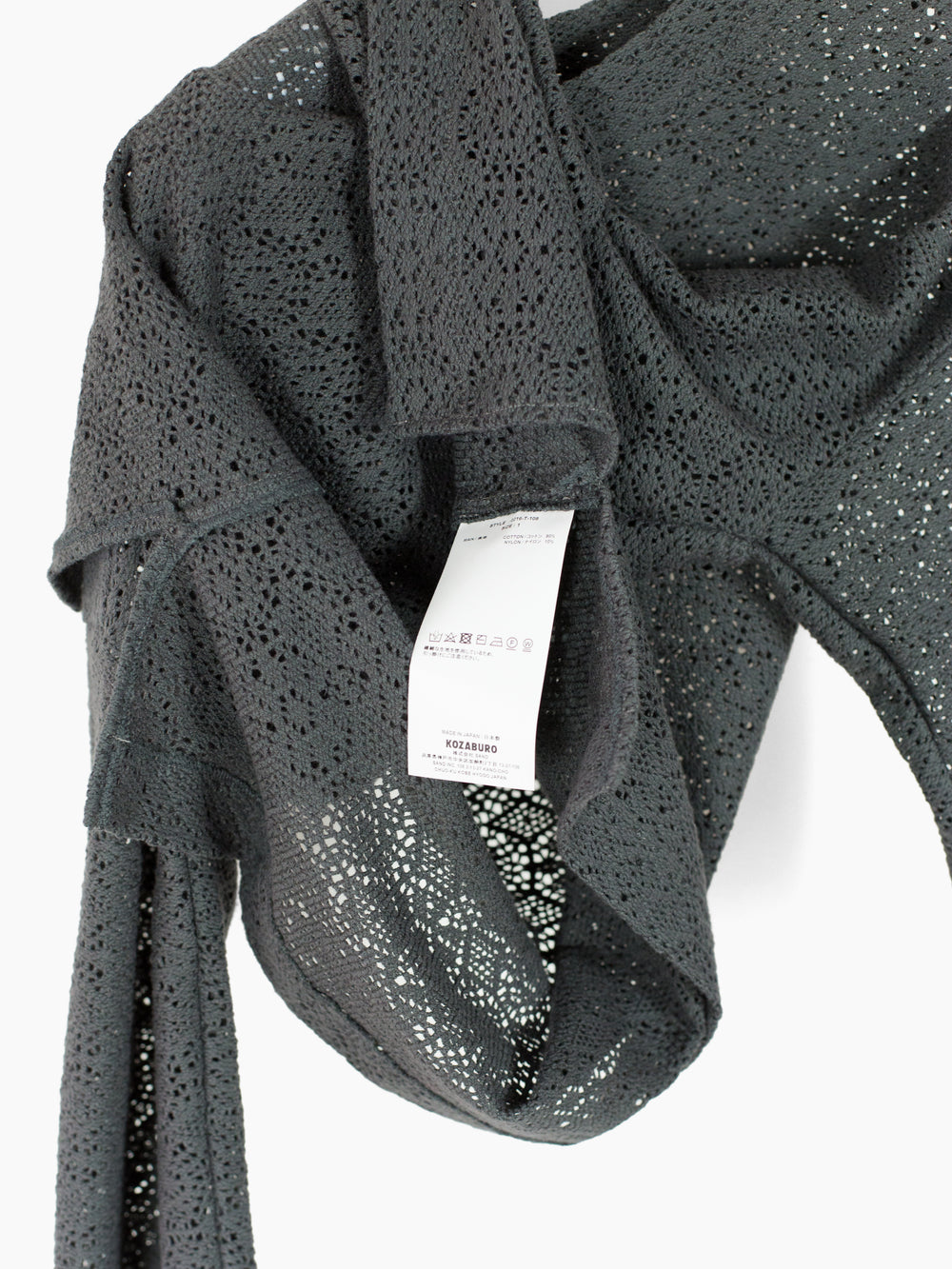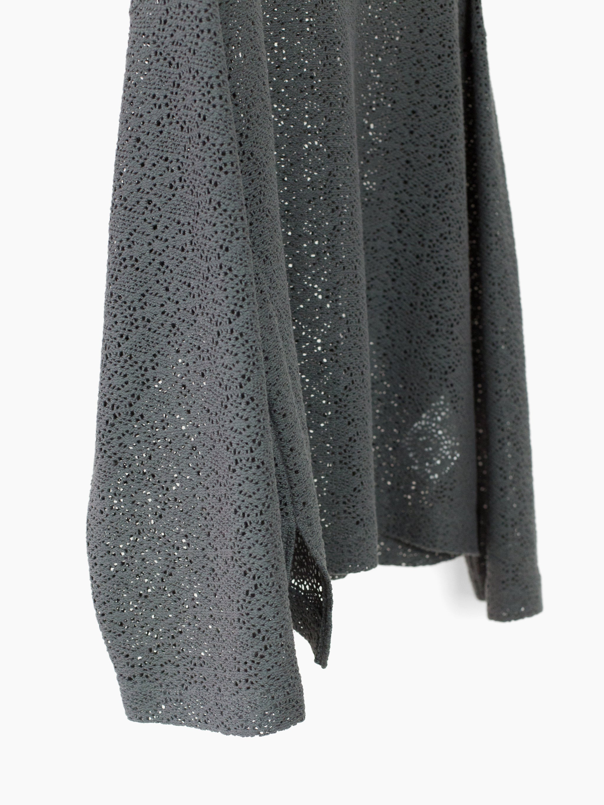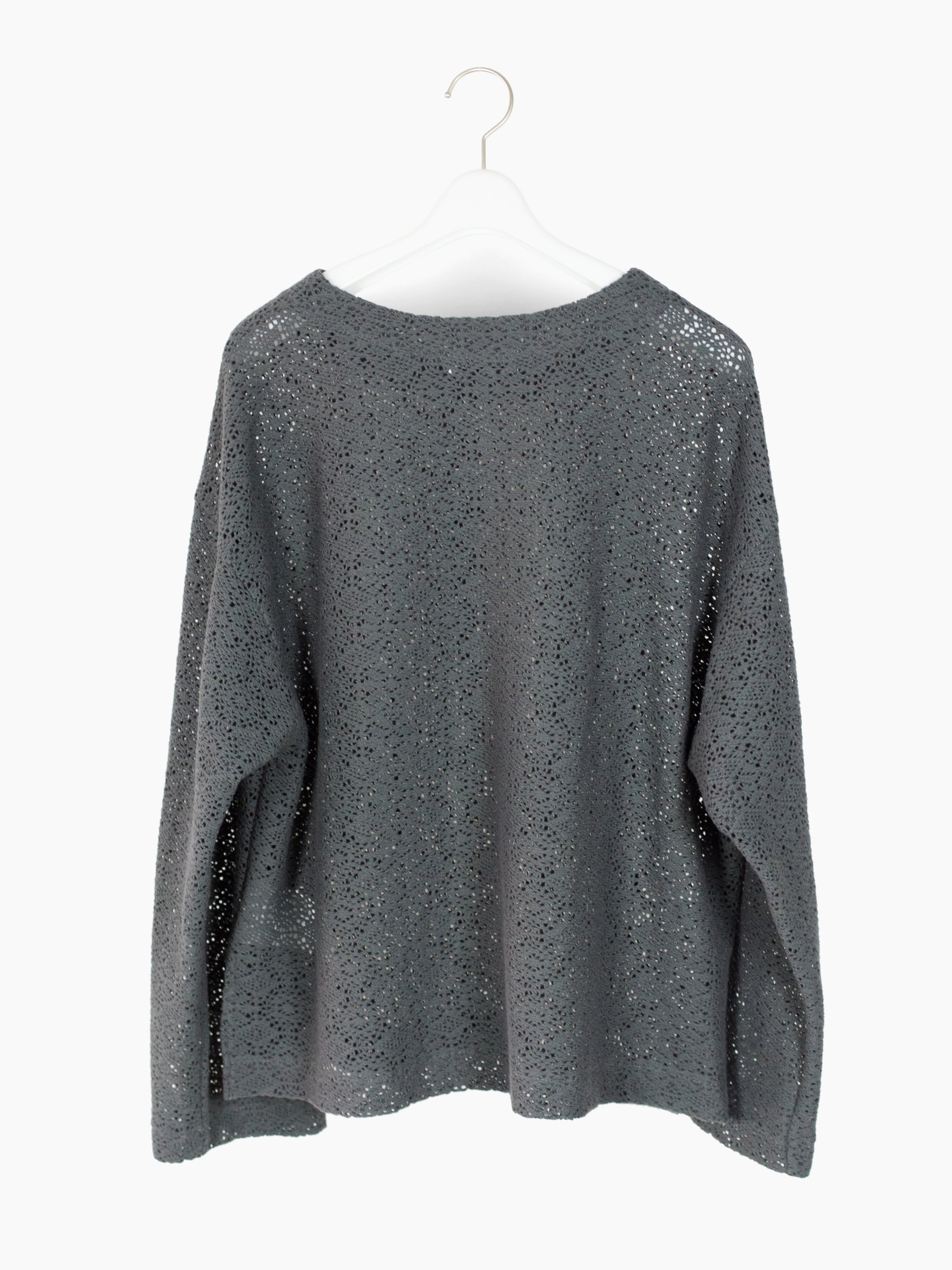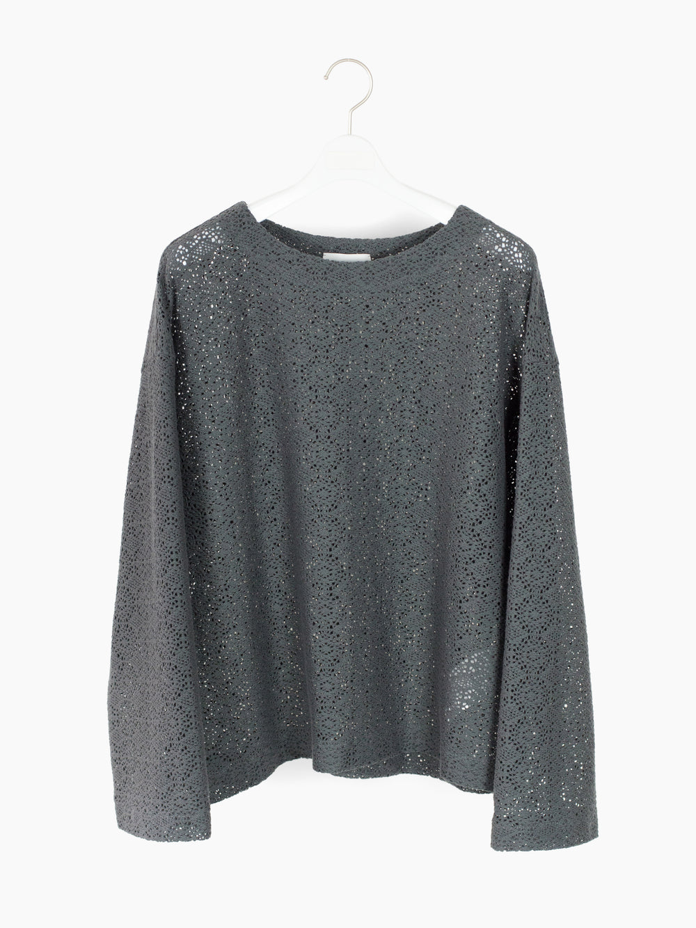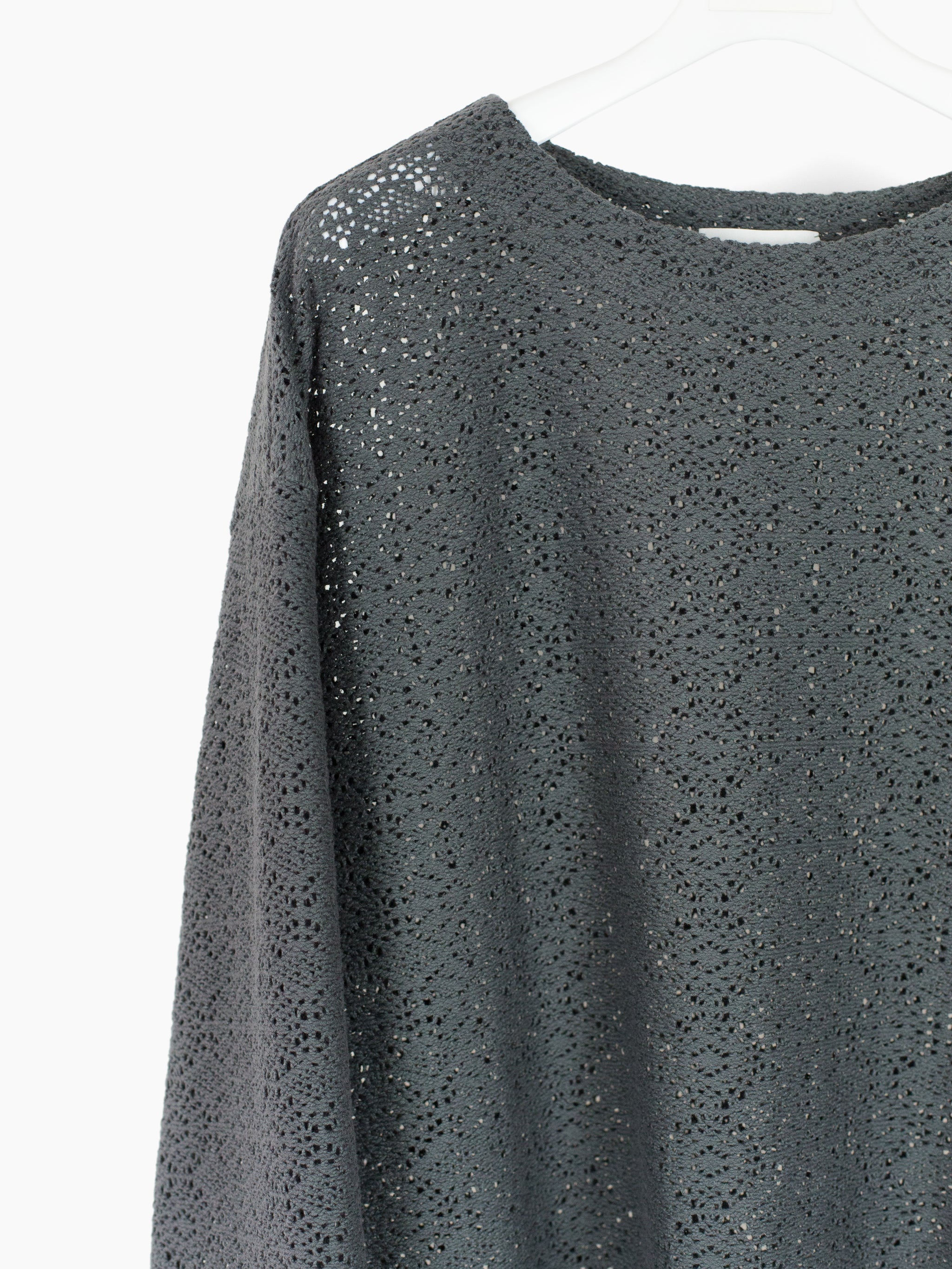 Open lacework longsleeve top. Wide, clean-finished neckline and side slits for maximum ease.
