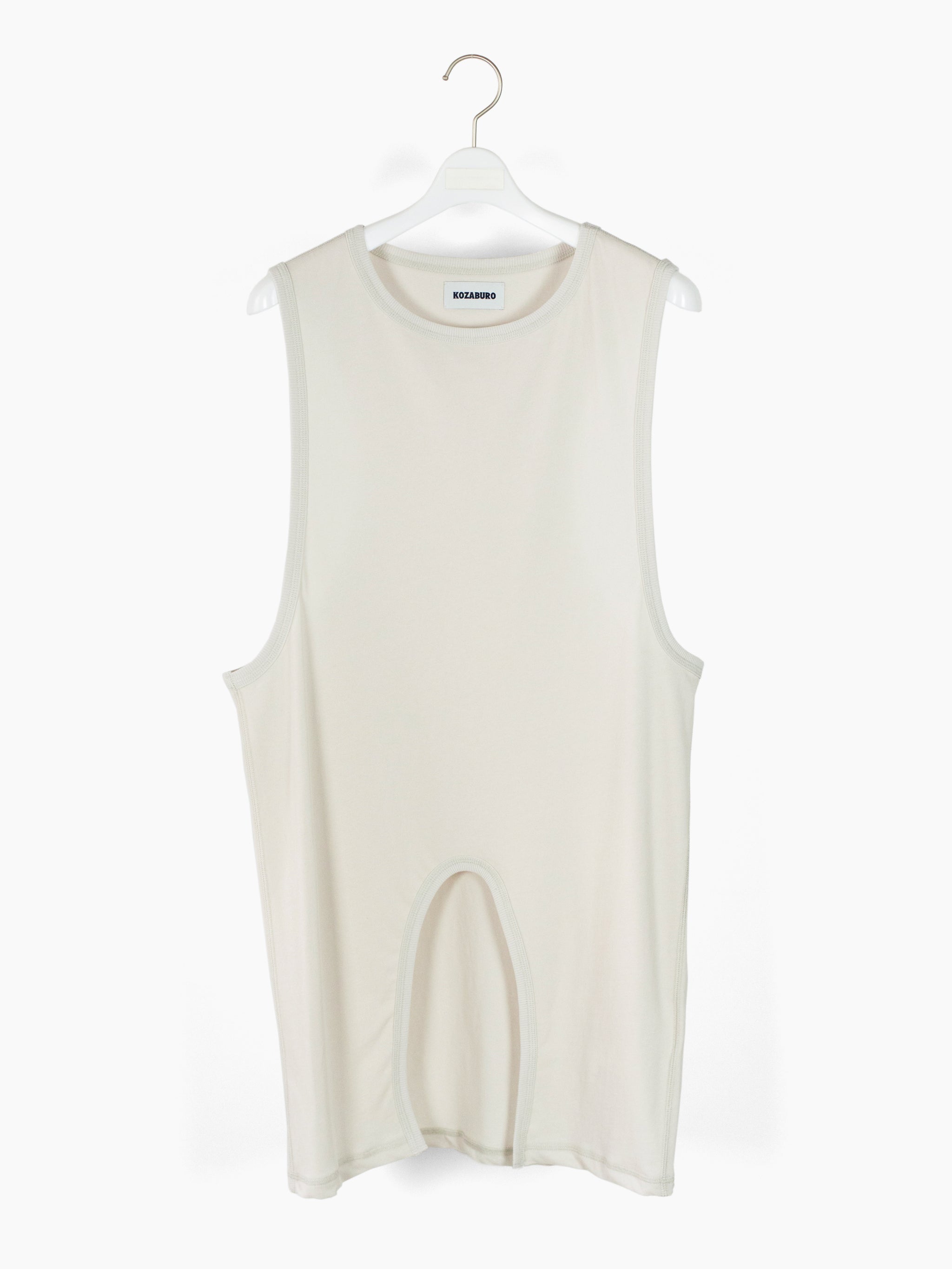 Elongated muscle tank cut with tabard-style low armholes and rib-finished front cutout to rest atop a belt buckle. Incredibly dry and open mercerized cotton knit makes for a smooth and breathable summer staple.
