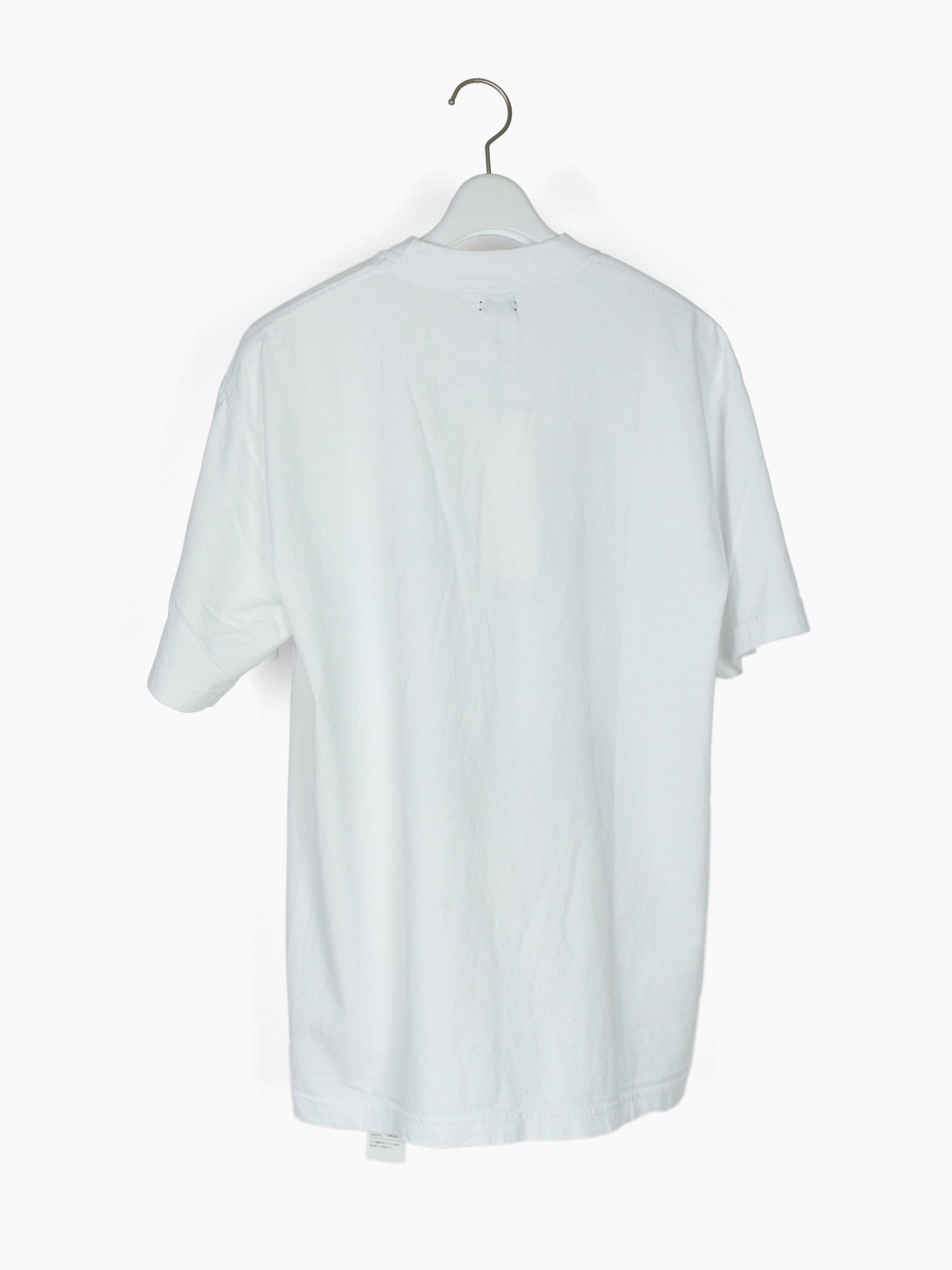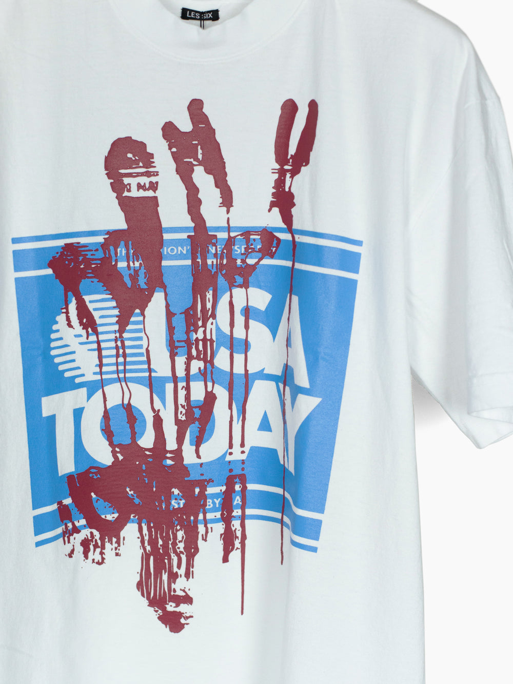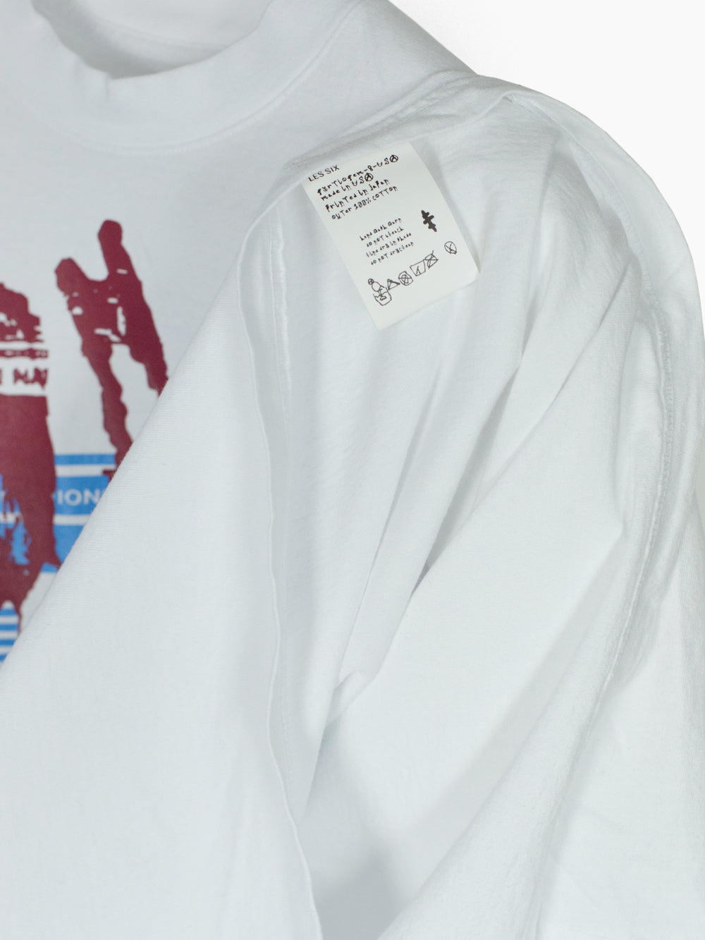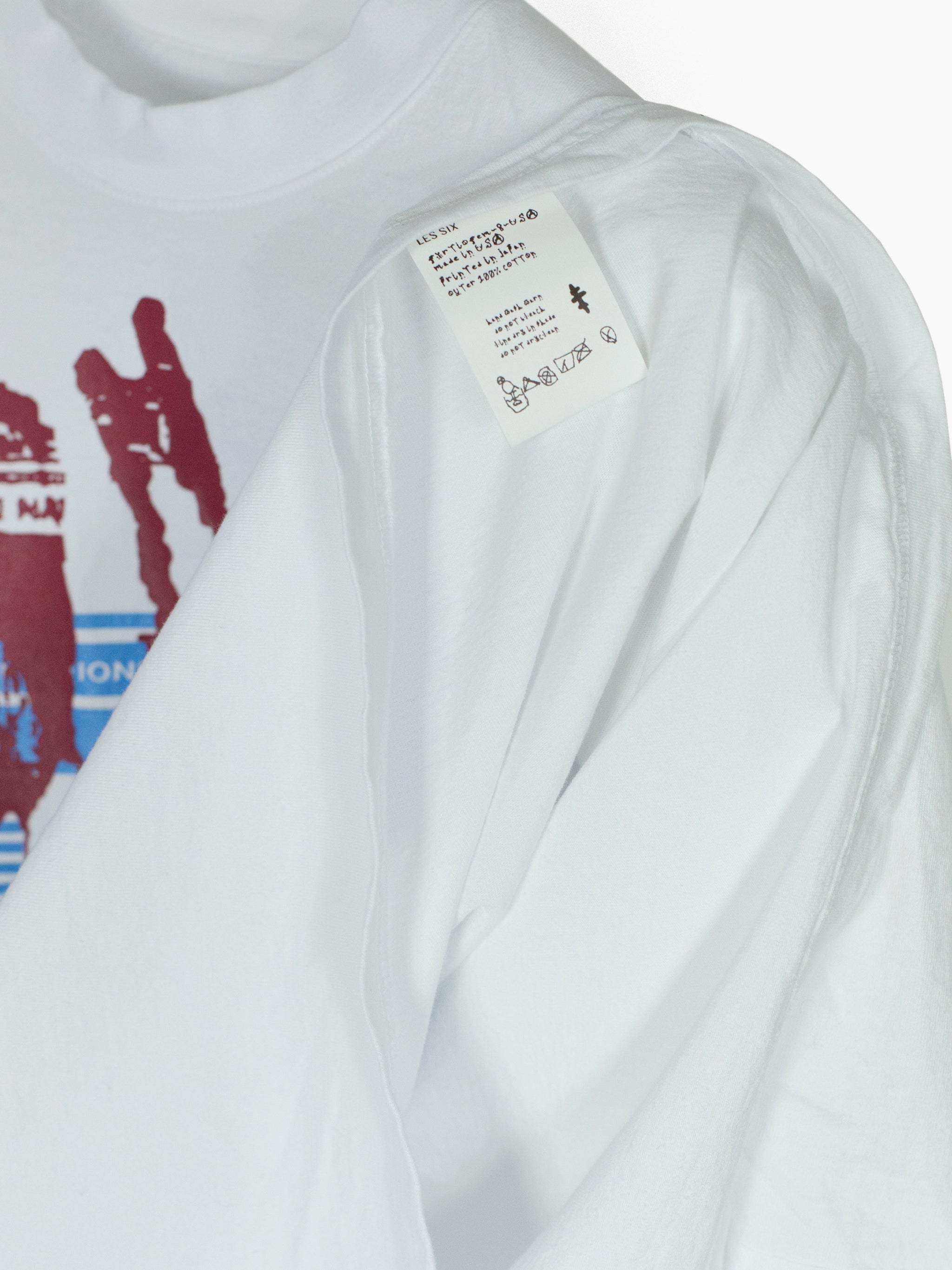 Circular knit (no side seam)t-shirt with Les Six braided charm at wearer's left hem.