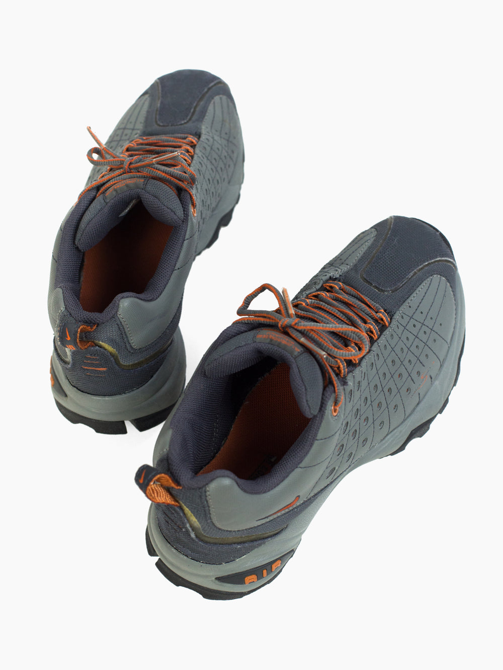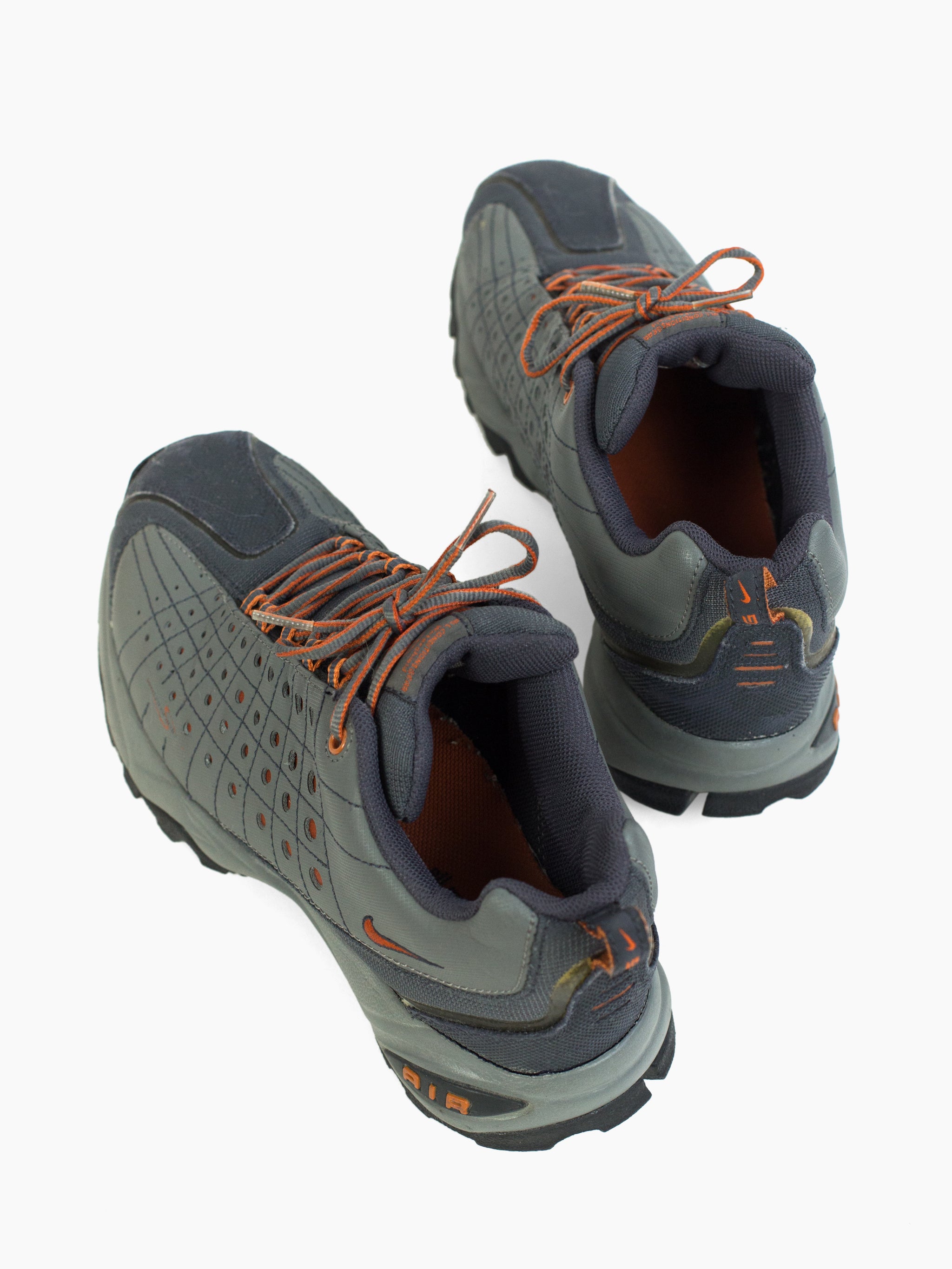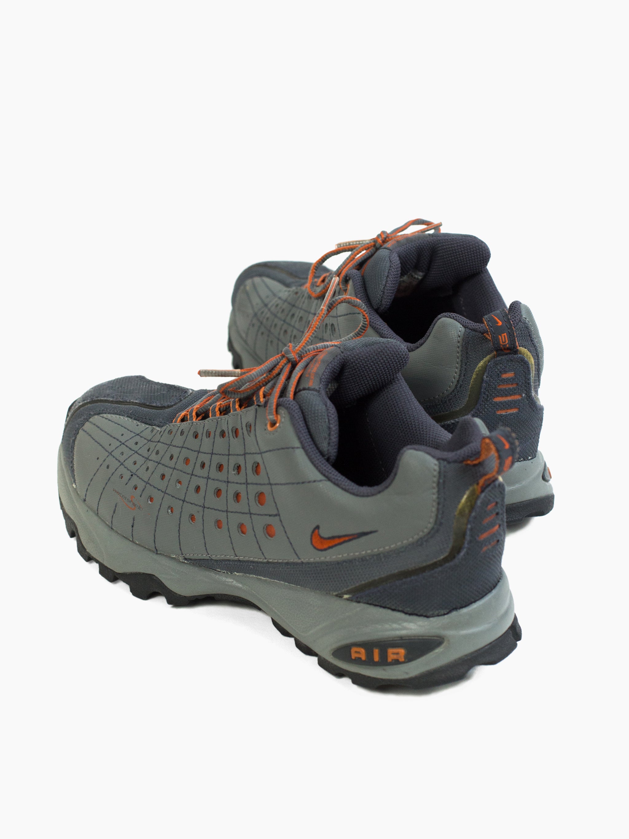 Futuristic yet rugged, these early 2000s Nike ACG sneakers are a rare and uncommon iteration of the BRS-1000. The upper is cut in different grey tones, punctuated with hits of rust orange set within the sweeping, aerodynamic lines that are emblematic of the early 2000s air max program. Instead of a visible air unit, these are set on a treaded ACG version of the BRS-1000 sole that brings an air of ruggedness to an otherwise incredibly streamlined sneaker. The result feels fresh and relevant to this day.