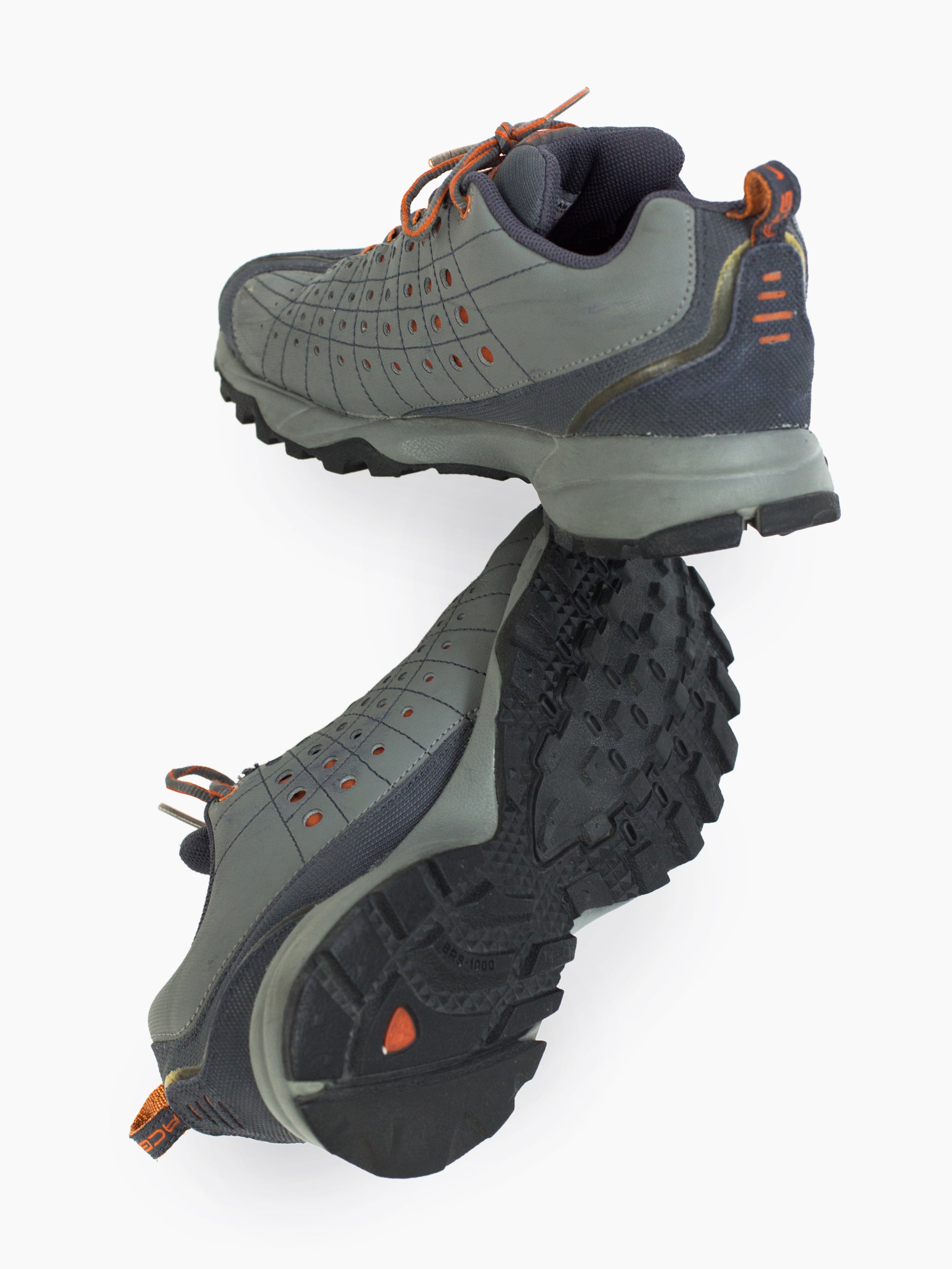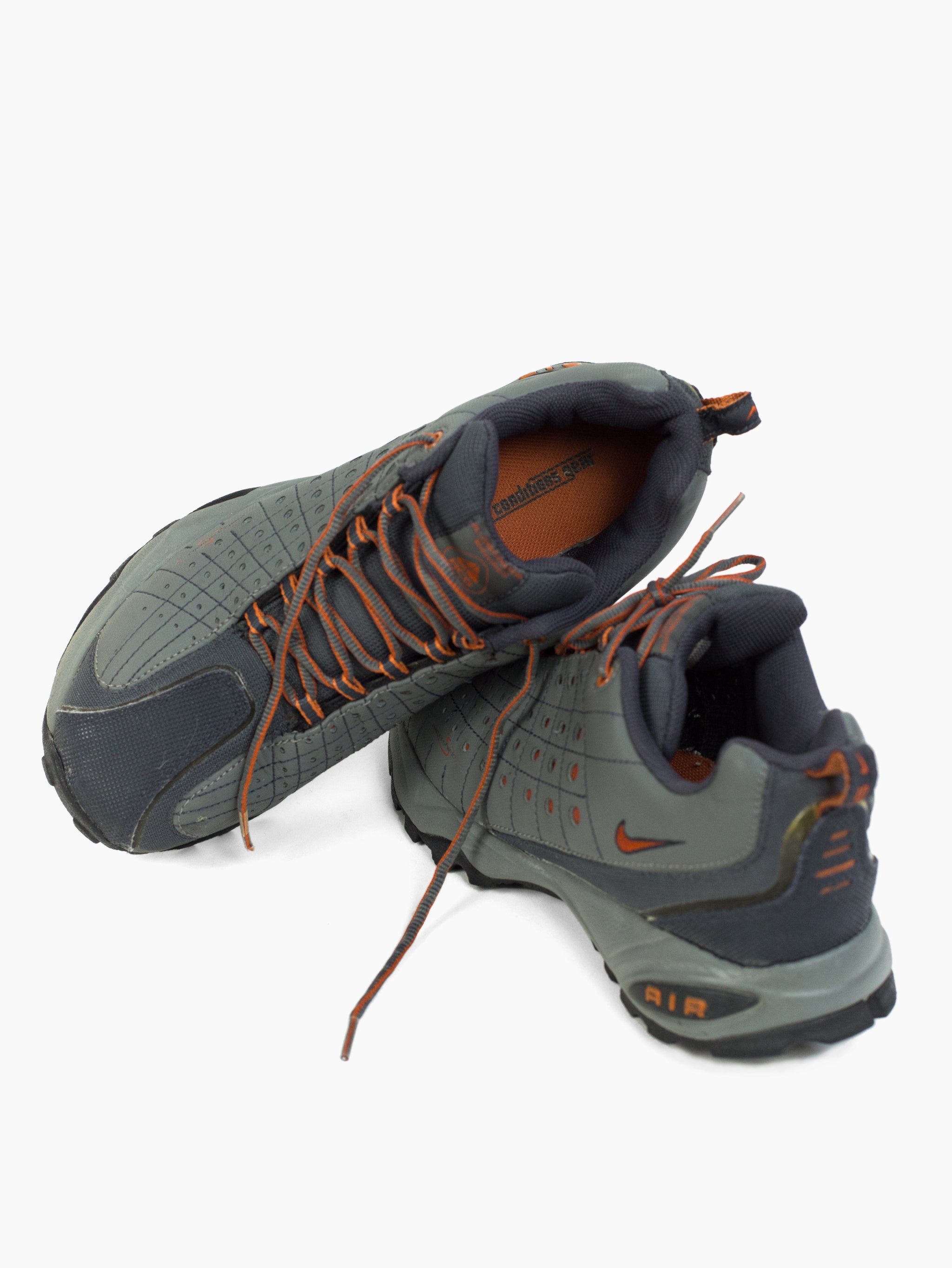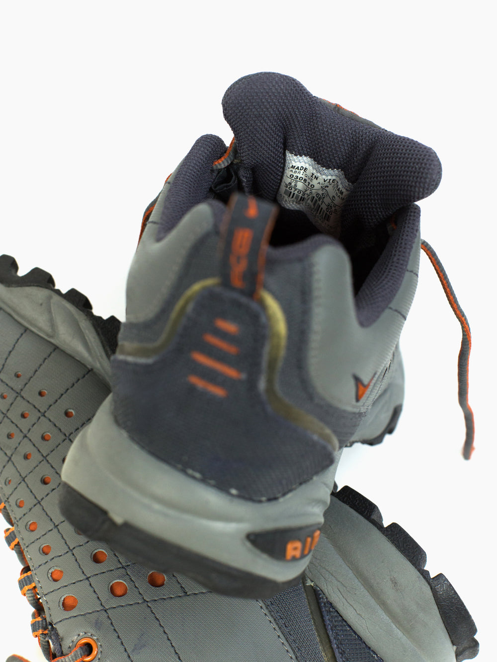 Futuristic yet rugged, these early 2000s Nike ACG sneakers are a rare and uncommon iteration of the BRS-1000. The upper is cut in different grey tones, punctuated with hits of rust orange set within the sweeping, aerodynamic lines that are emblematic of the early 2000s air max program. Instead of a visible air unit, these are set on a treaded ACG version of the BRS-1000 sole that brings an air of ruggedness to an otherwise incredibly streamlined sneaker. The result feels fresh and relevant to this day.