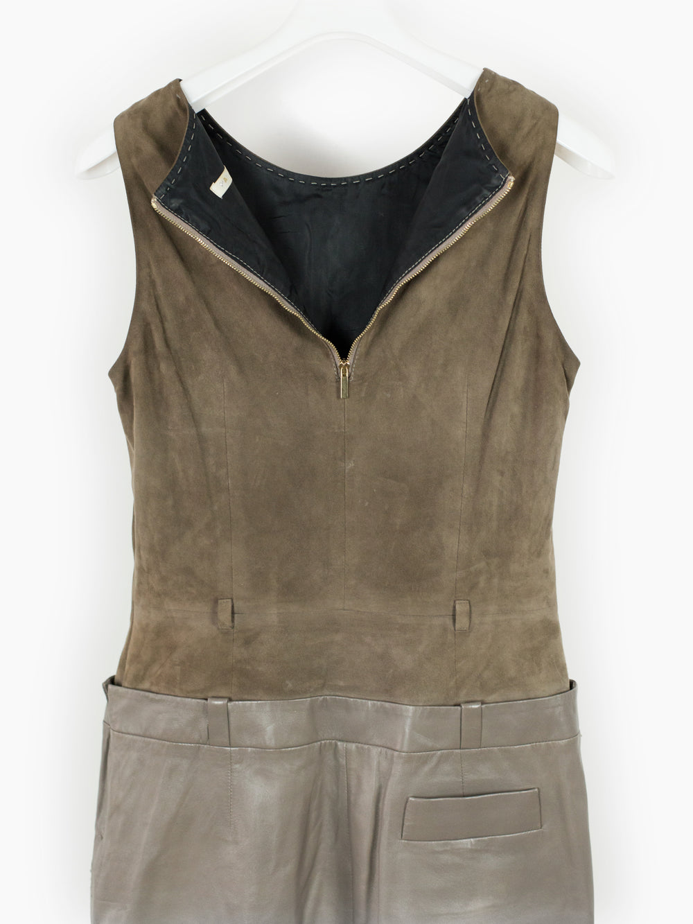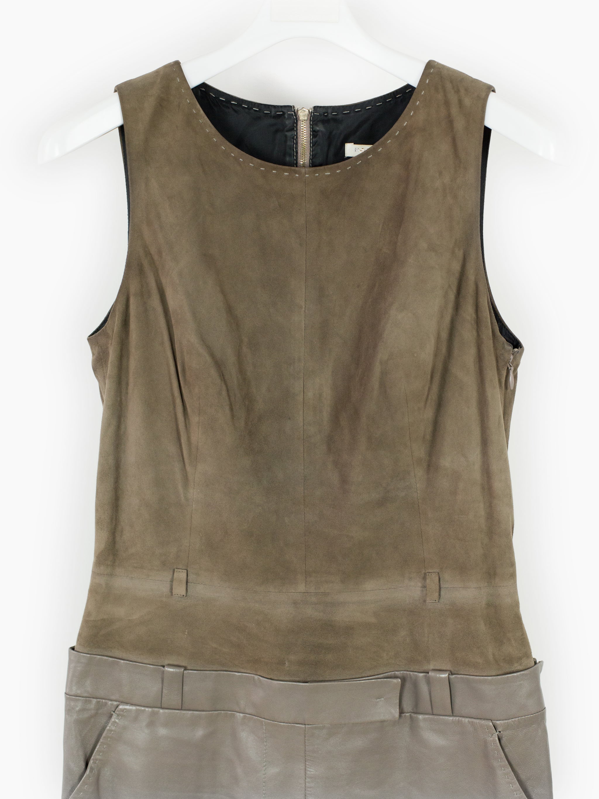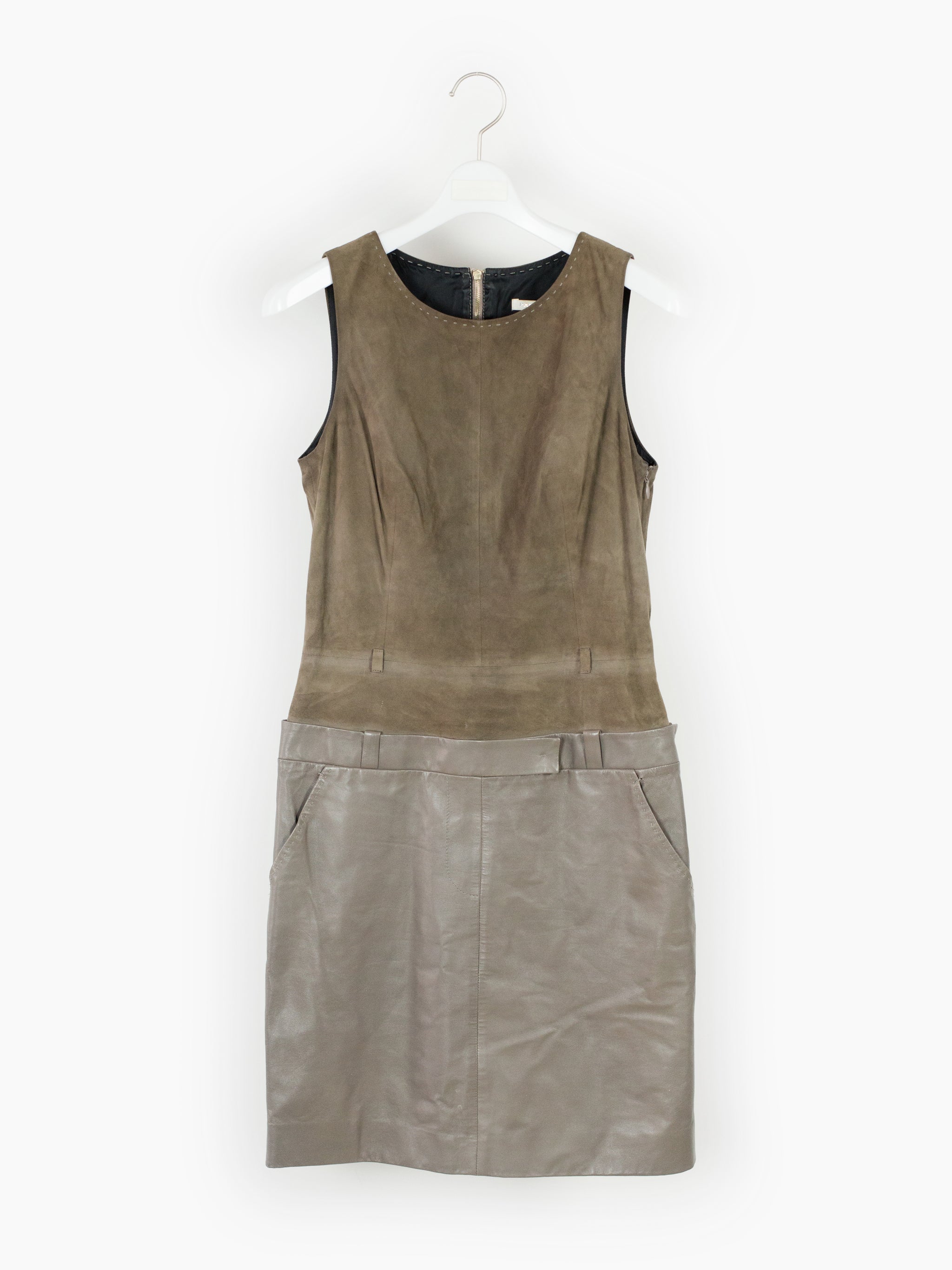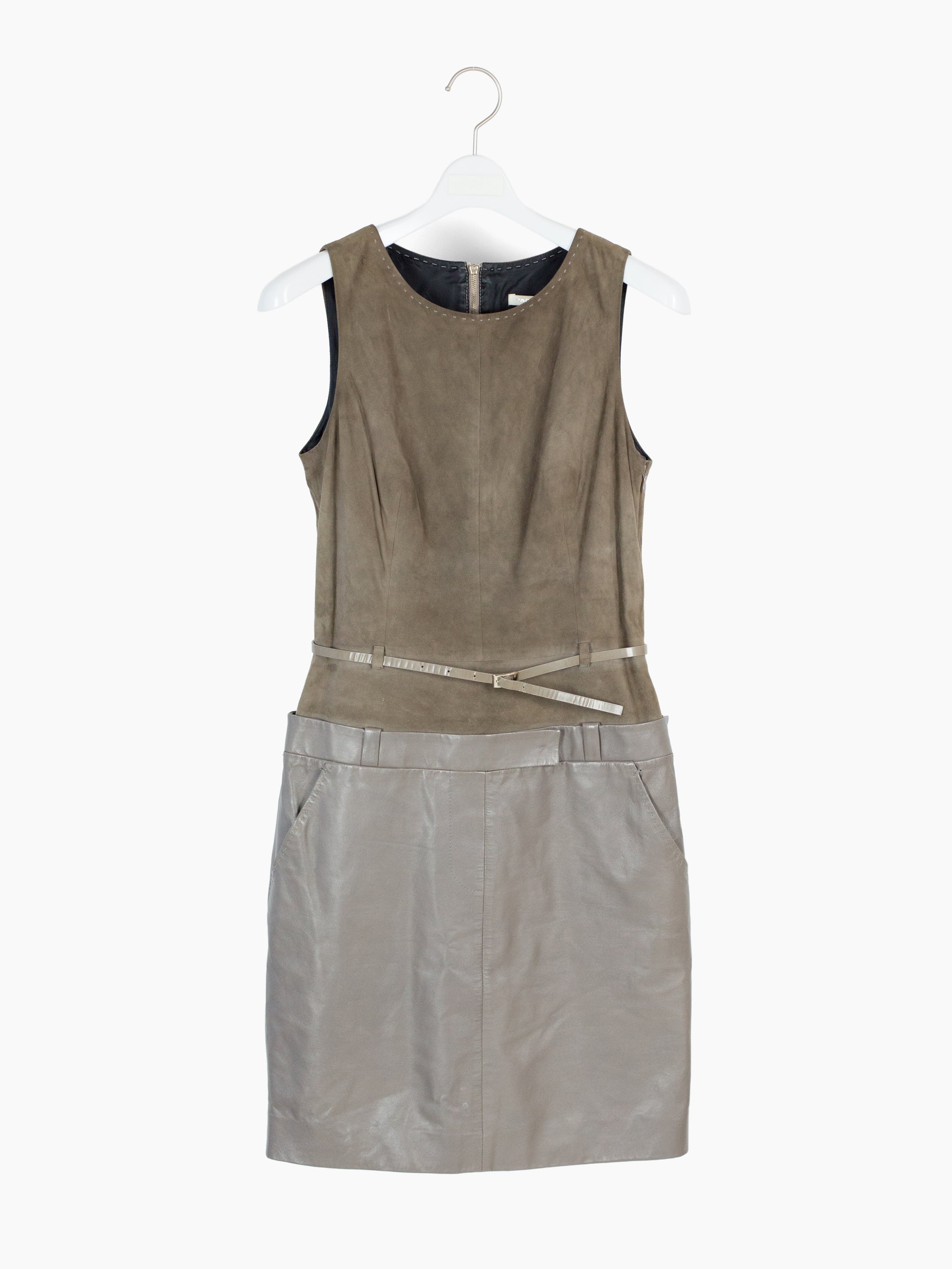 Contrast suede/leather midi dress with trompe l'oeil layered top + skirt look. Invisible zip side closure on wearer's left with hook and eye fastening at underarm and hip. Included belt. Fully lined.