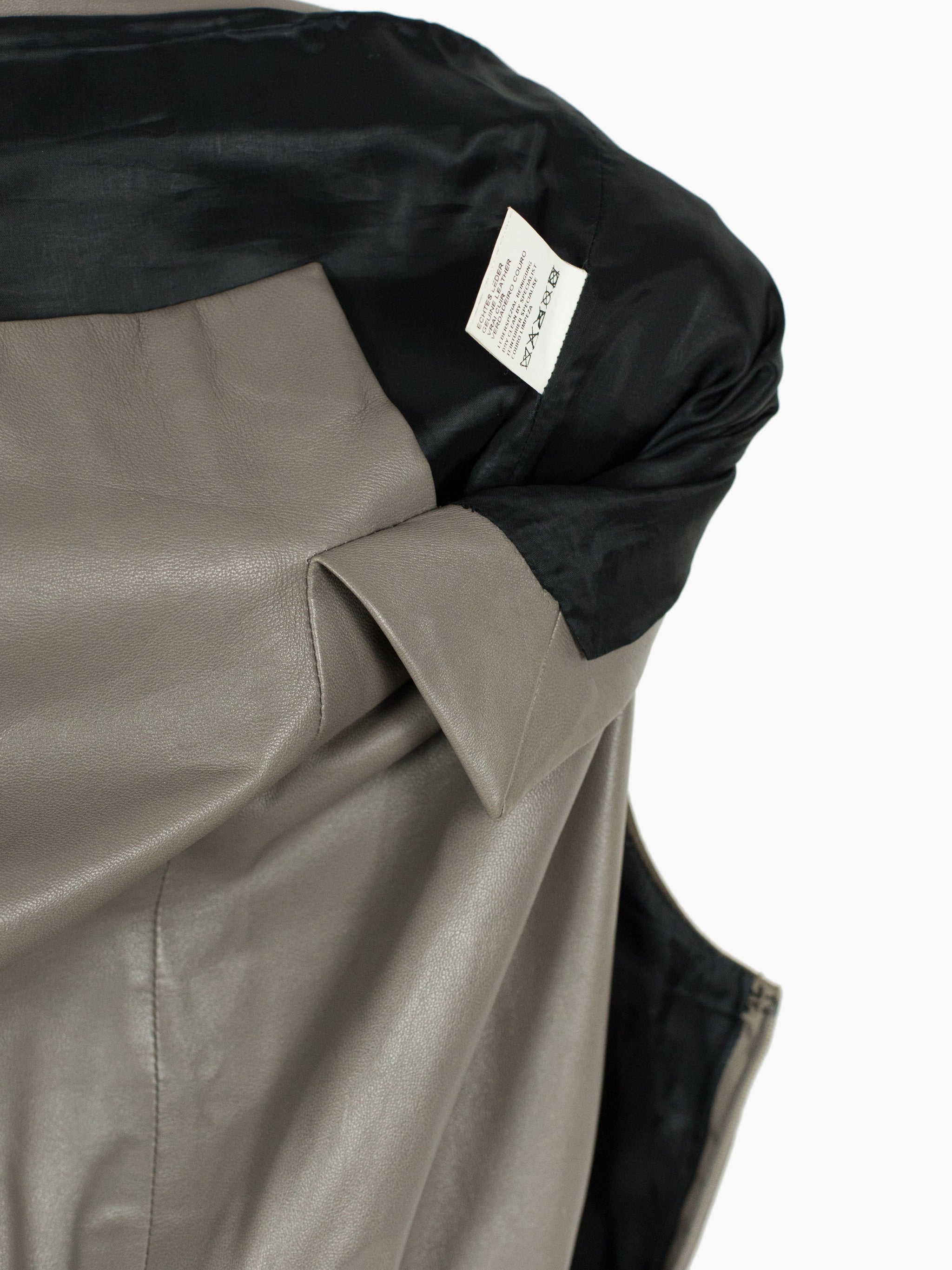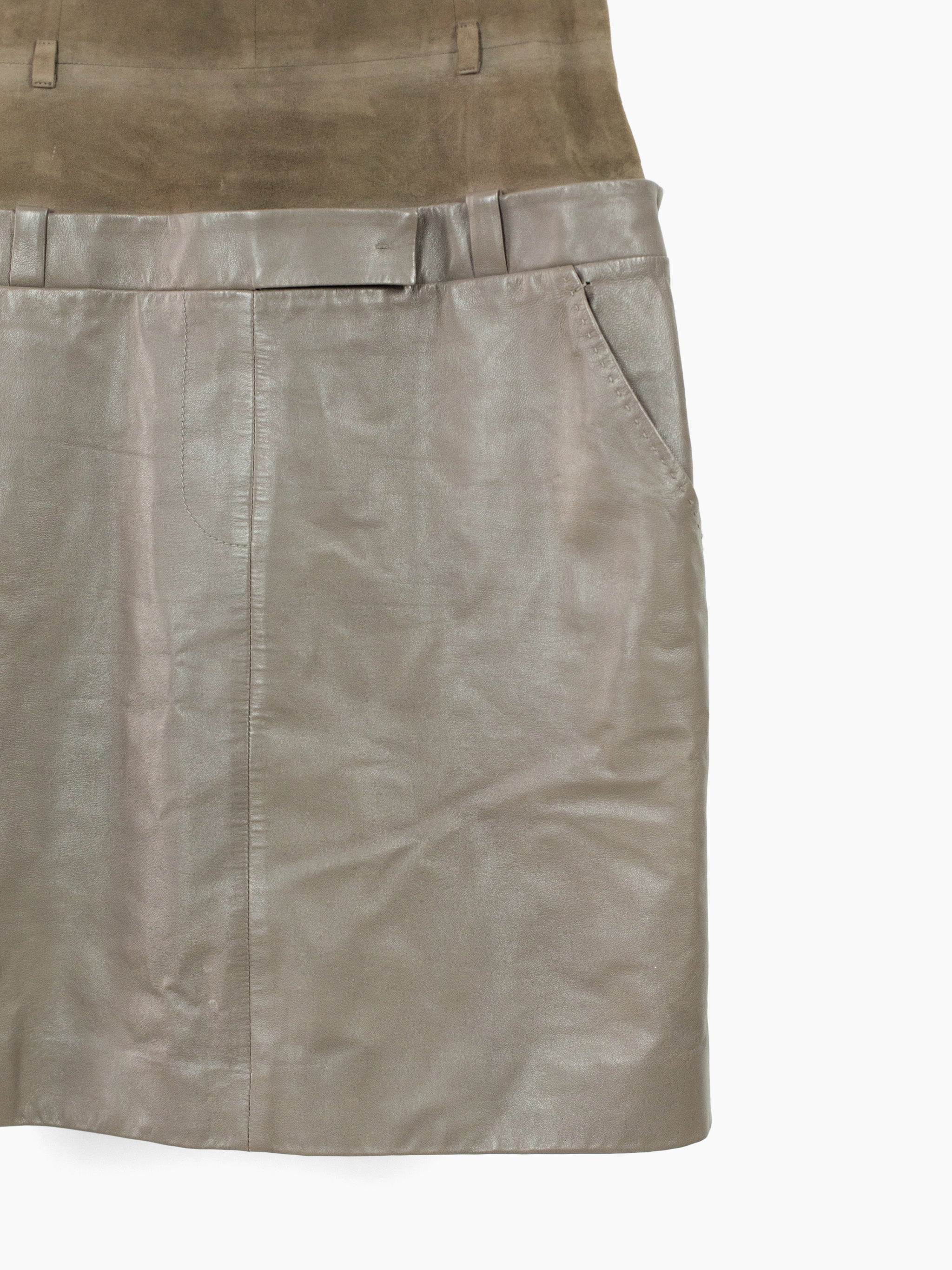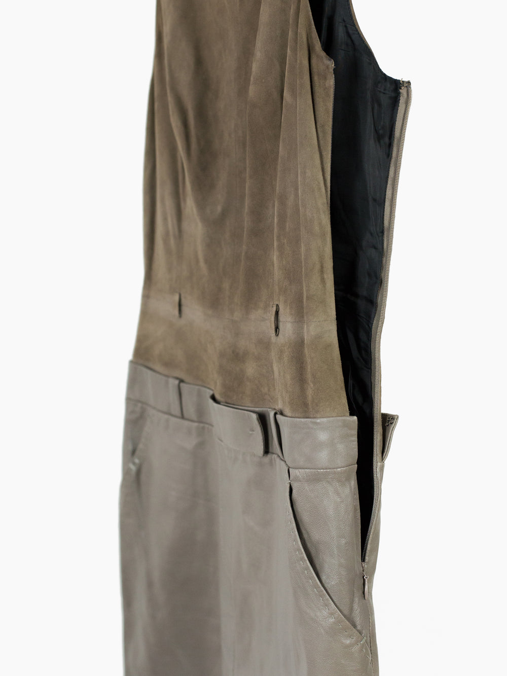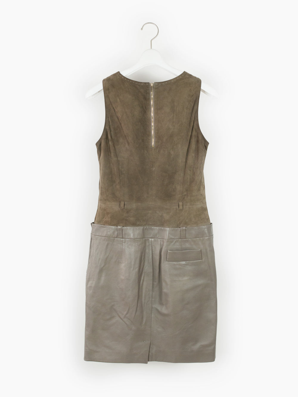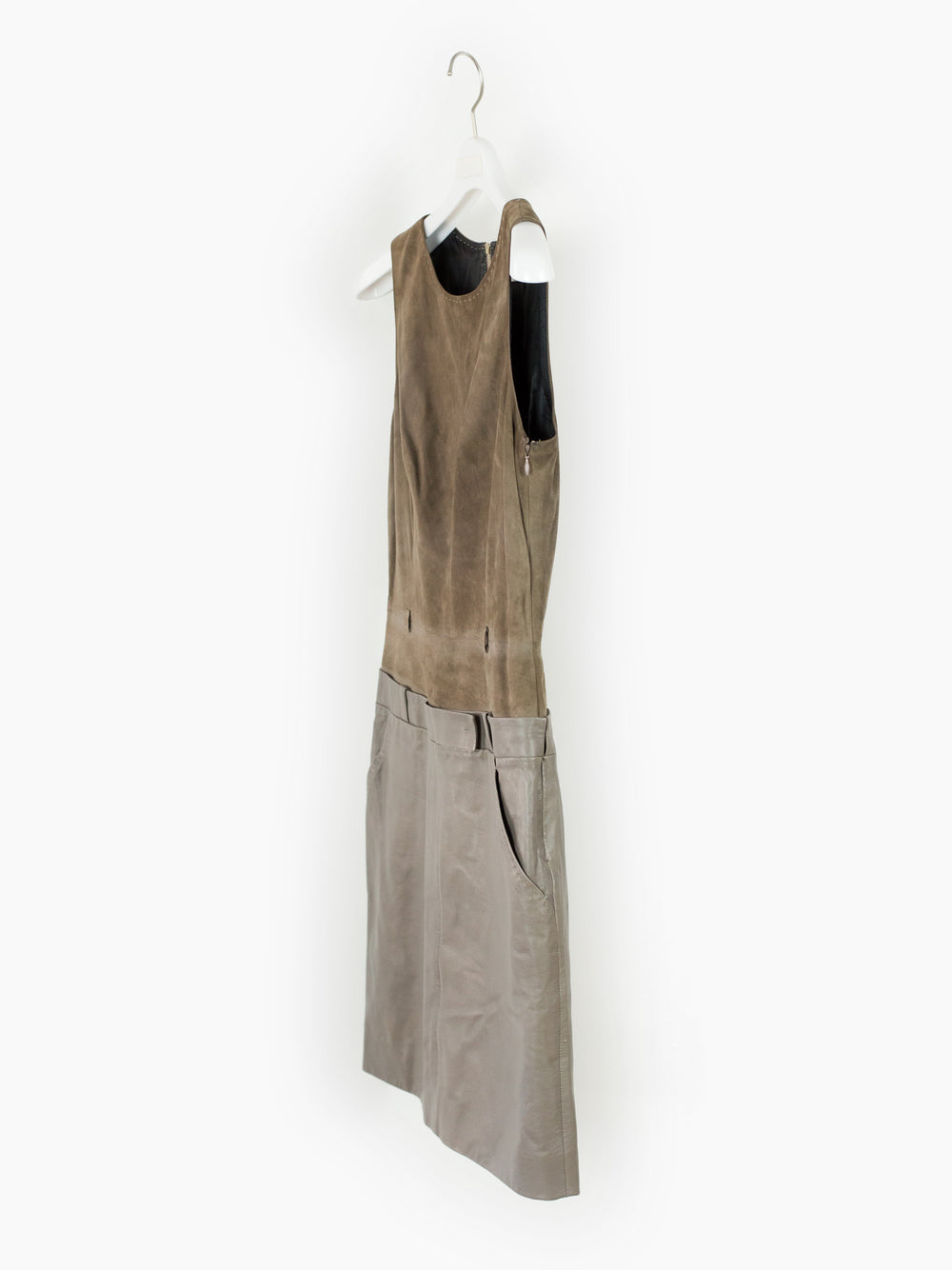 Contrast suede/leather midi dress with trompe l'oeil layered top + skirt look. Invisible zip side closure on wearer's left with hook and eye fastening at underarm and hip. Included belt. Fully lined.