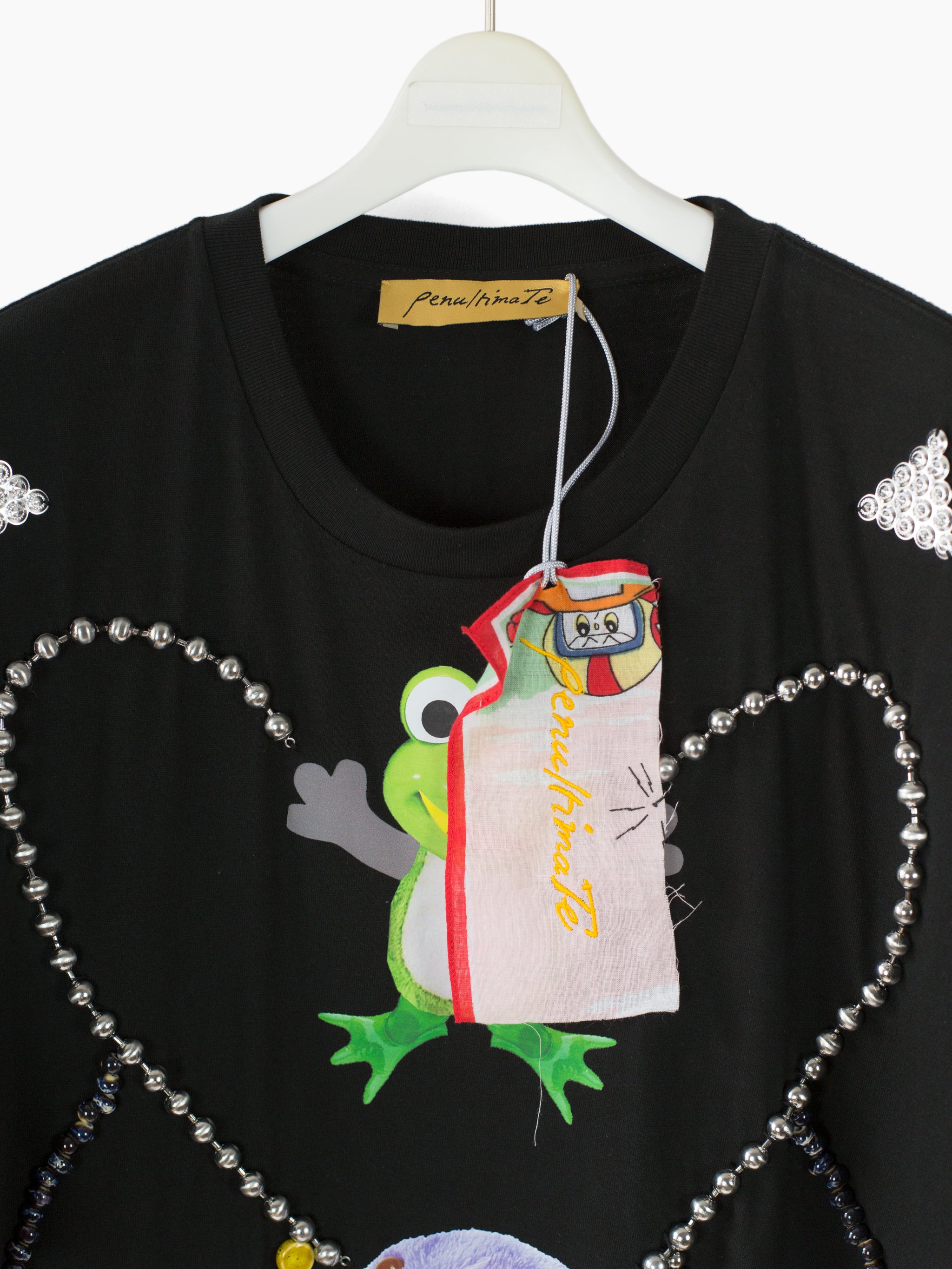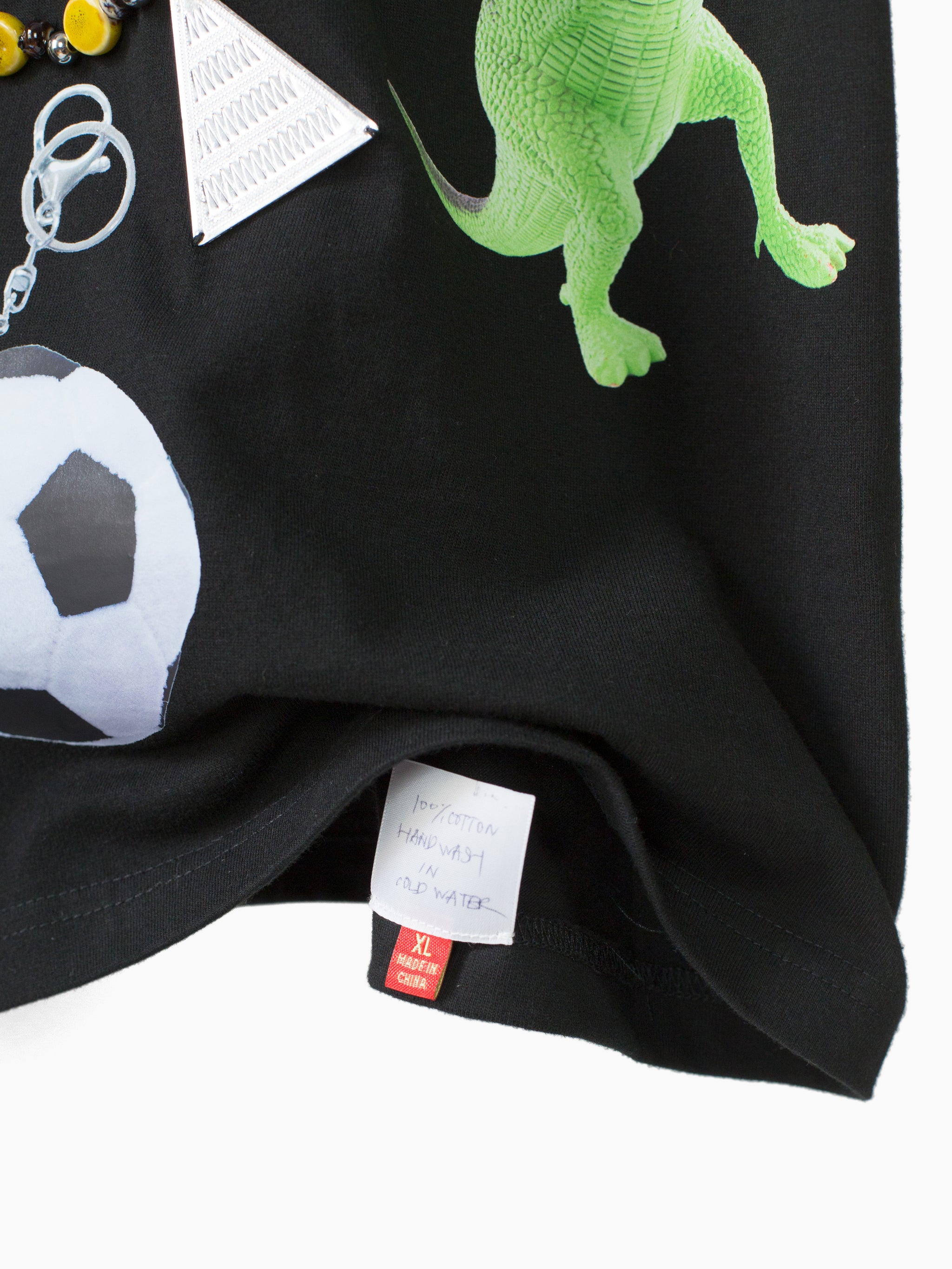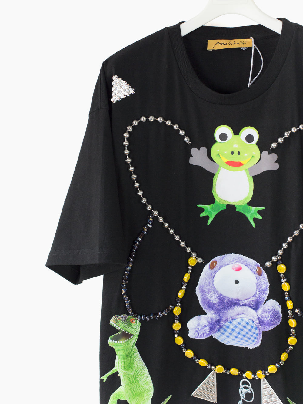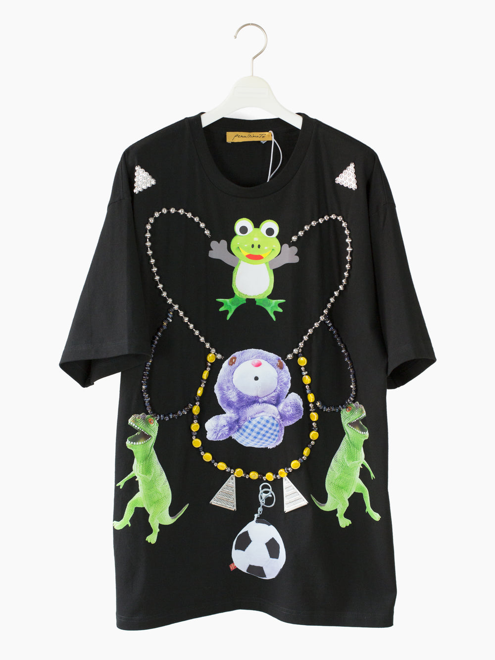 T-shirt with seasonal 'Chinese Toy Story' hand-cut vinyl print graphics, with traditional beaded chains and metal plate detailing forming a trompe l'oeil 'necklace' that encircles the toys. Composition mimics the actual chandelier toy necklaces that served as centerpieces for the lookbook.