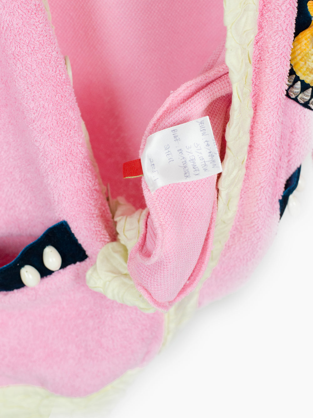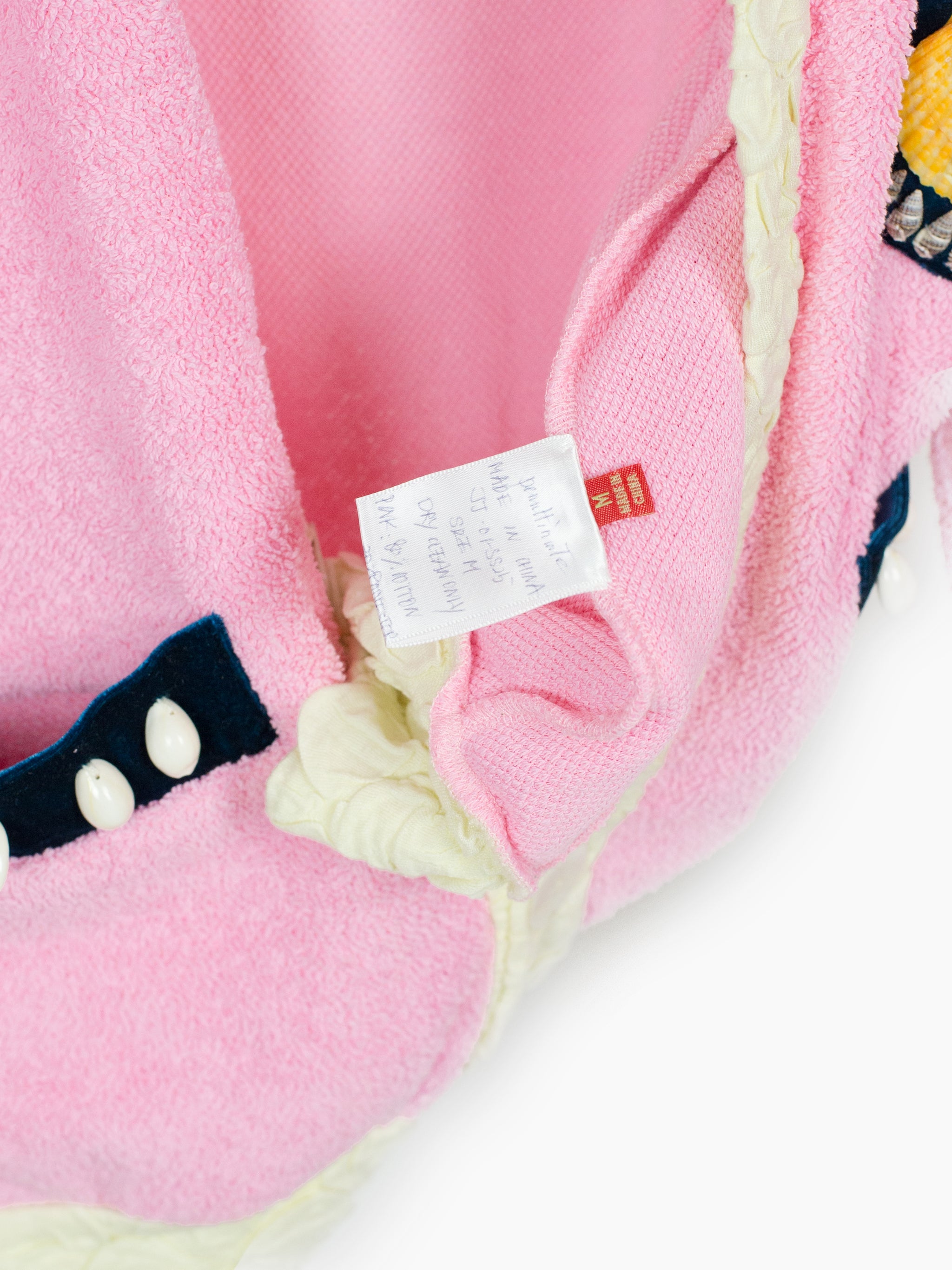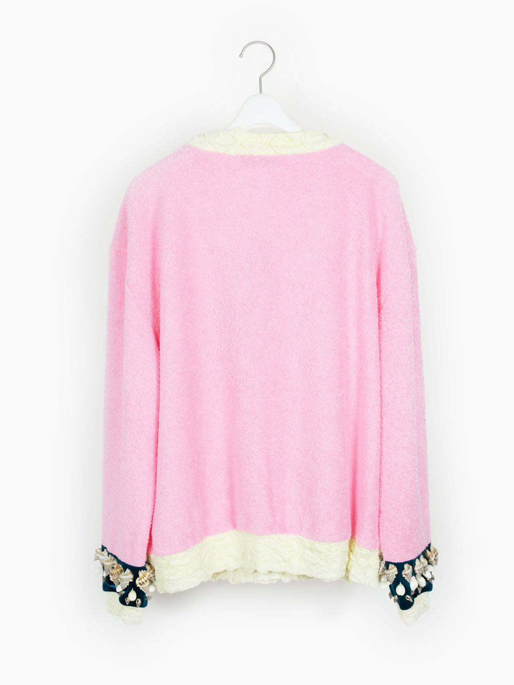 Pink towel terry cardigan with ruffled white and navy velour trim. Hand sewn shell details at cuffs, chest, and waist pocket welts.