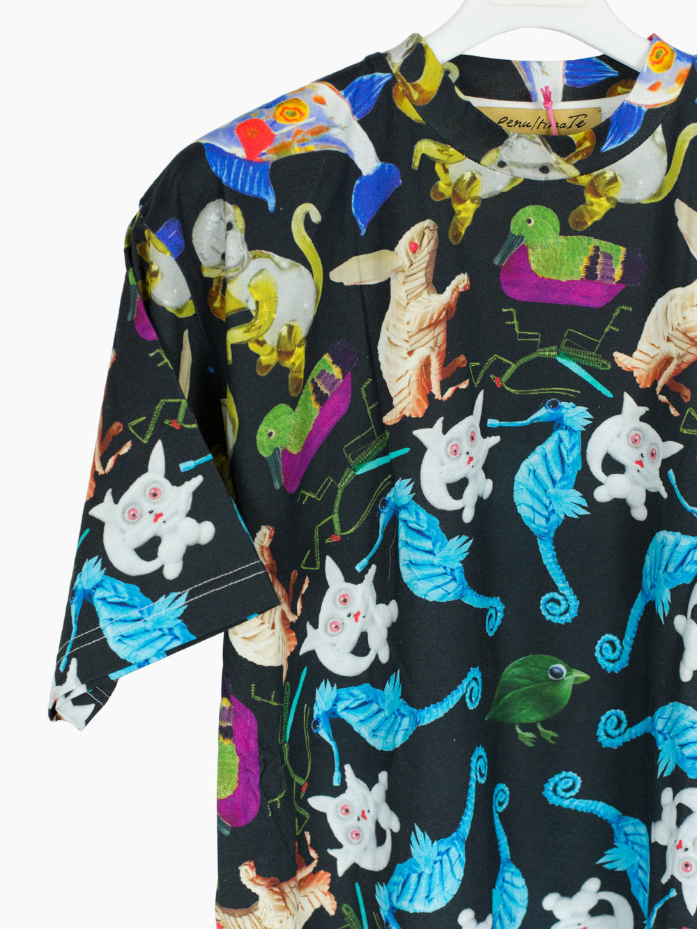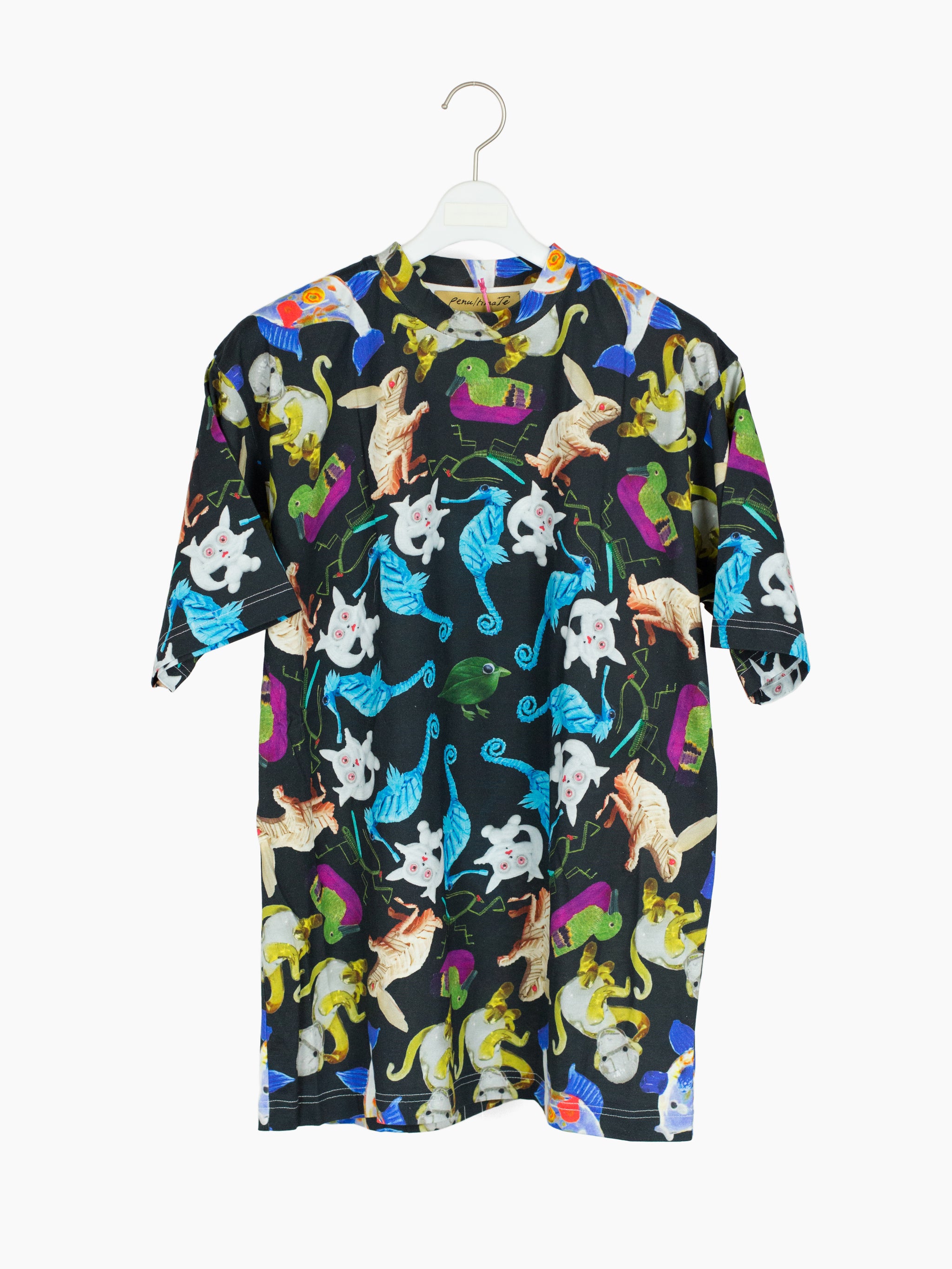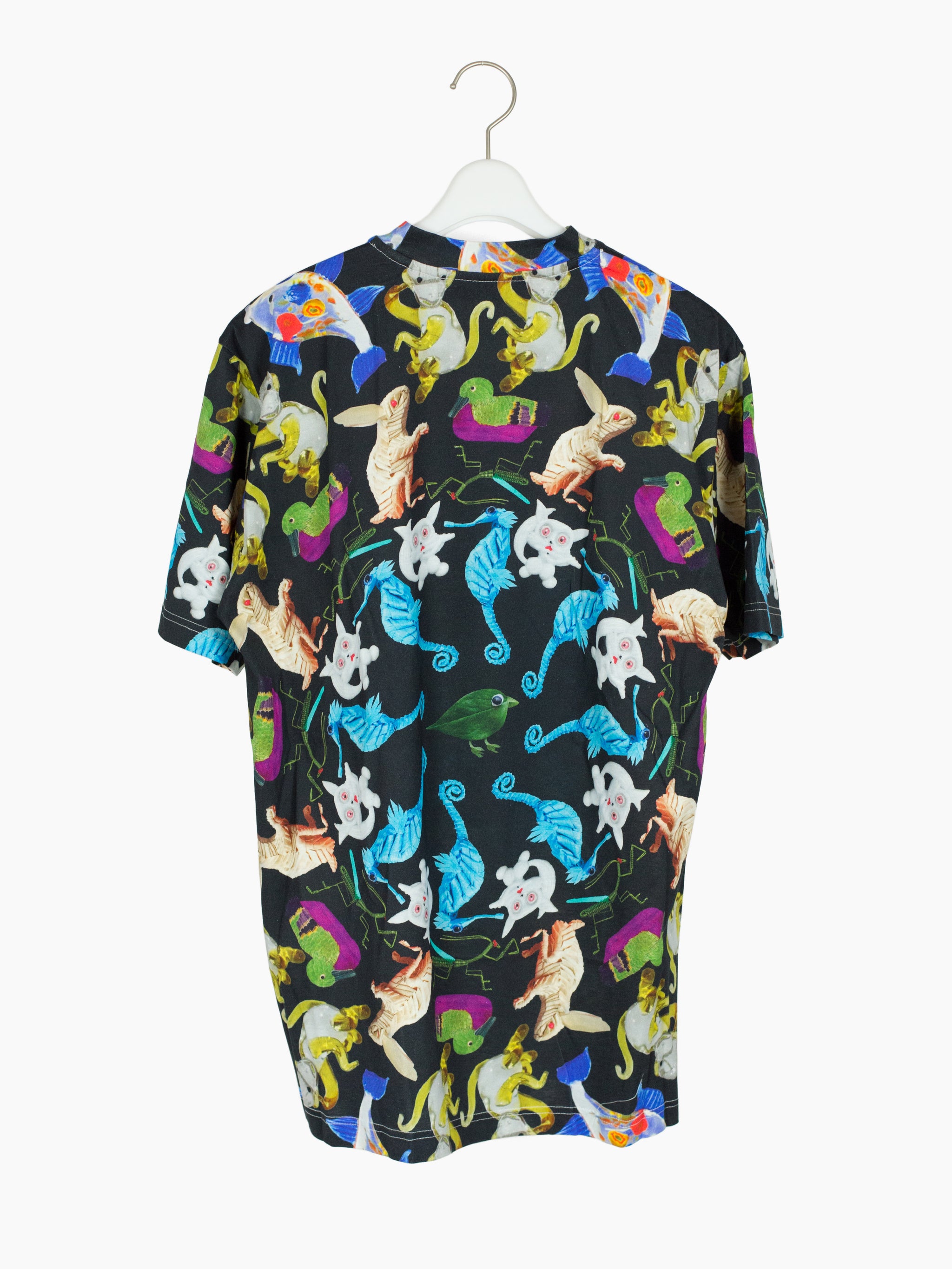 Radial print short sleeve tee featuring creatures that are uncannily familiar yet otherworldly. Exaggerated vibrant and saturated color for a psychedelic effect. Lightweight supple cotton wears smooth to the touch.