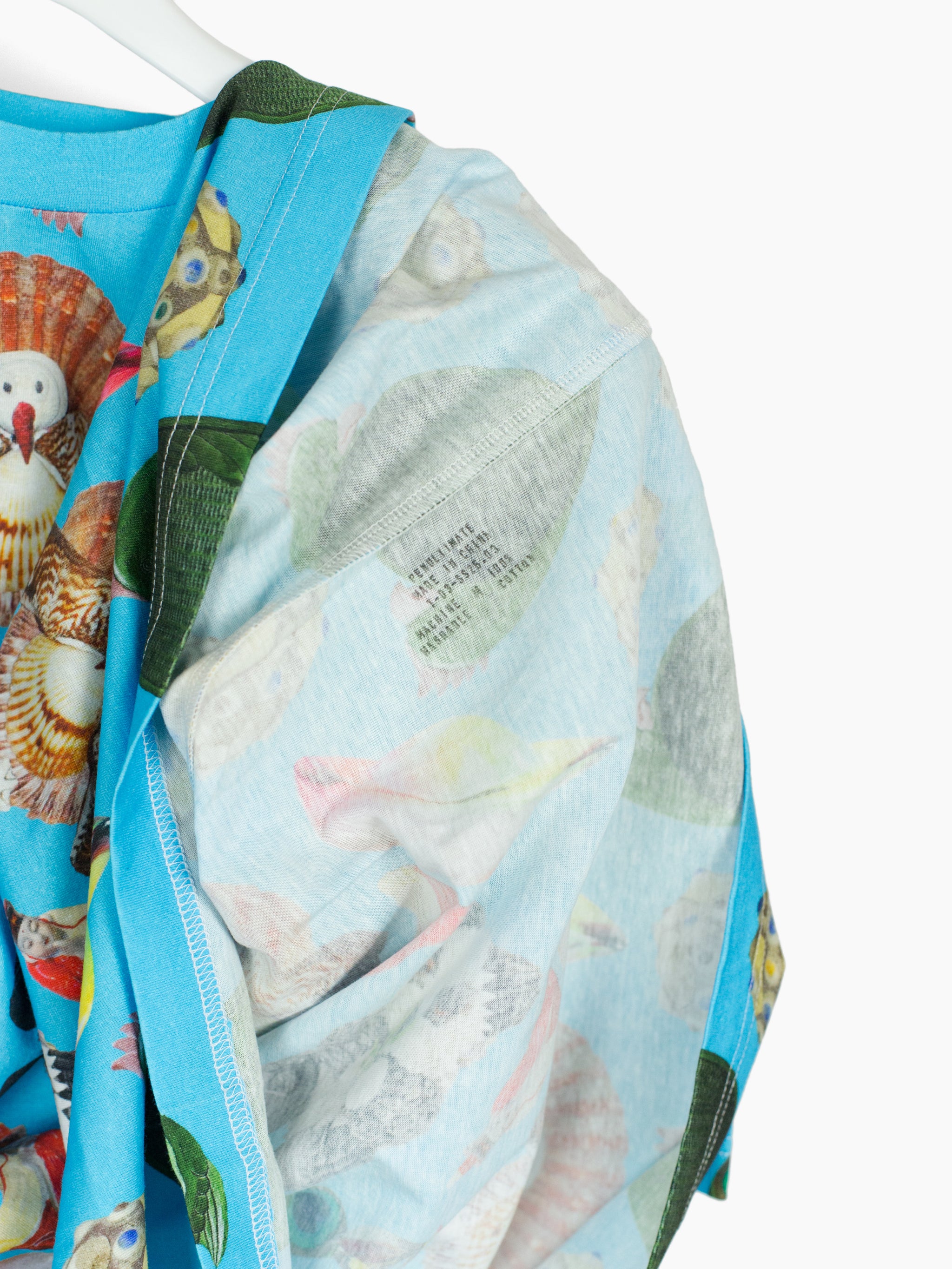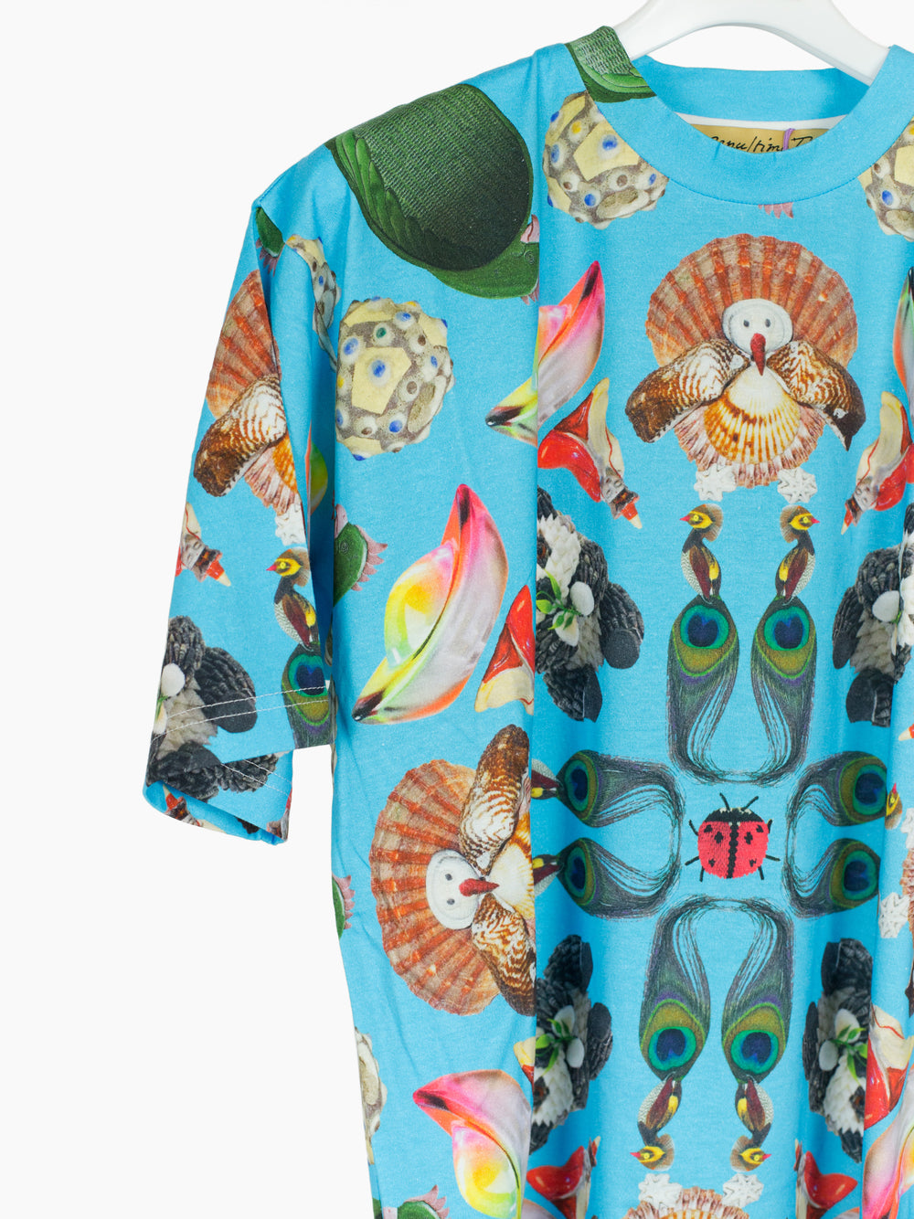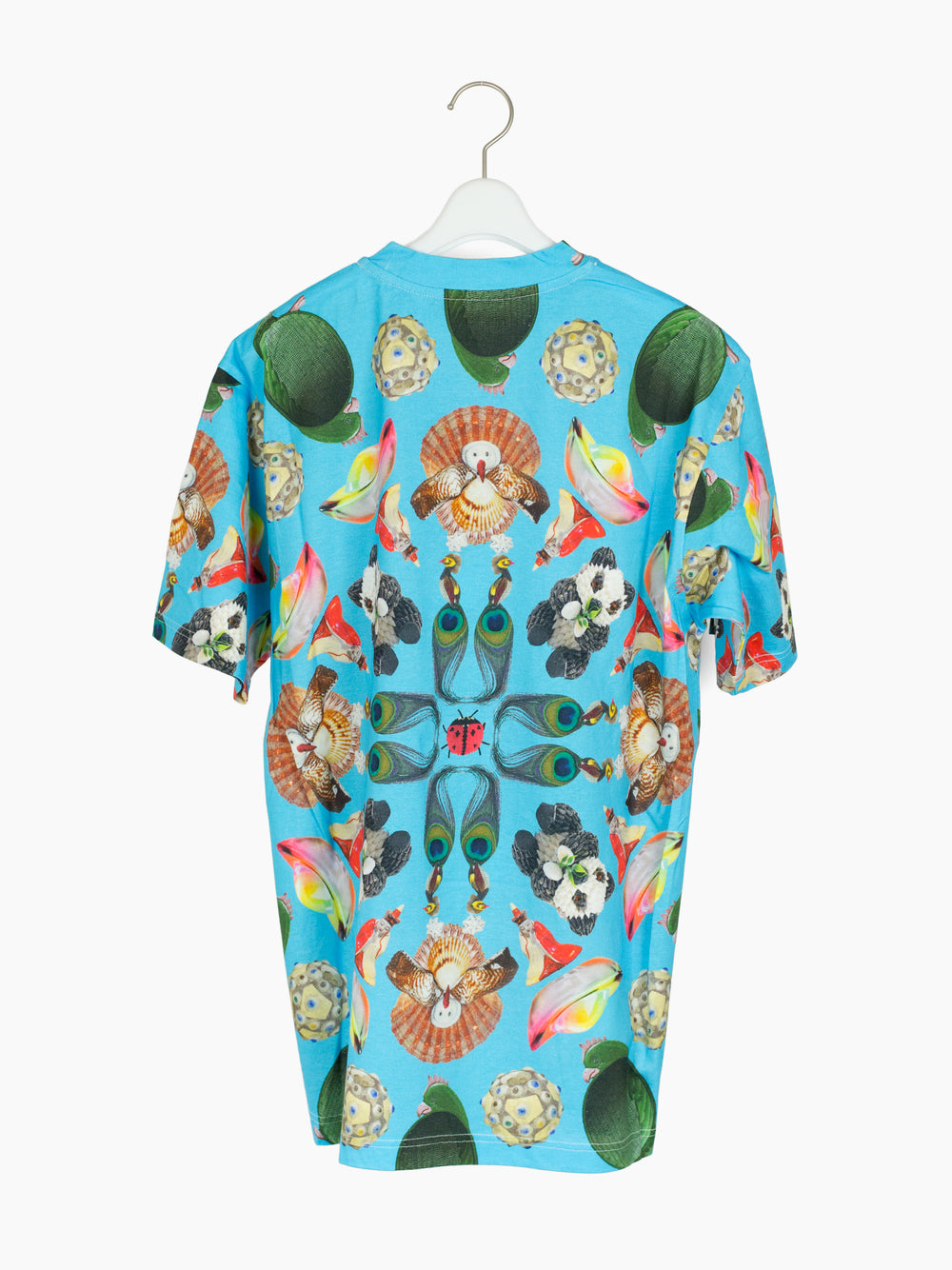 Radial print short sleeve tee featuring creatures and objects that are uncannily familiar yet otherworldly. Exaggerated vibrant and saturated color for a psychedelic effect. Lightweight supple cotton wears smooth to the touch.
