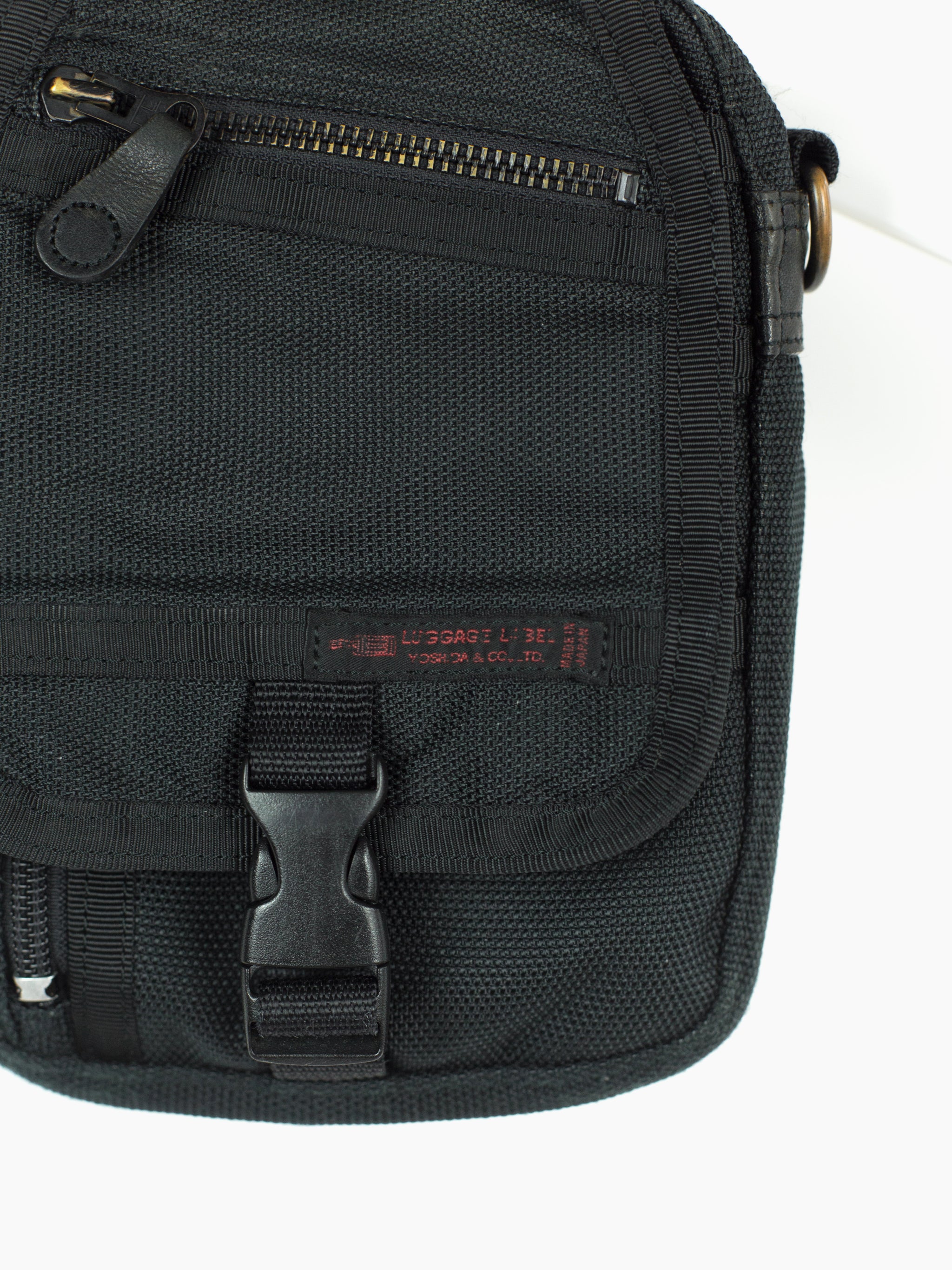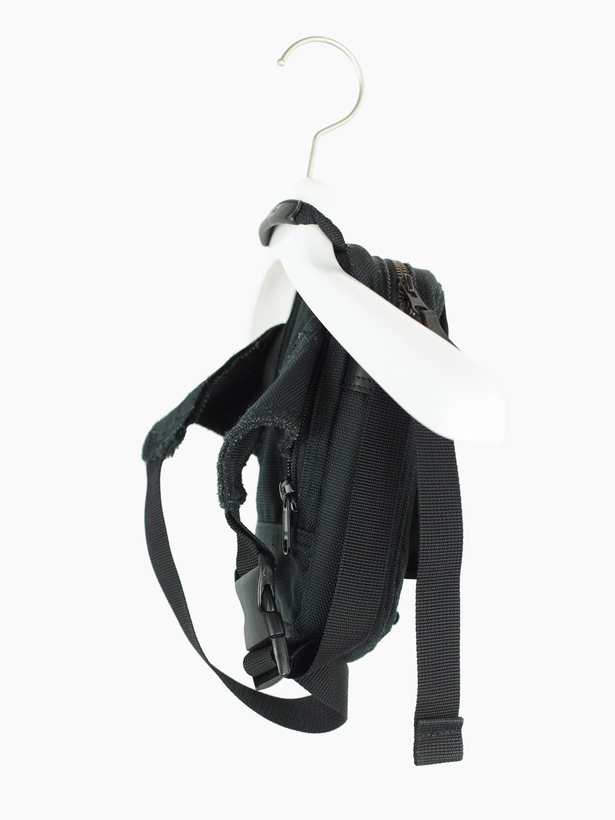 Vintage Porter Luggage Label belt bag, features multiple compartments and dividers, including clear plastic-faced front flap with opposite-side zippered opening, double-zipped top entry main compartment, side-entry zip pocket and 4 tiered stash pockets underneath the flap. The backside features two zippered openings that reveal the adjustable waist belt strap which can be deployed or stored. Finished with top leather-bound carry handle and two d-rings at the side for strap attachment.