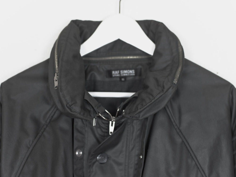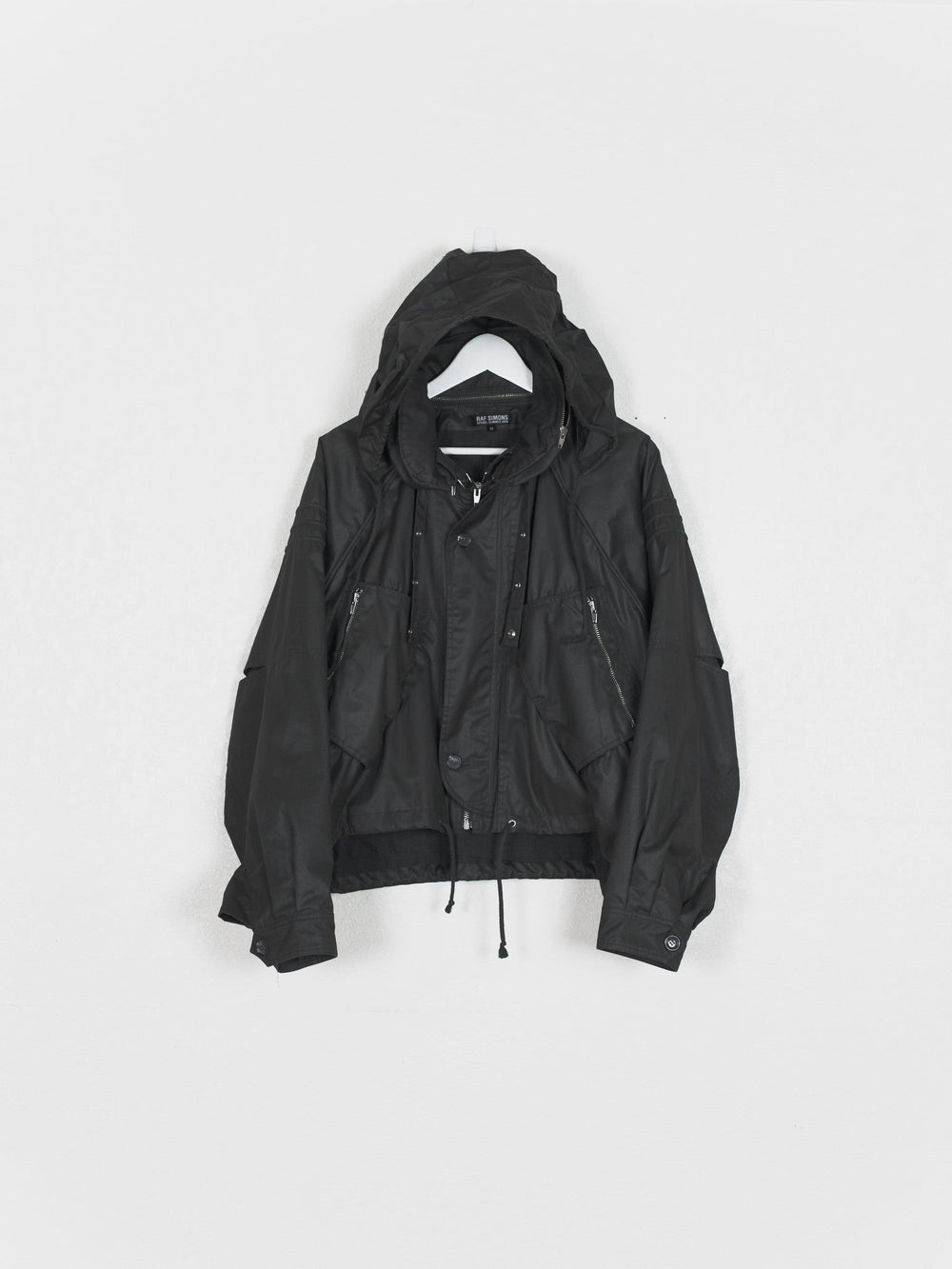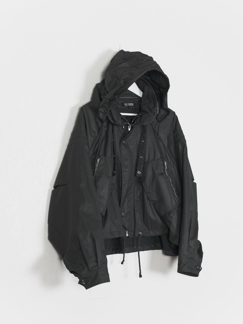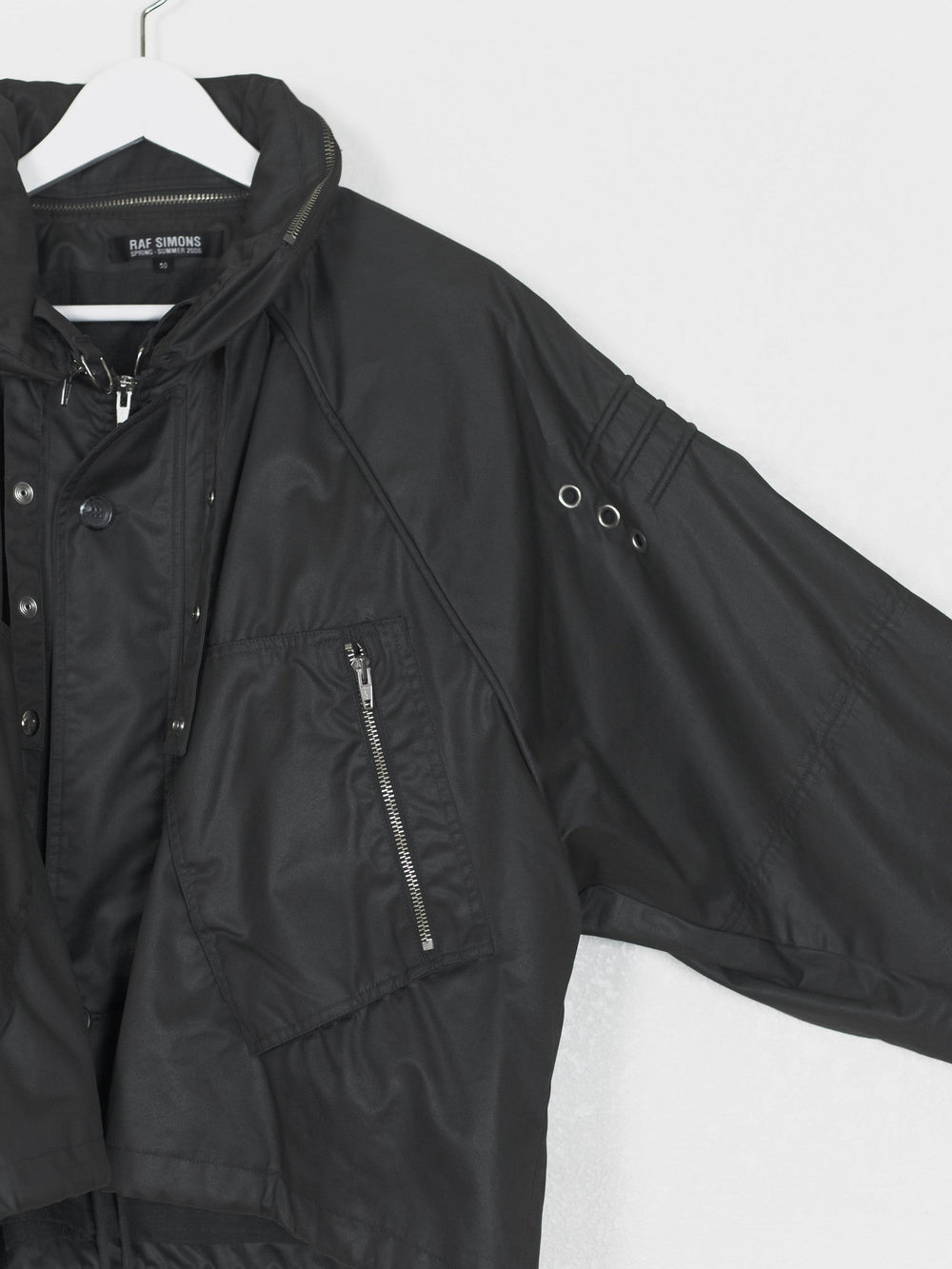 One of Raf's most iconic jackets in black. Amazing cut and construction, with raglan shoulders and dolman sleeves with articulated cutouts and overlaps. Other details include concealable drawstring hood with removable collar, drawstring waist, double wind flap, two front zip pockets, two hidden front seam pockets, resin cotton outer with cotton inner liner and cupro lined sleeves, and internal chest pocket.