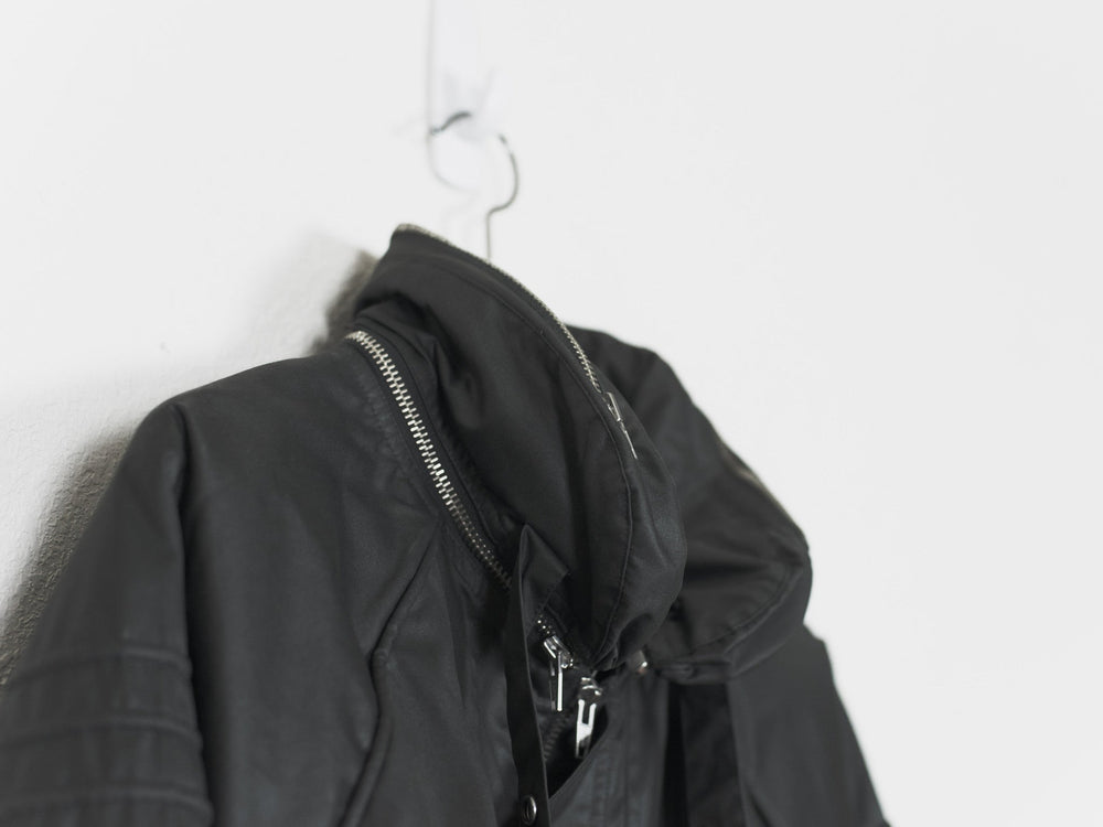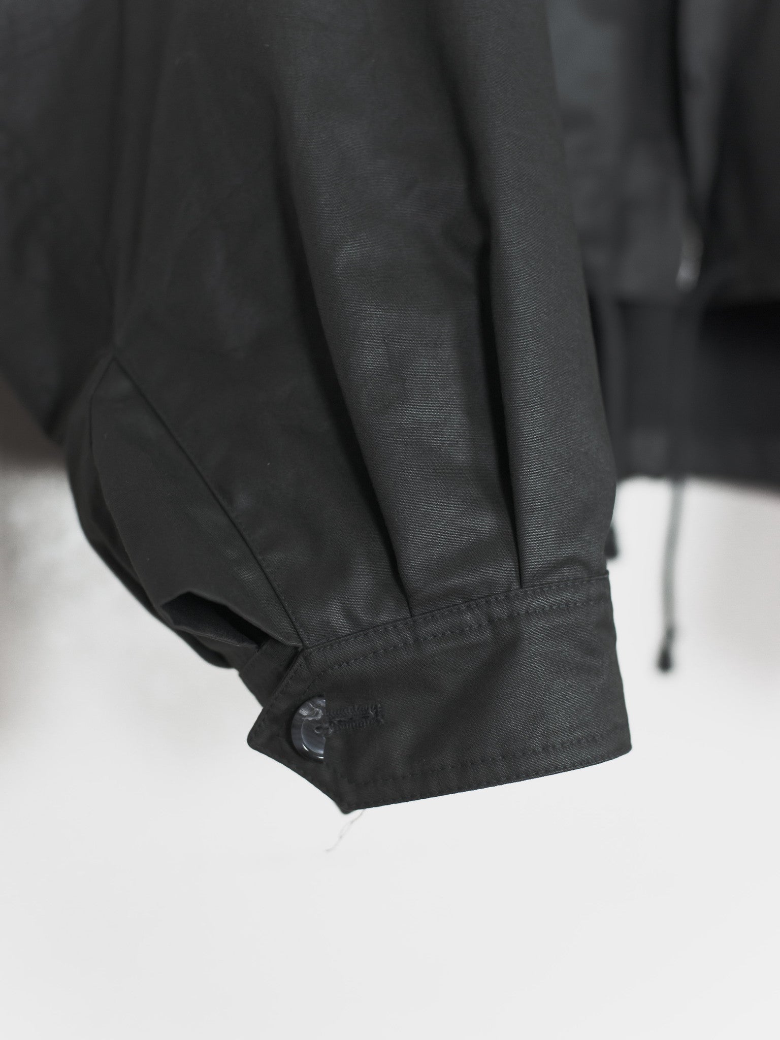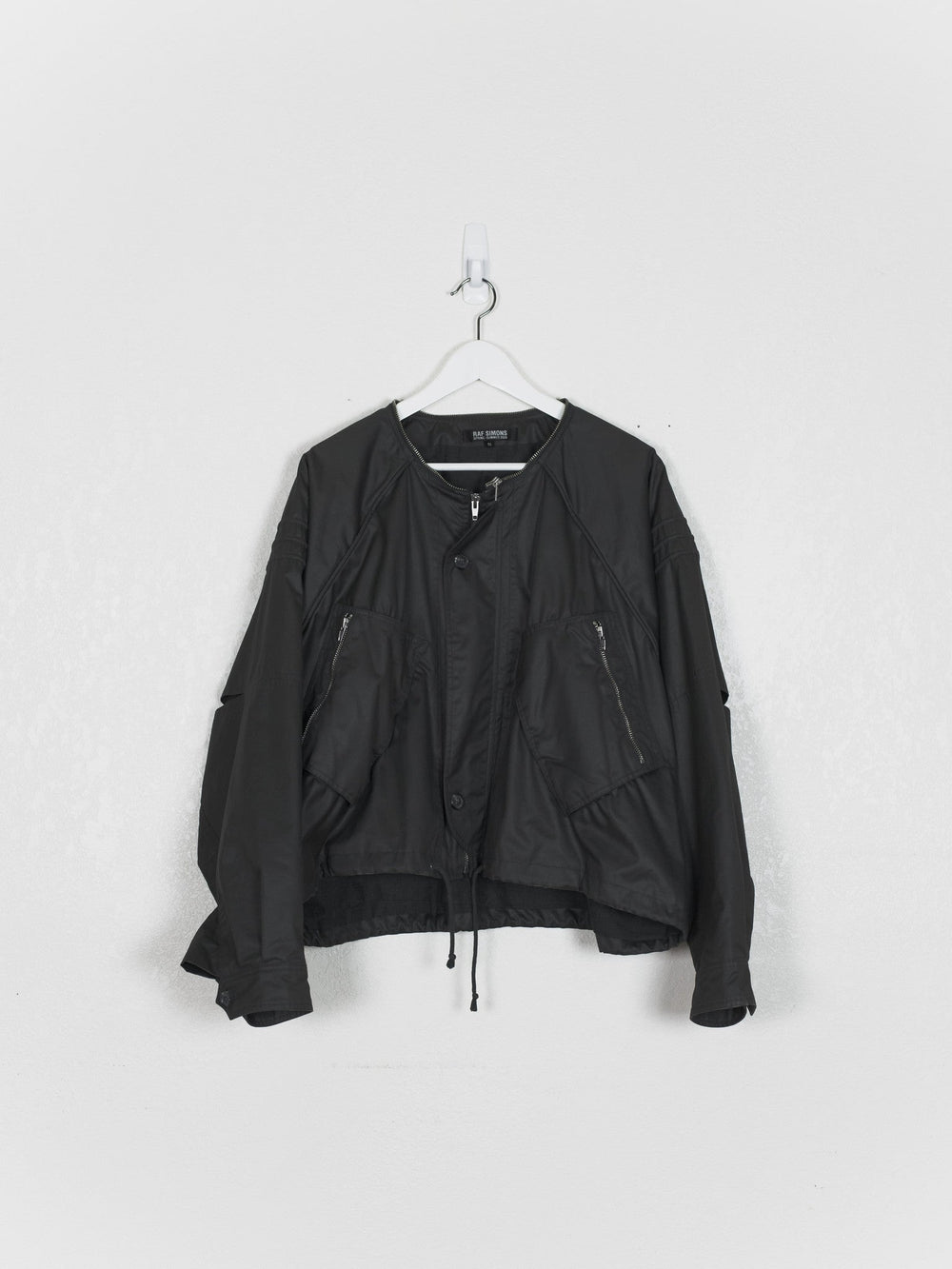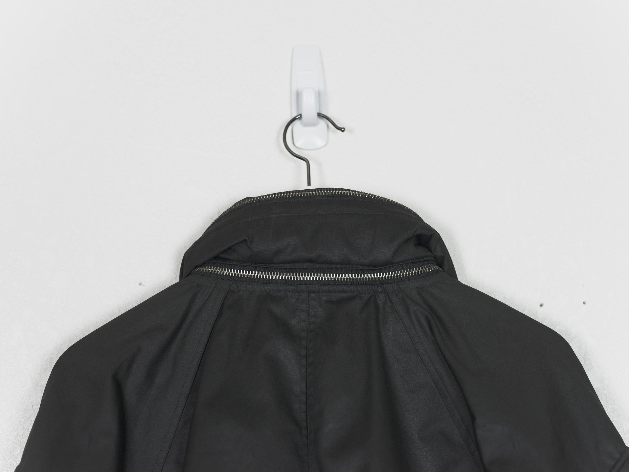 One of Raf's most iconic jackets in black. Amazing cut and construction, with raglan shoulders and dolman sleeves with articulated cutouts and overlaps. Other details include concealable drawstring hood with removable collar, drawstring waist, double wind flap, two front zip pockets, two hidden front seam pockets, resin cotton outer with cotton inner liner and cupro lined sleeves, and internal chest pocket.