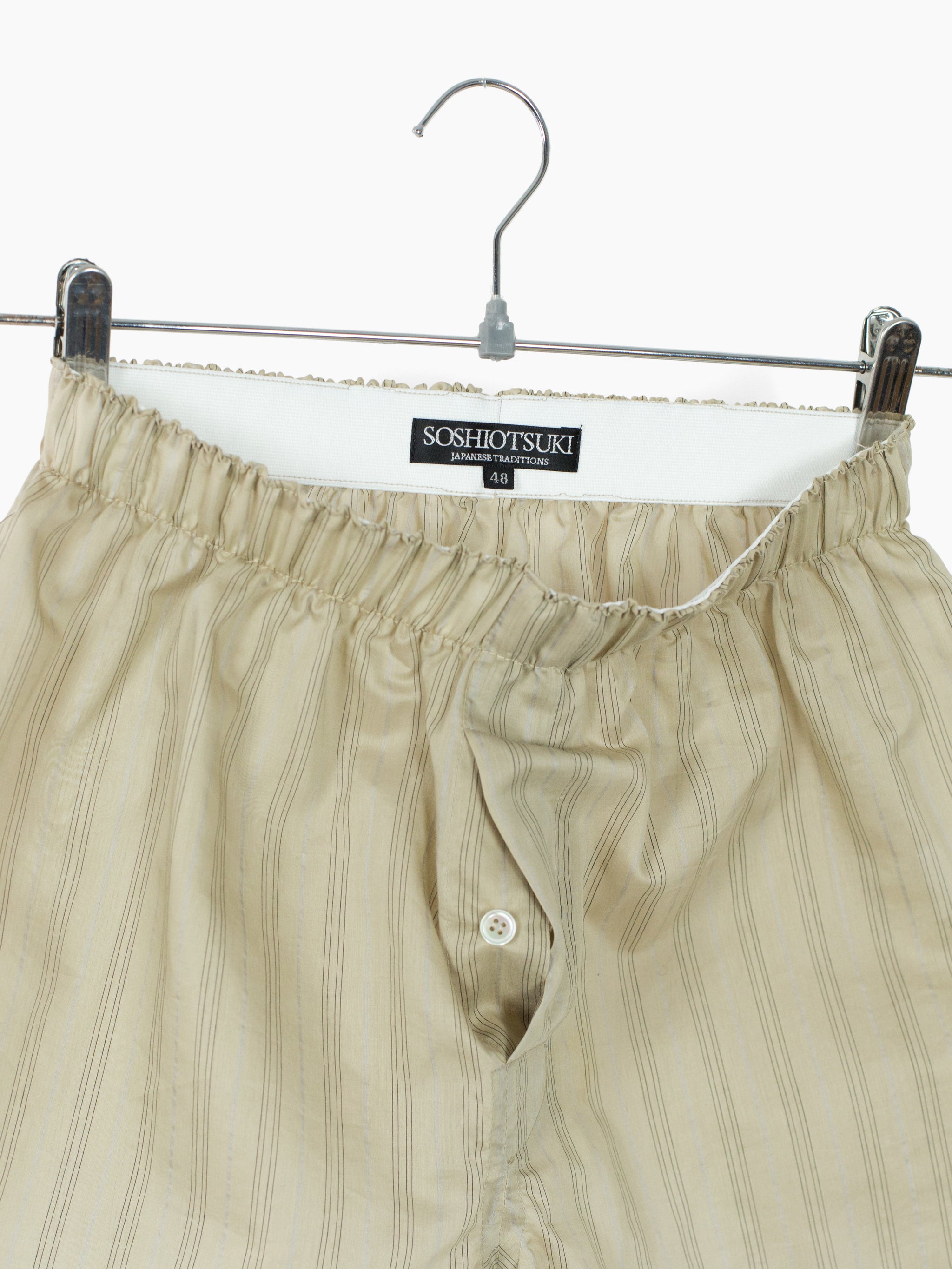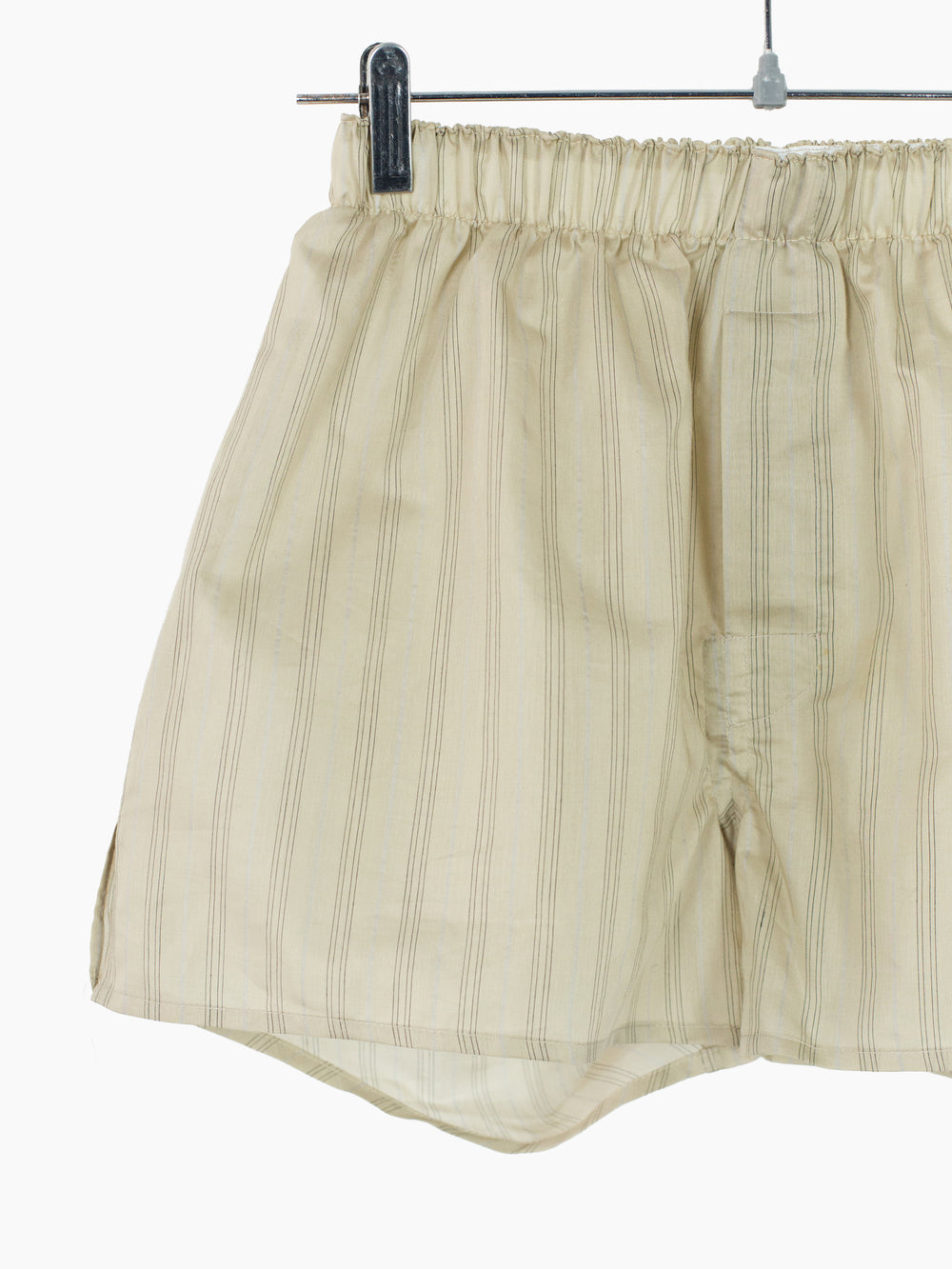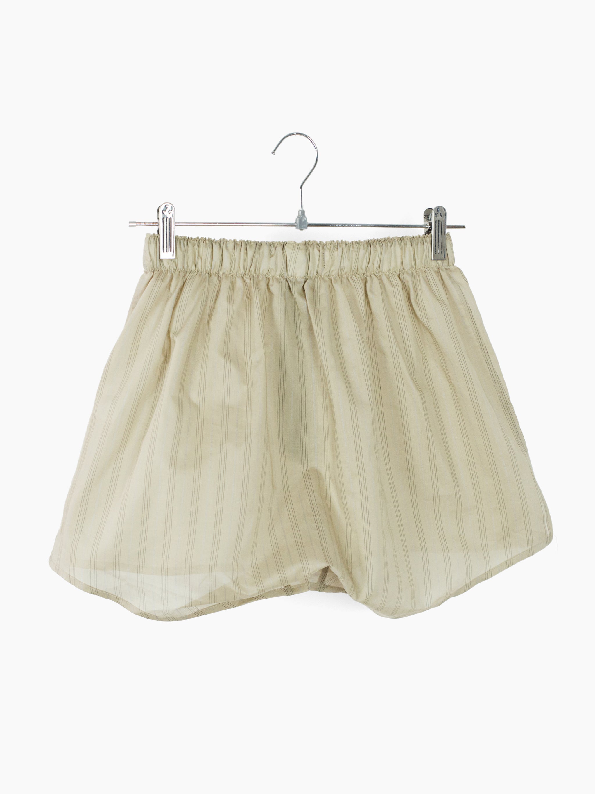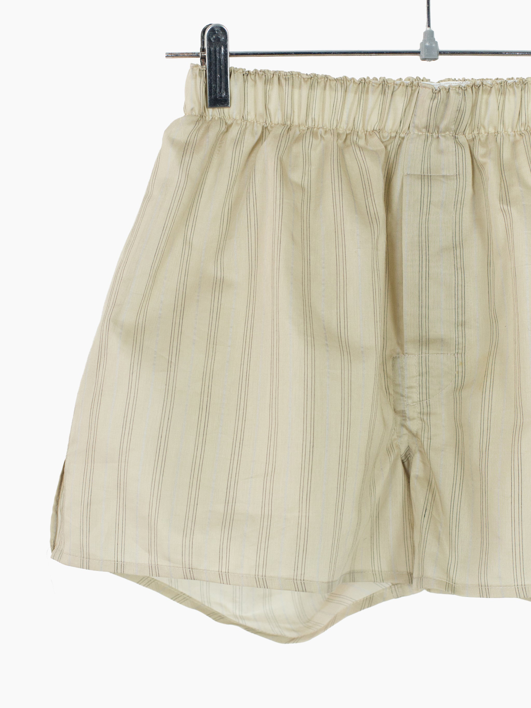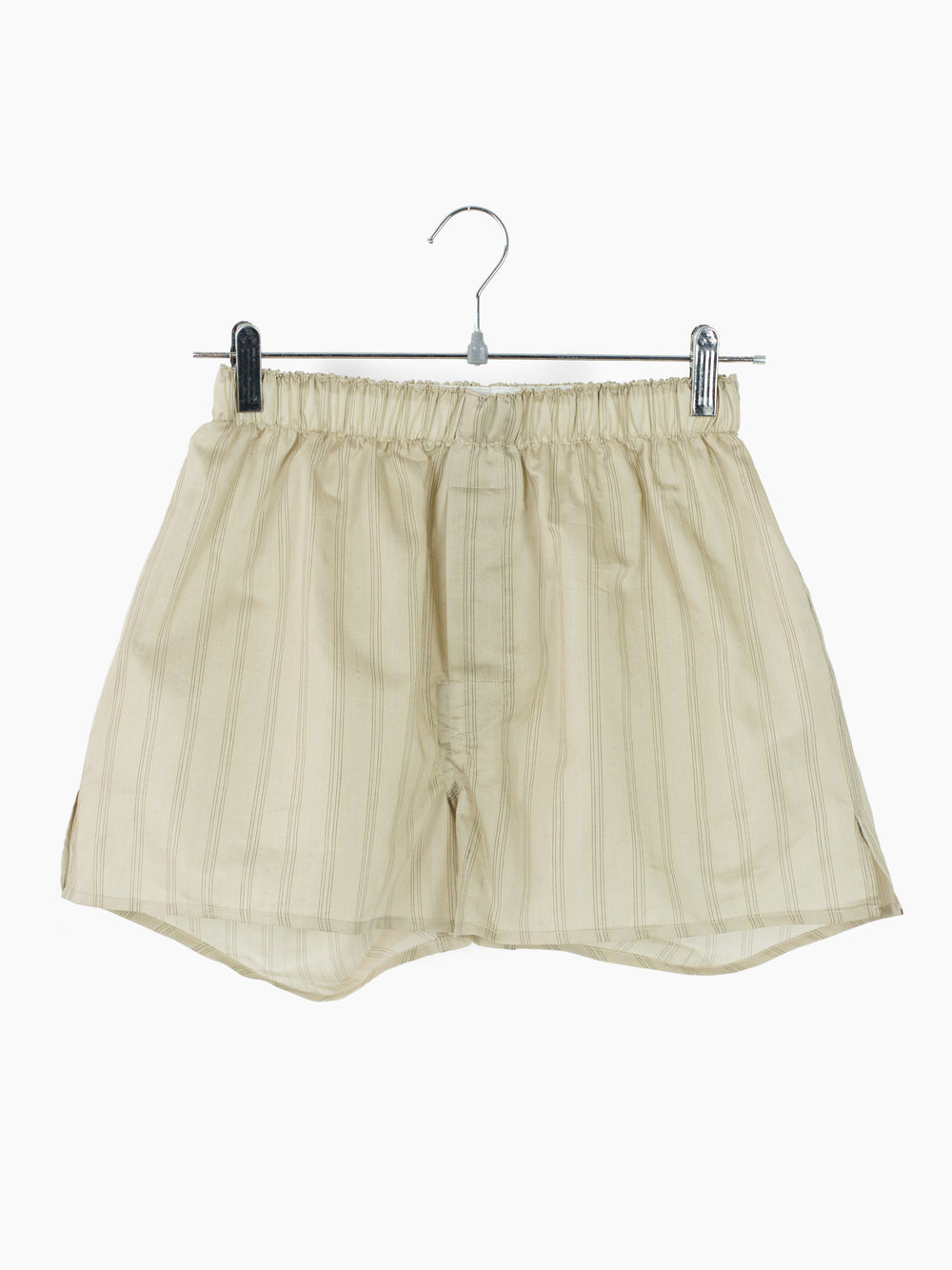 Elasticated waist boxer shorts cut in vintage sheer cotton lawn. Single button fly and one-piece back construction. Side slits for freedom of movement.