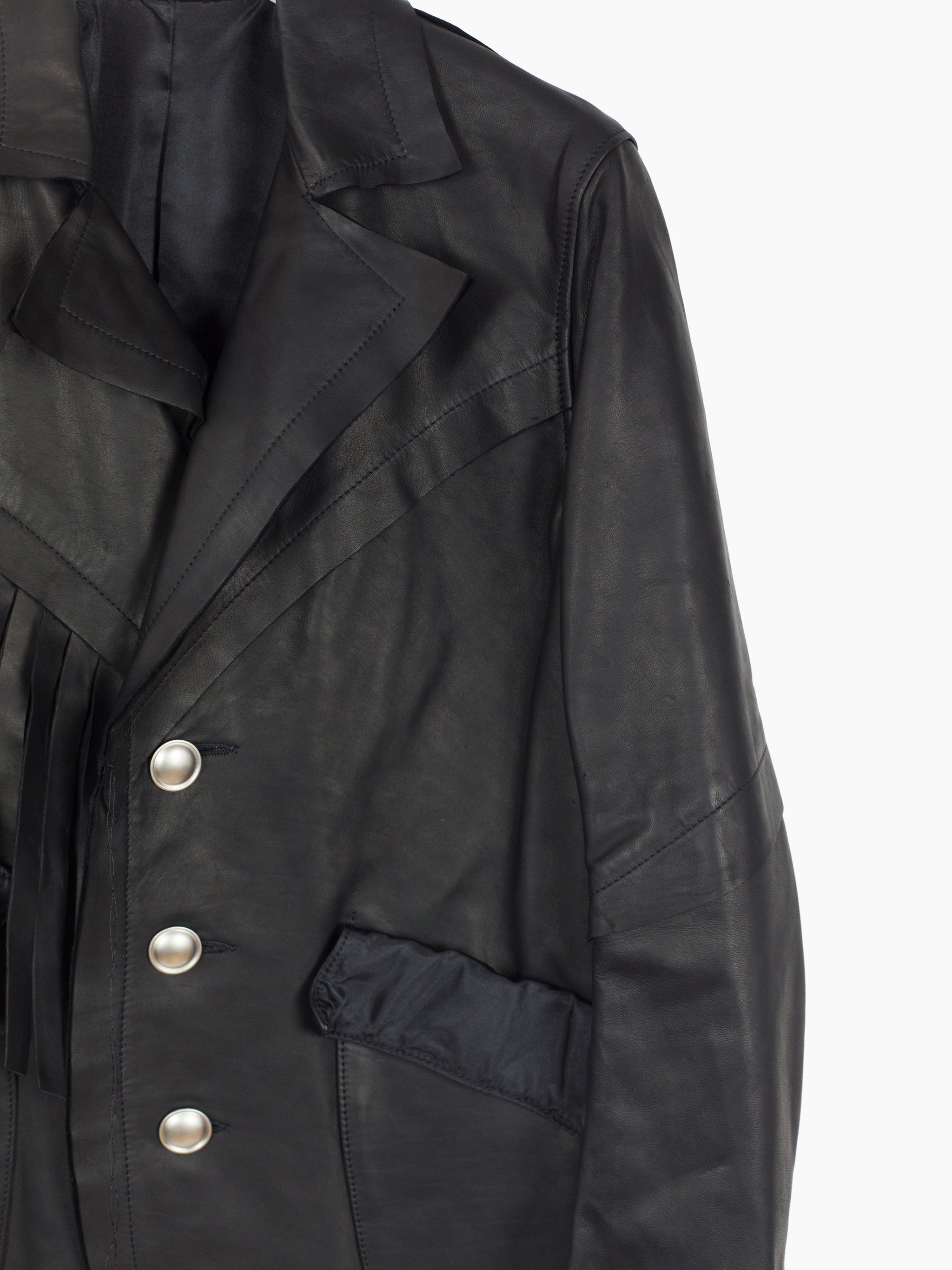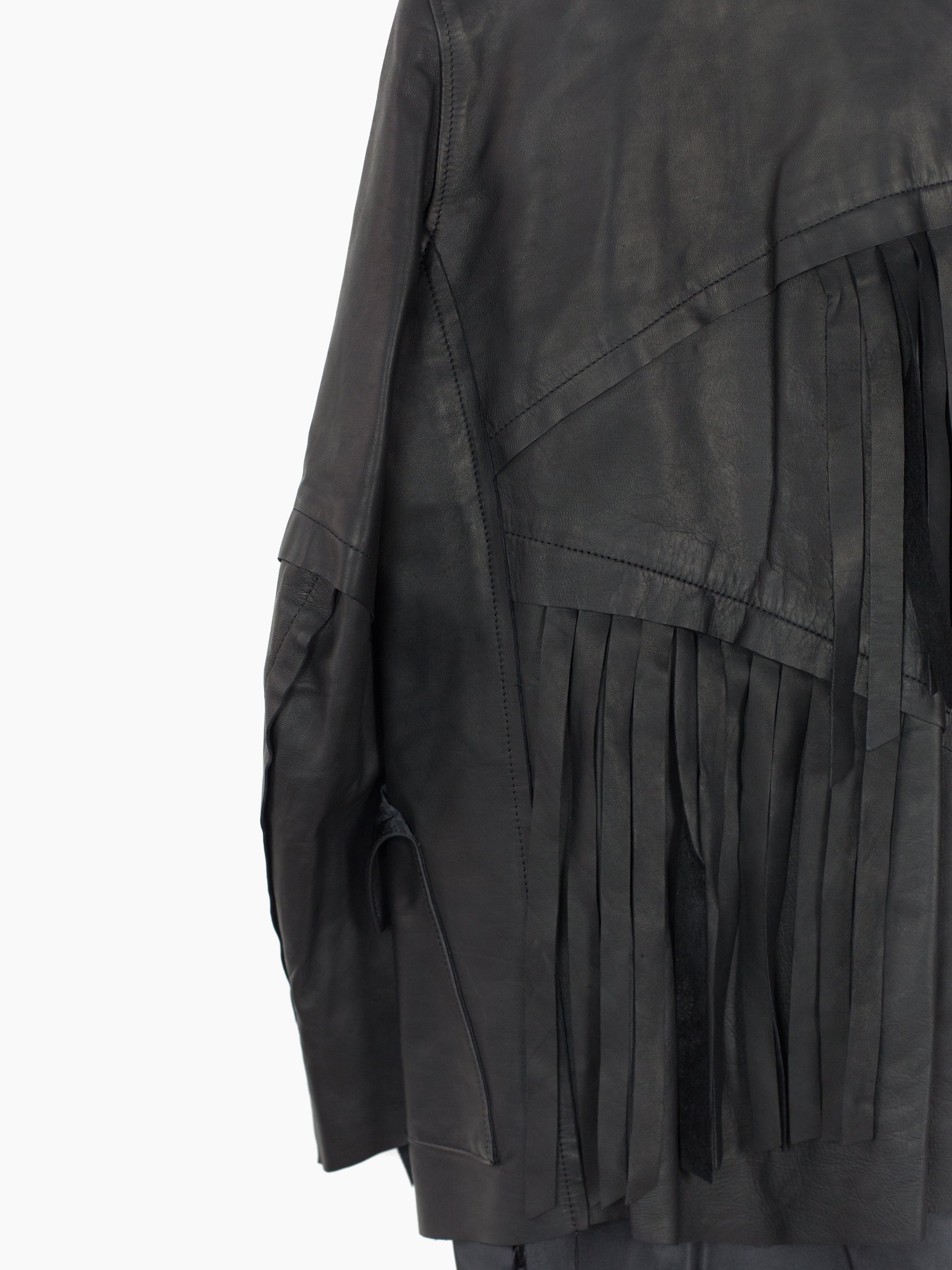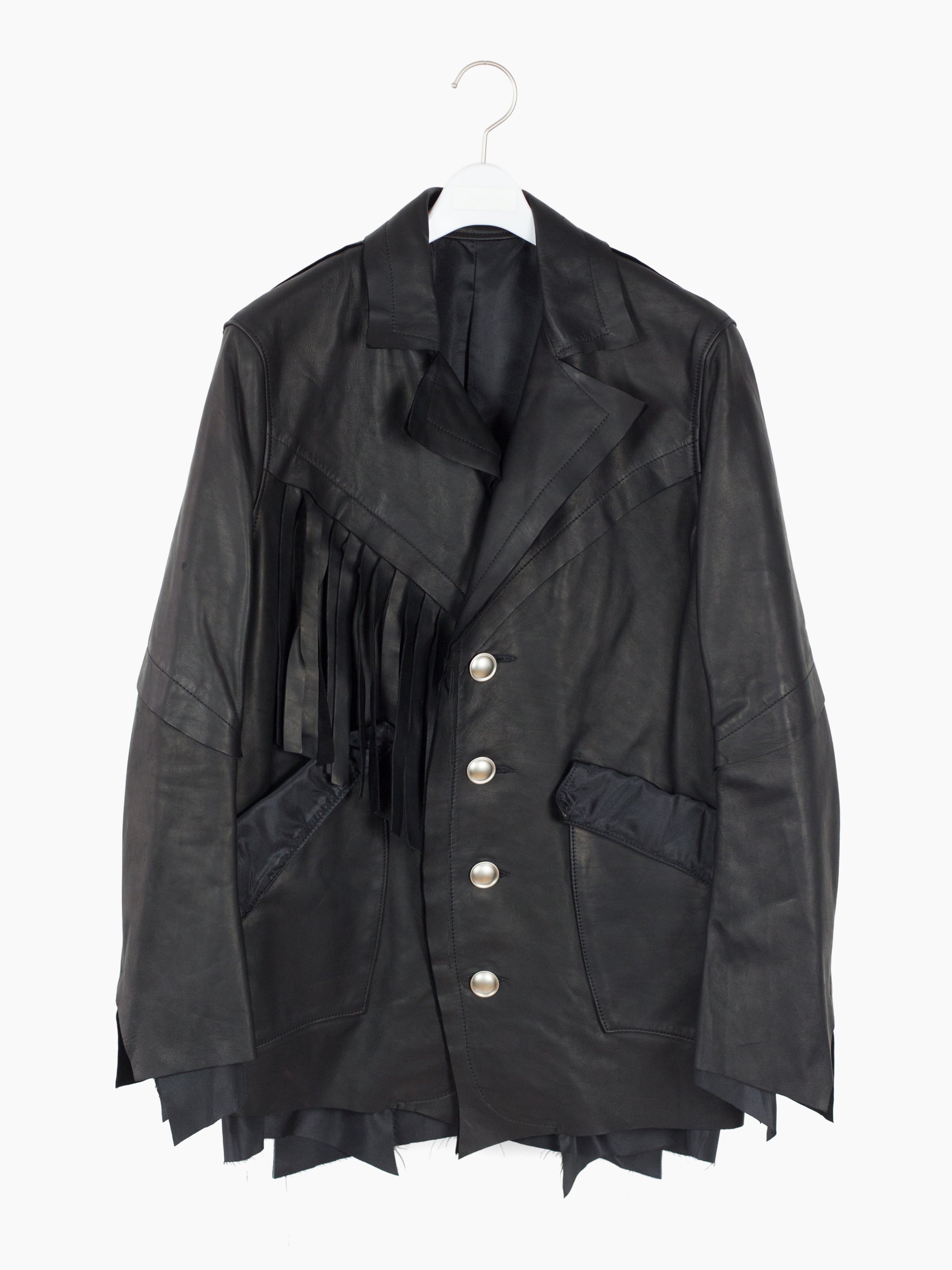 Deconstructed Sulvam version of a vintage pioneer/western coat, cut in scarred horse leather with asymmetrically placed fringe along the front and back body. Center front button closure accentuates the subtle curved front edge of the body panels. Chunky lapels with raw, pointed edge. Fully silk-hand polyester lined left raw and unattached at hem and cuffs for a distressed, layered effect. Finished with two sizeable patch waist pockets that feature draped faux flap detail and two inner welted chest pockets.