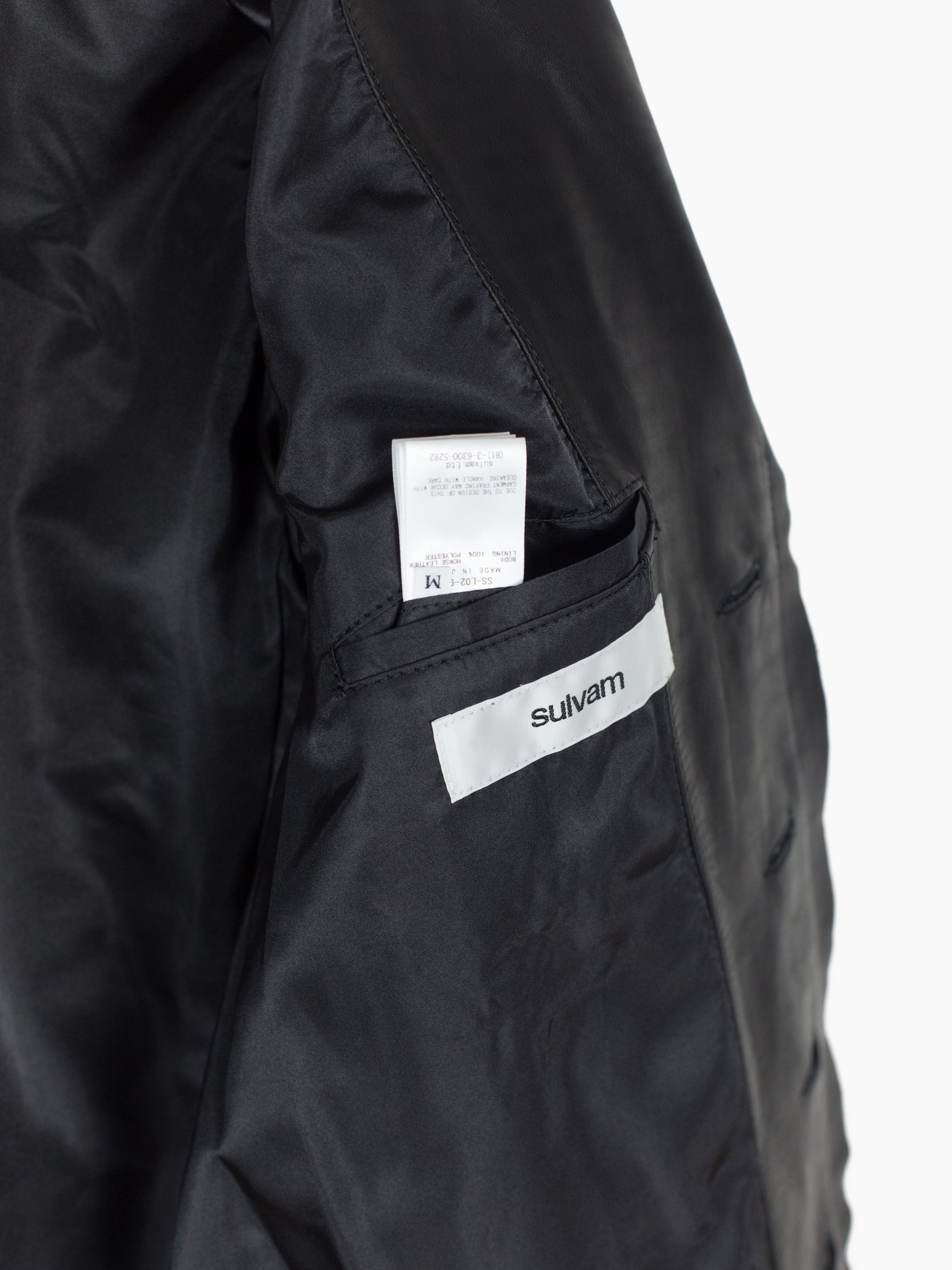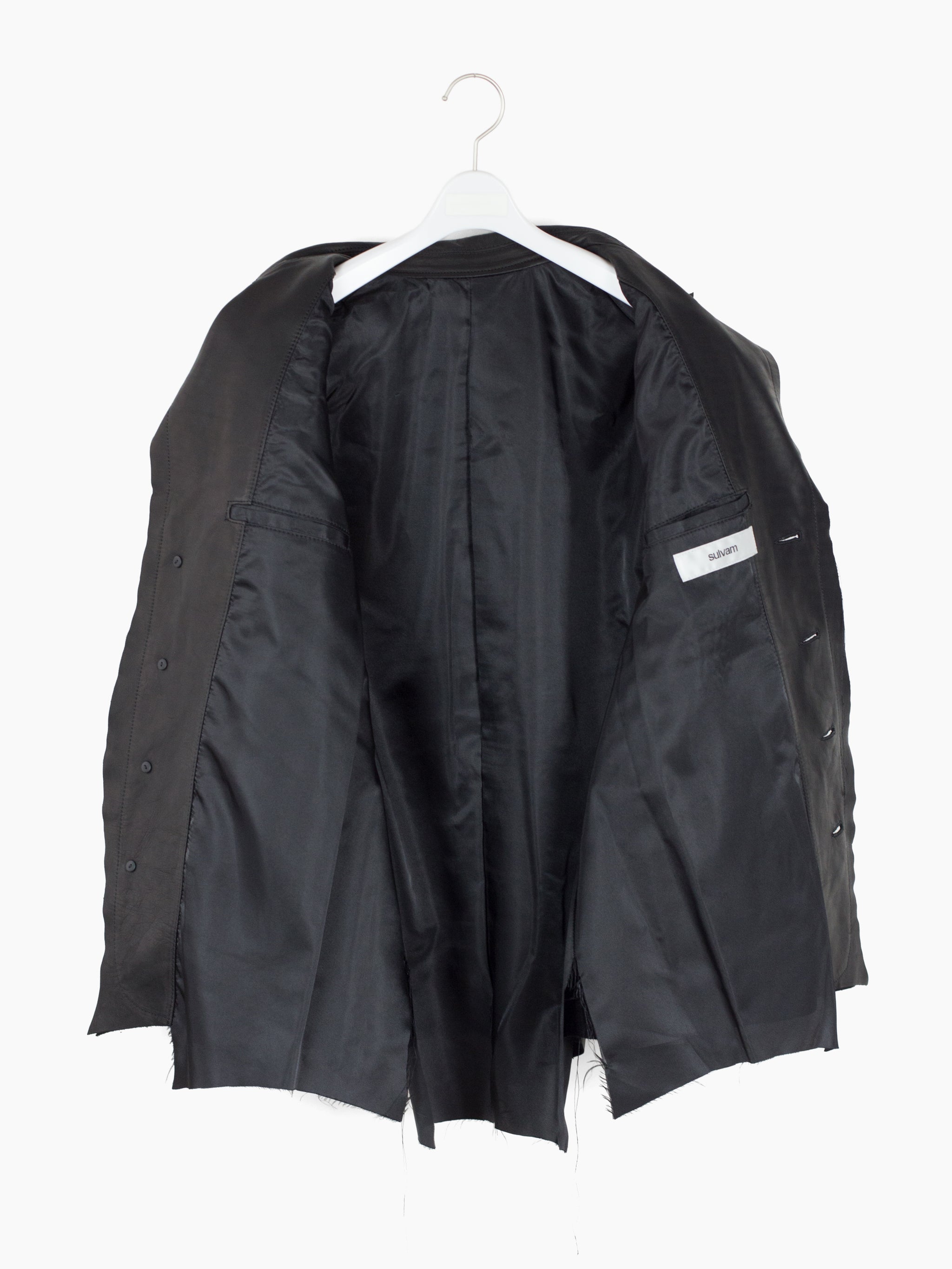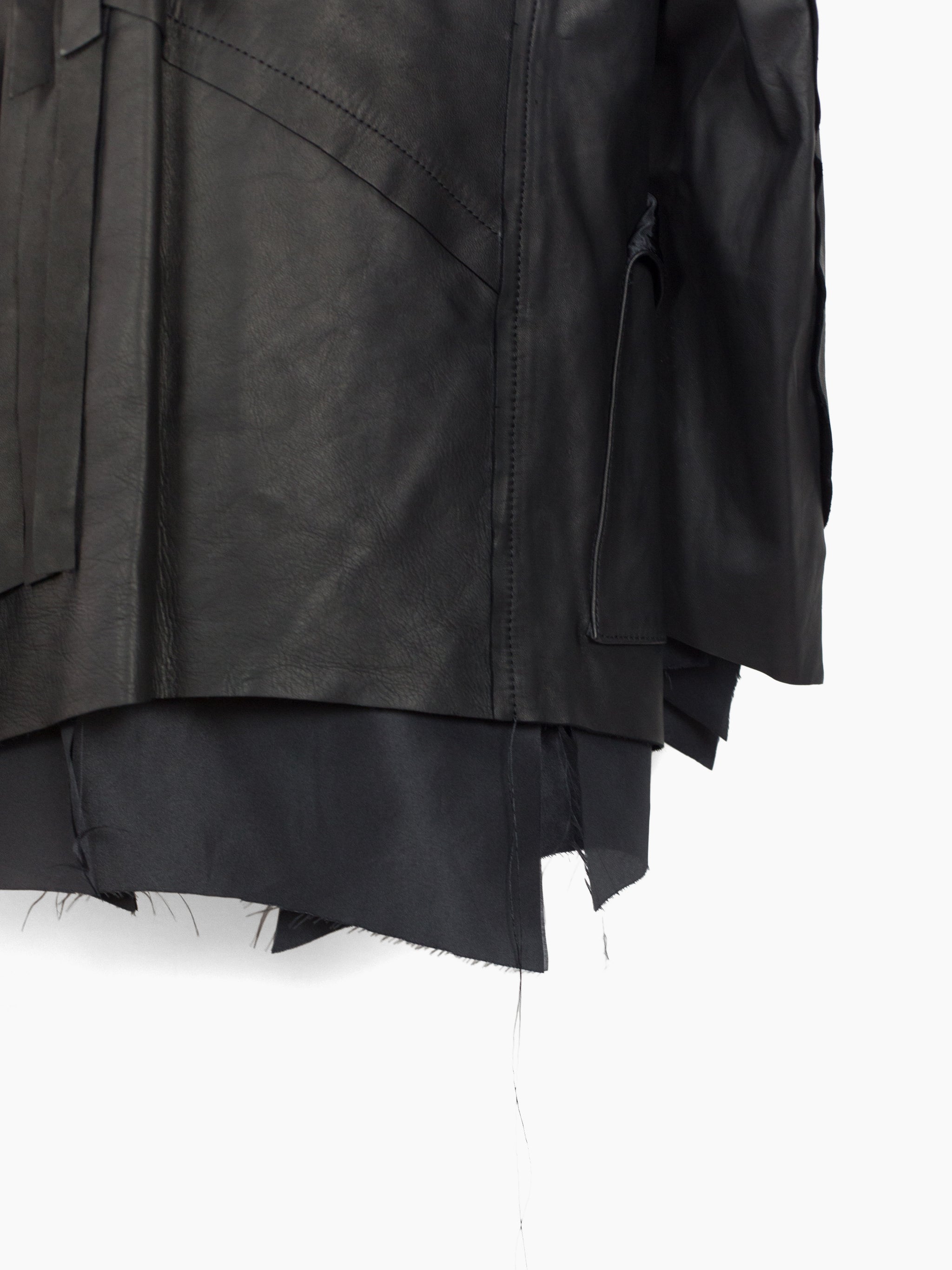 Deconstructed Sulvam version of a vintage pioneer/western coat, cut in scarred horse leather with asymmetrically placed fringe along the front and back body. Center front button closure accentuates the subtle curved front edge of the body panels. Chunky lapels with raw, pointed edge. Fully silk-hand polyester lined left raw and unattached at hem and cuffs for a distressed, layered effect. Finished with two sizeable patch waist pockets that feature draped faux flap detail and two inner welted chest pockets.