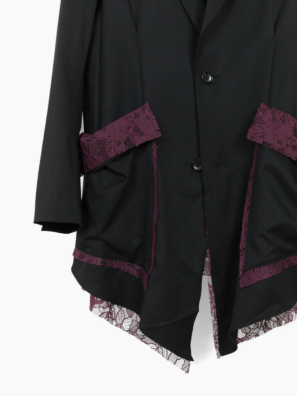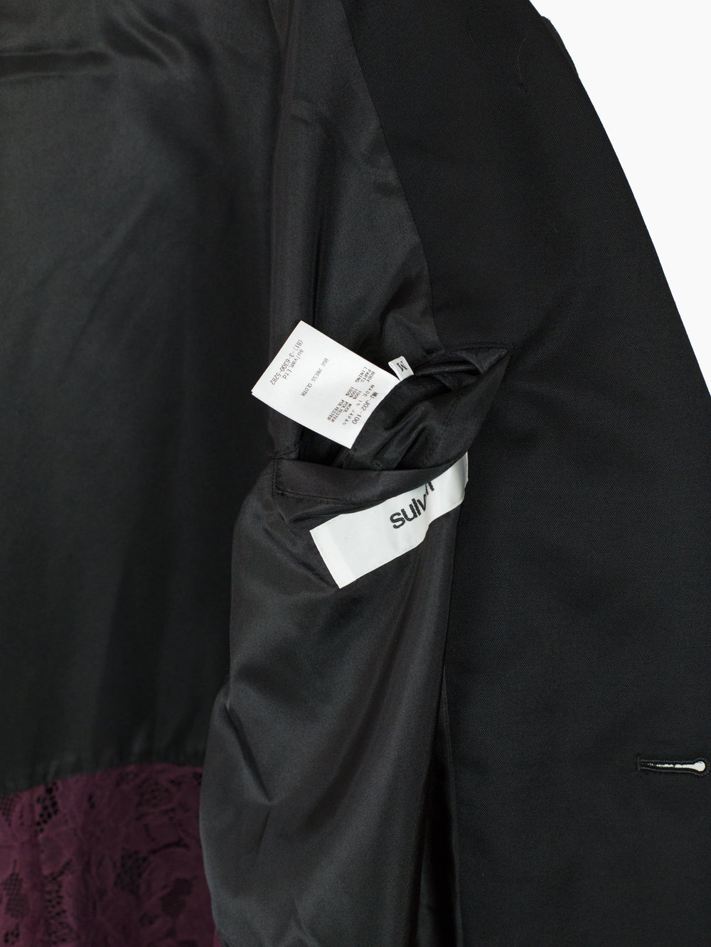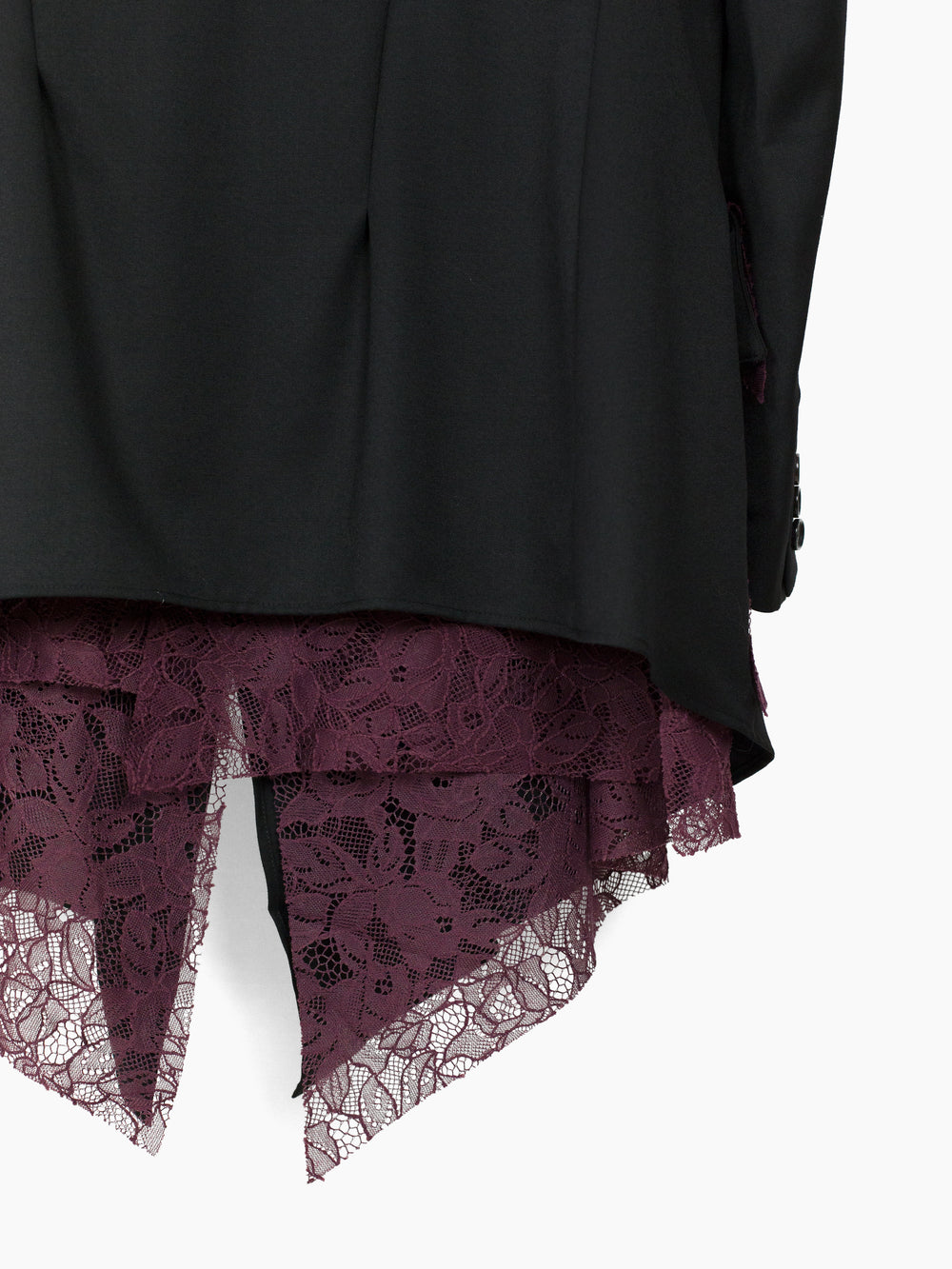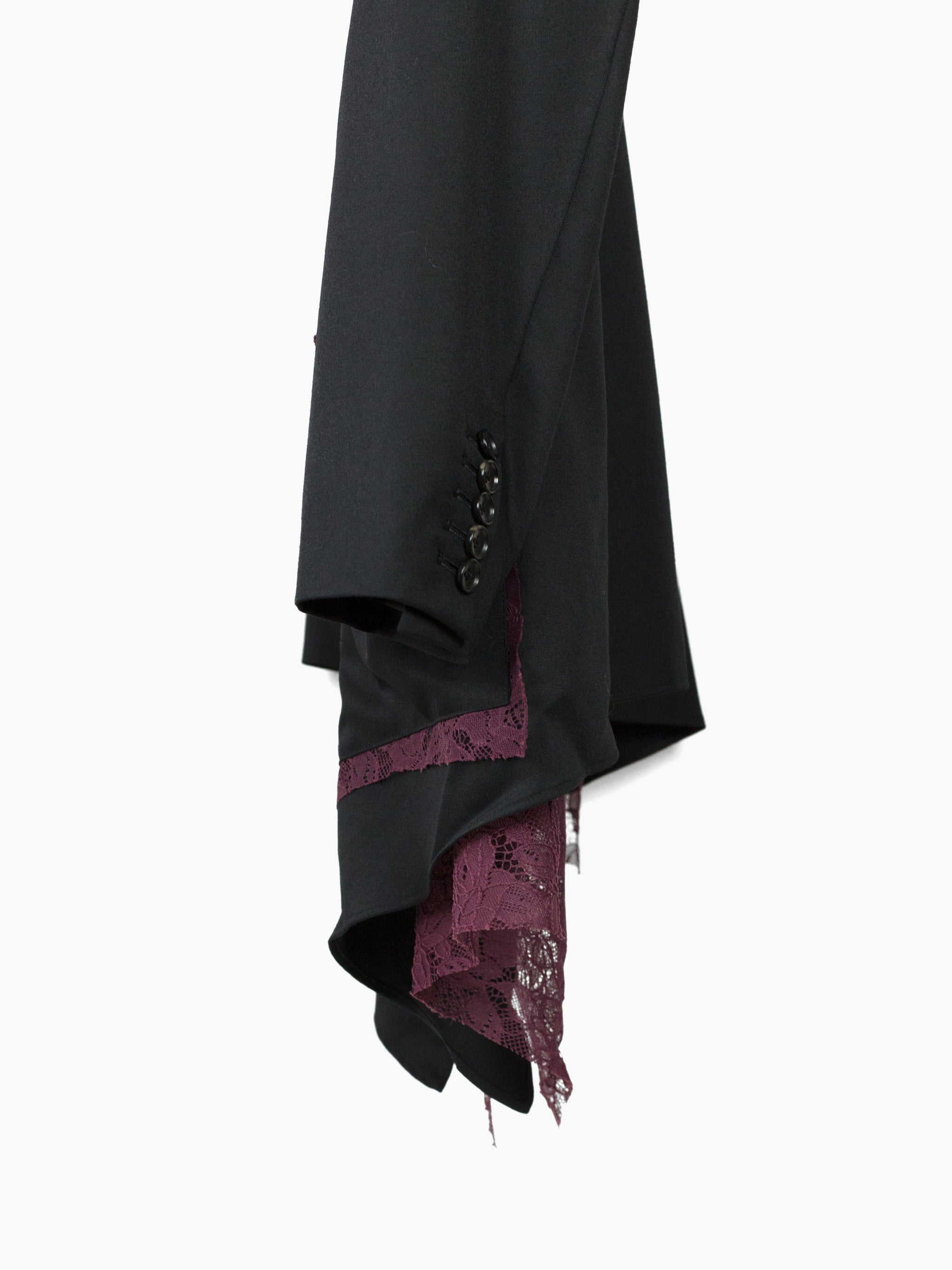 Imbalanced oversized suit jacket with layered lace trim and lining. Structured, lightly padded shoulder and classic black wool gabardine anchor the garment within suiting tradition while an elongated front and shorter back mimics the look of a jacket hem falling over hands stuffed in trouser pockets--lived phenomena as basis for design and construction.