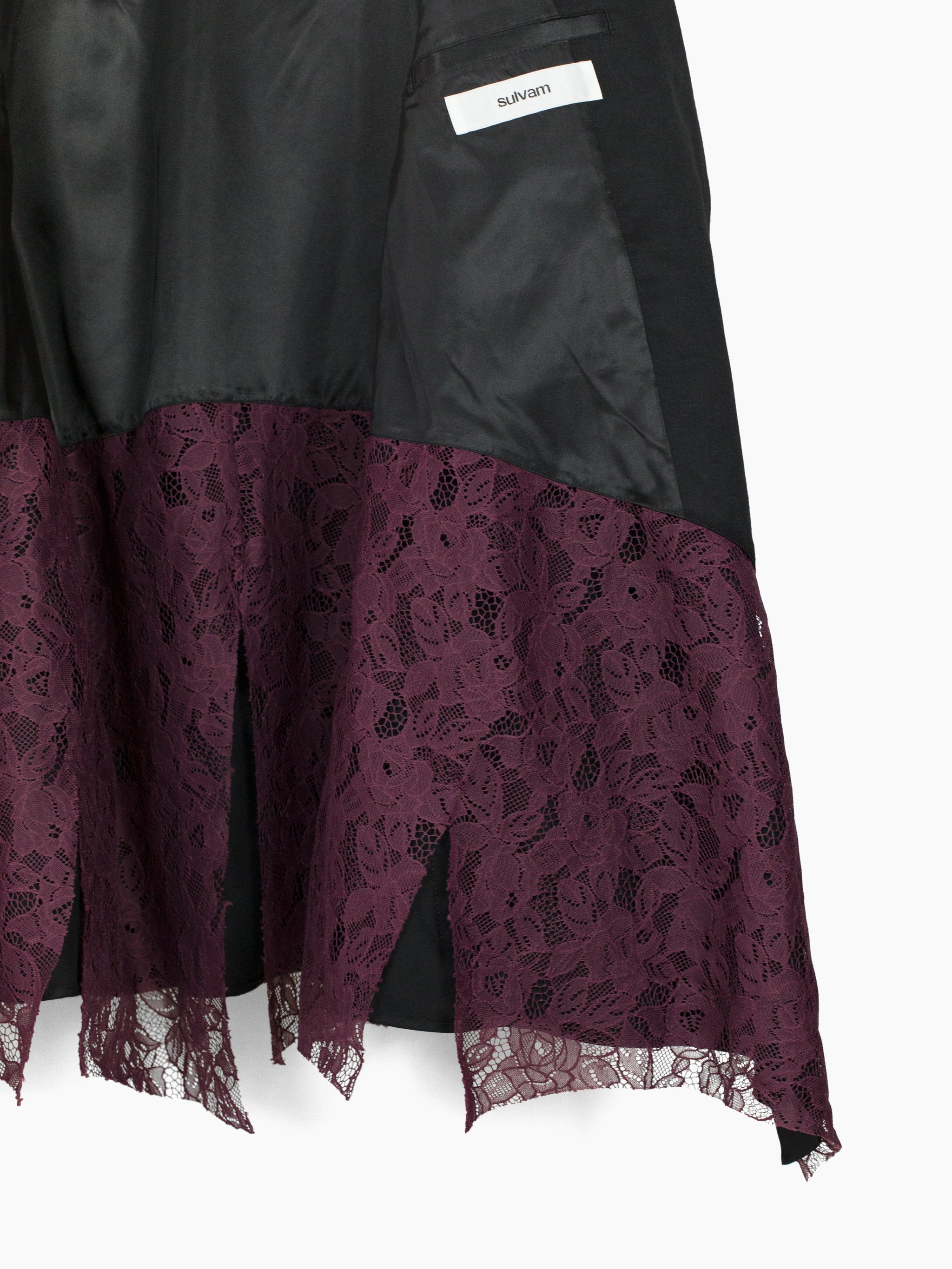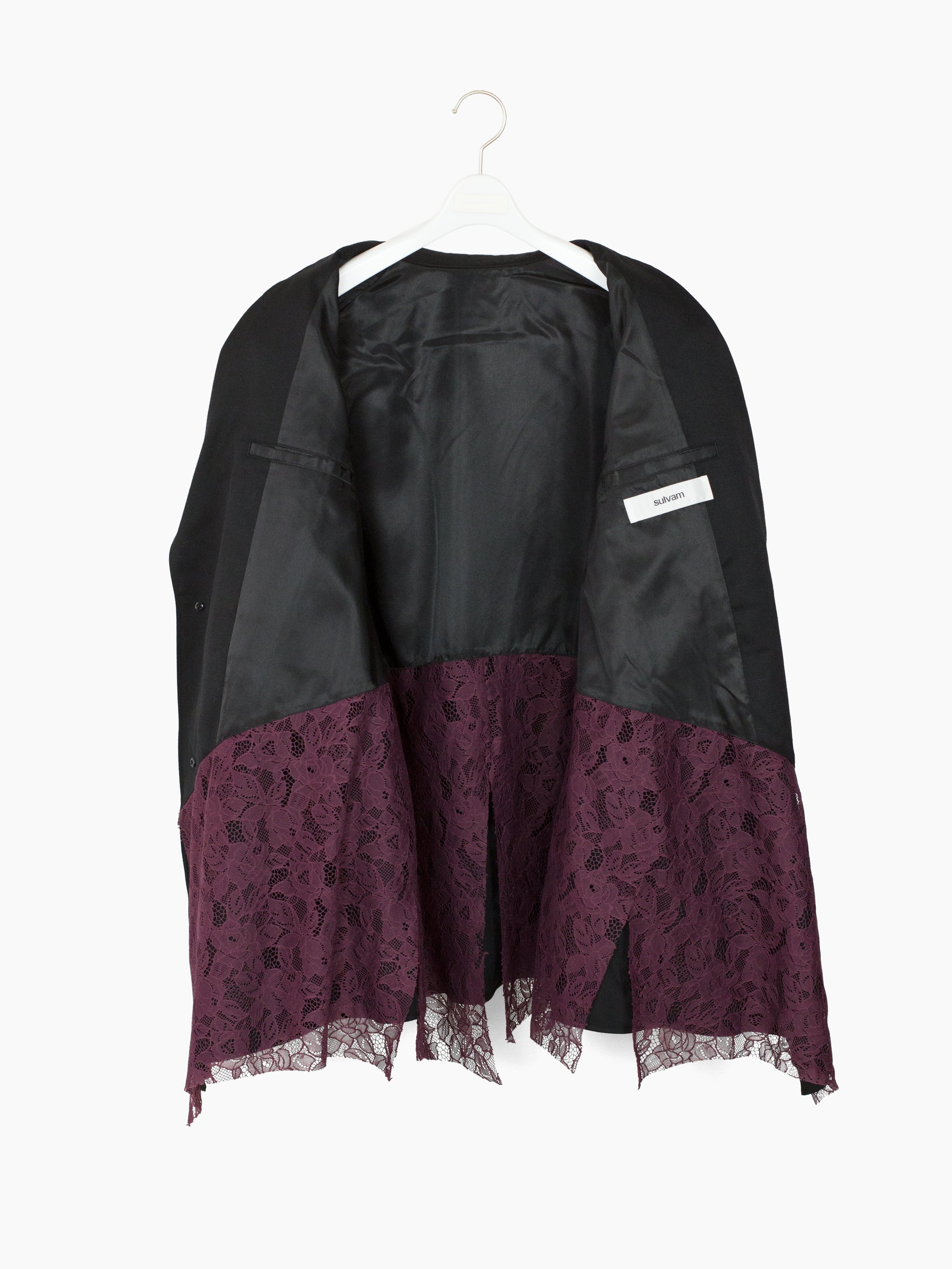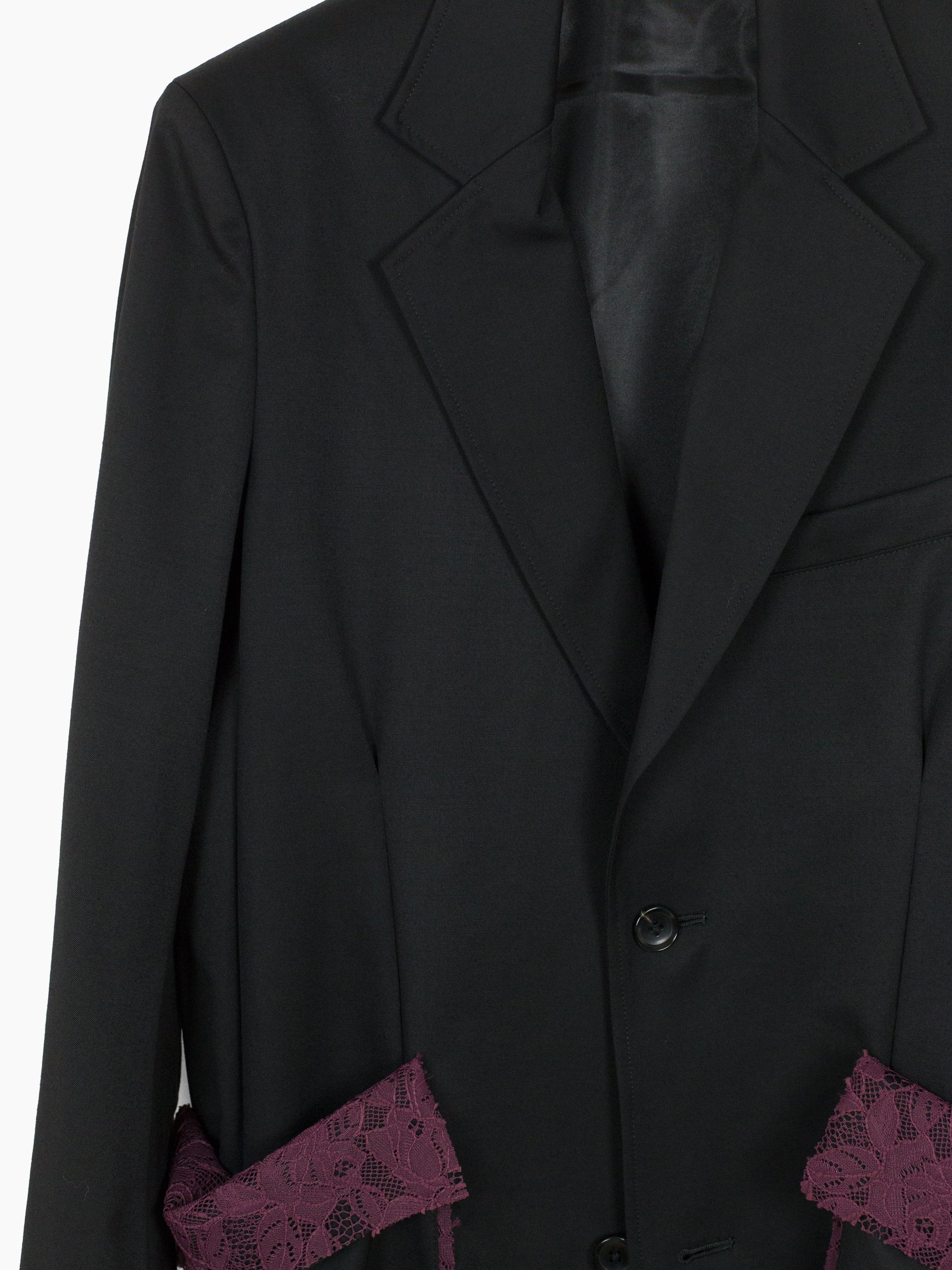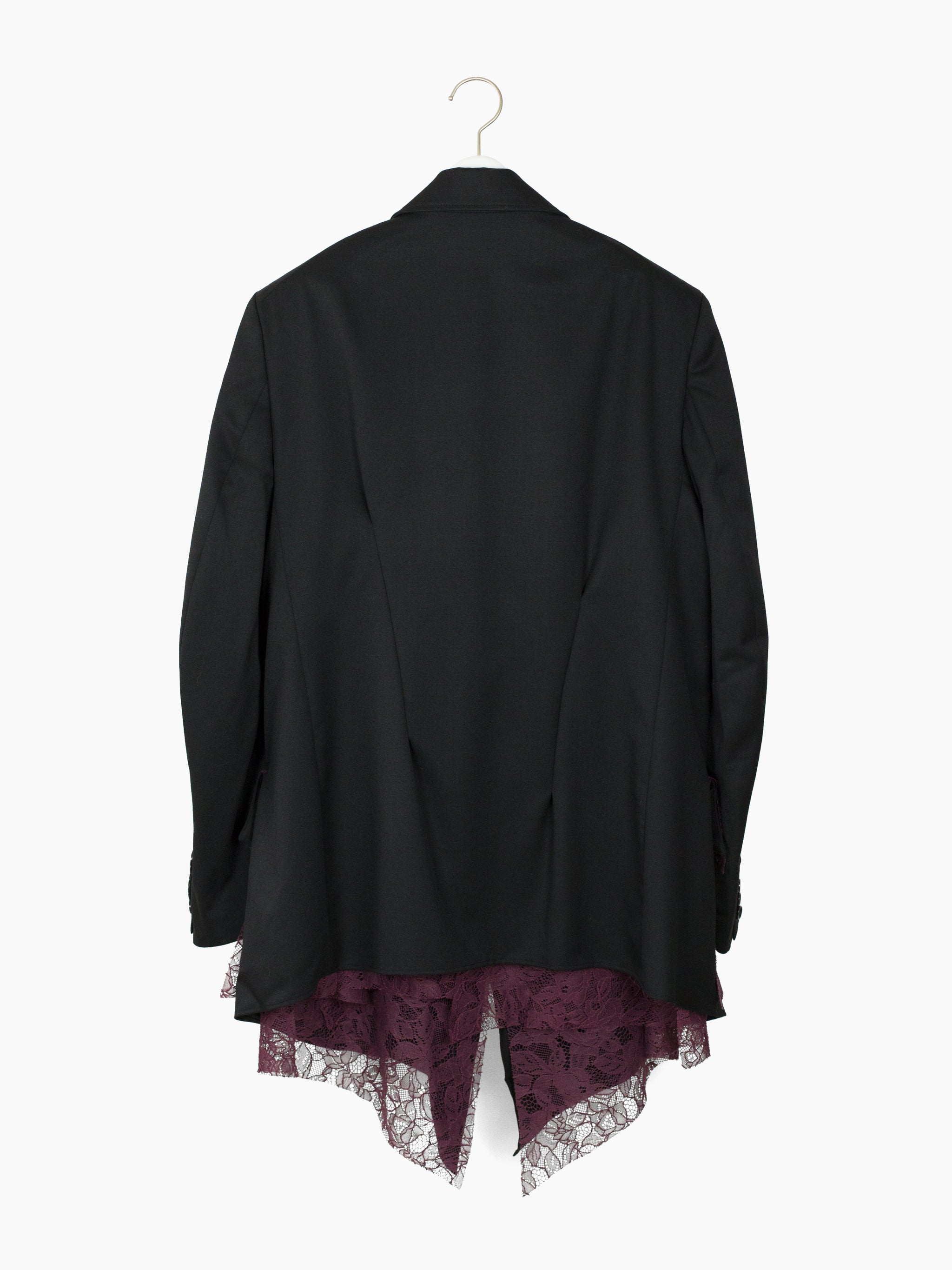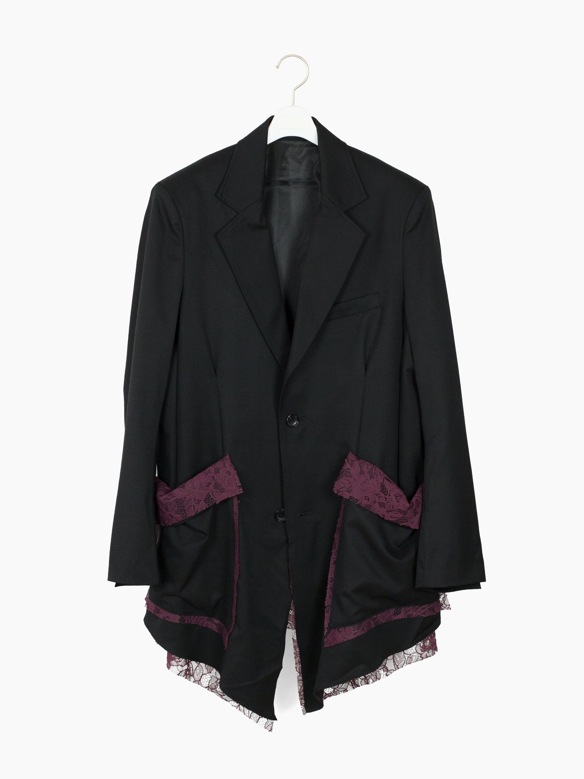 Imbalanced oversized suit jacket with layered lace trim and lining. Structured, lightly padded shoulder and classic black wool gabardine anchor the garment within suiting tradition while an elongated front and shorter back mimics the look of a jacket hem falling over hands stuffed in trouser pockets--lived phenomena as basis for design and construction.