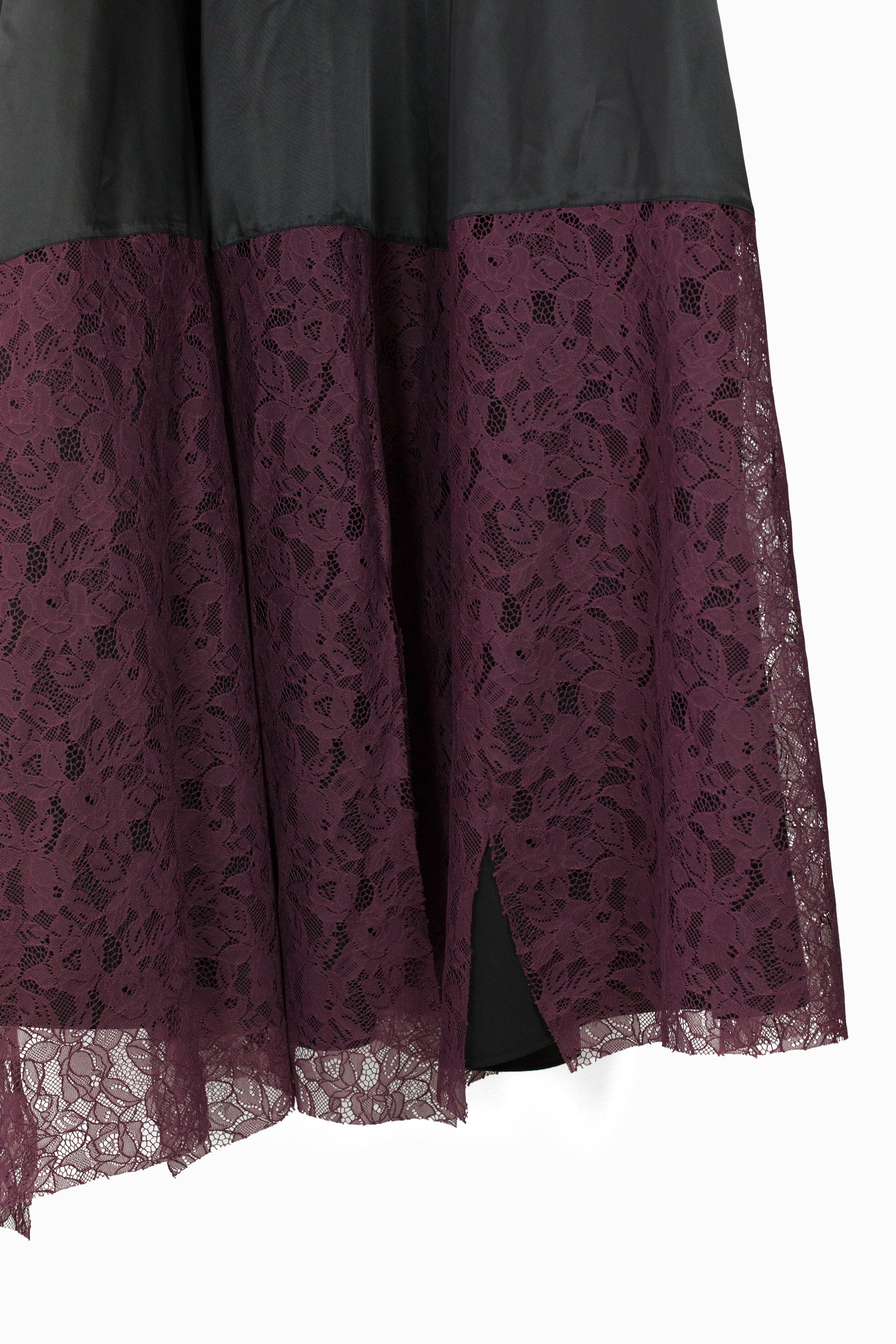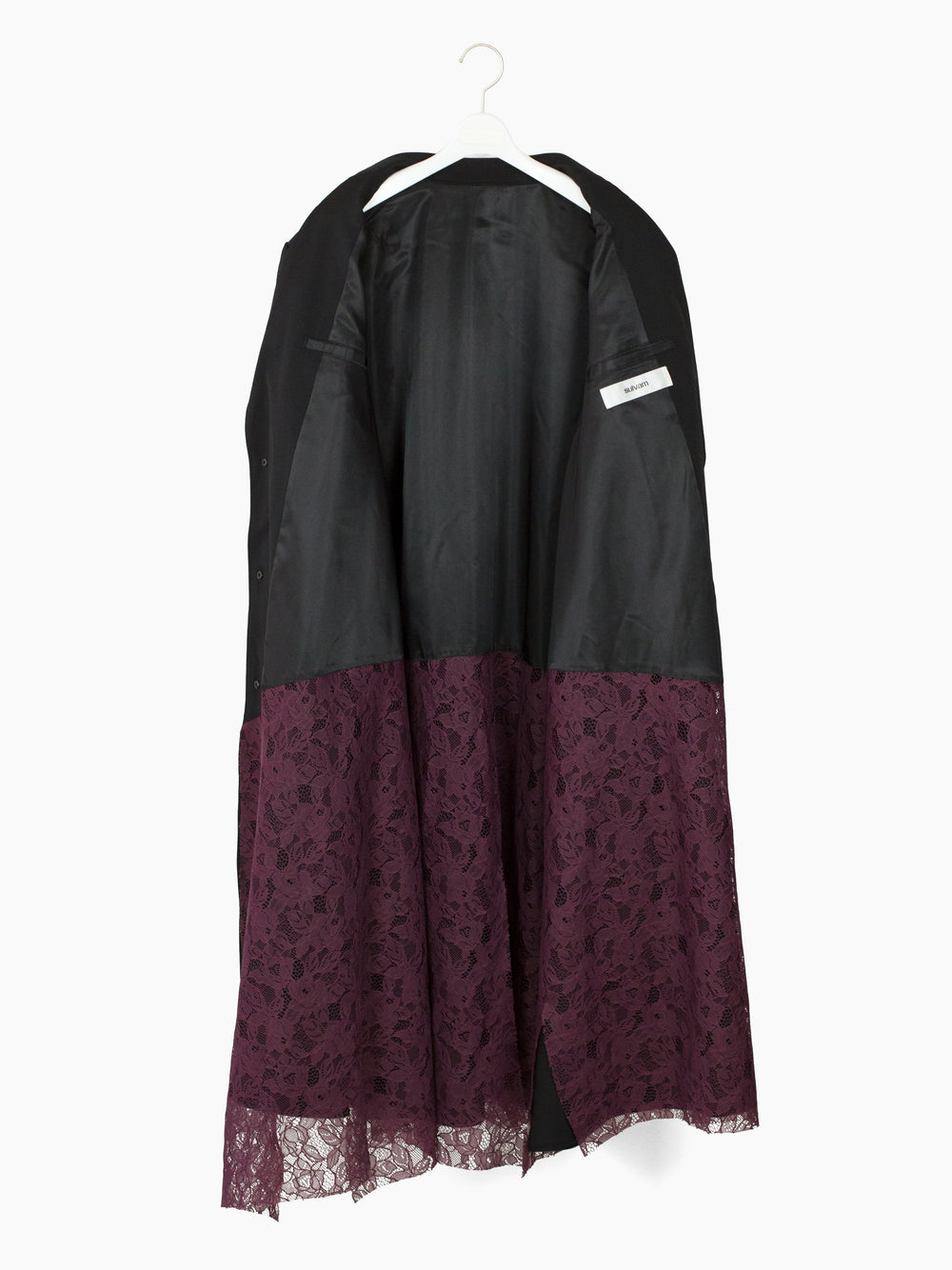 Maxi length chester coat with layered lace trim and lining. Structured, lightly padded shoulder and midweight suiting twill face fabric create a sense of stylistic ambiguity--deceptively light and fluid for a coat, with a surprising mix of formal and playful, masculine and feminine details. It could be described loosely as a tailored robe. It provides the wearer with an immense presence.
